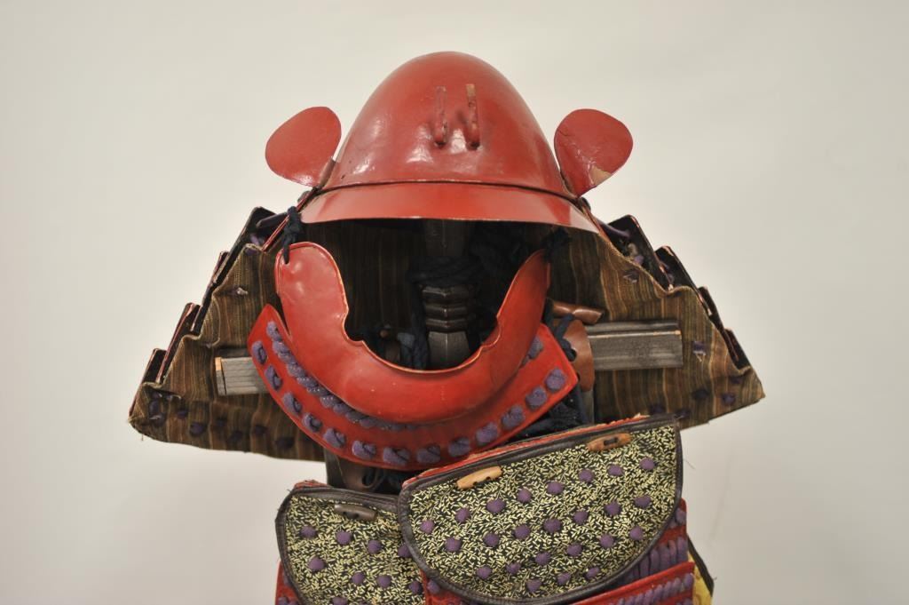 Late Edo period (Last emperor period) suit of Japanese armor. Hardened leather that is painted and joined by cloth stitching with metal chin piece. Good to very good overall condition with normal aging, minor loss ofpaint, and small imperfections. Very decorative and a true antique from the period that saw the end of the samurai. Approximately 65” in height on well-made modern base showing crest. Est.: $1750-$3500