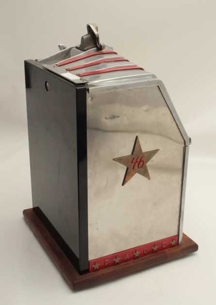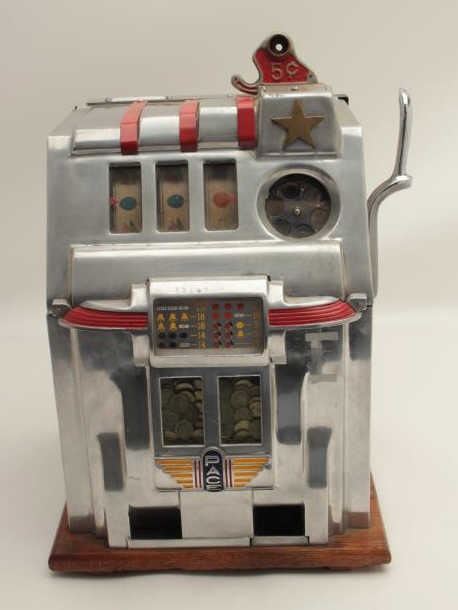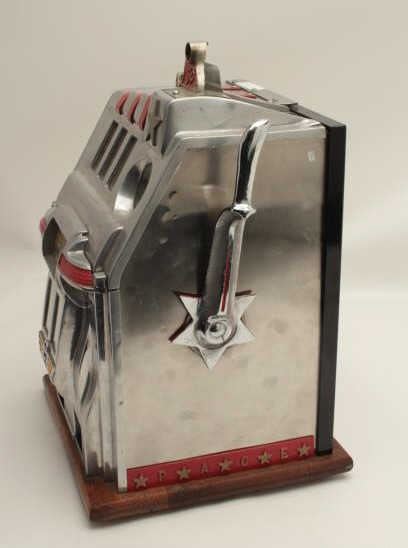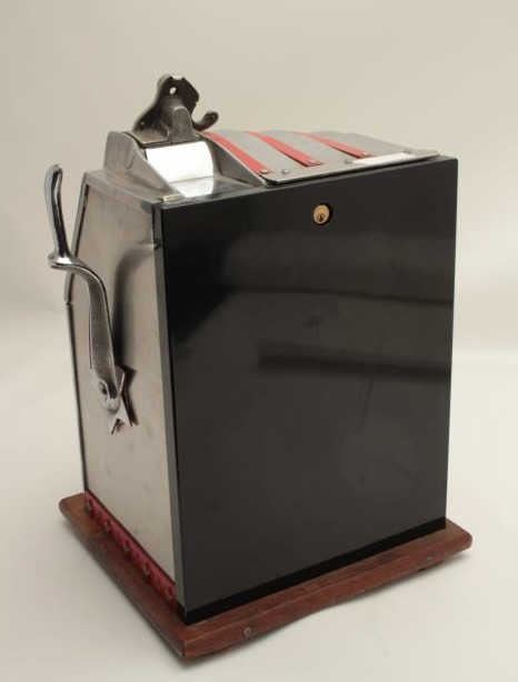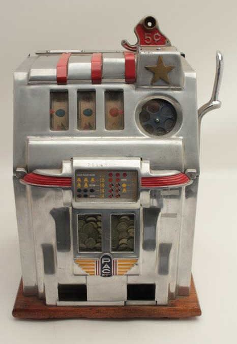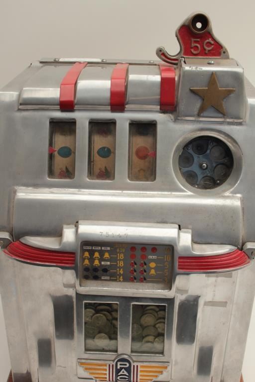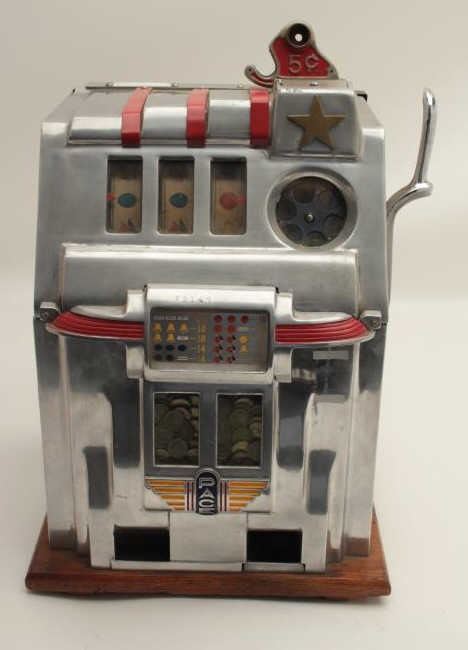 Pace Comet 5 cent slot machine, ca. 1930’s; approximately 25” in height, 17” wide and 15” deep, on wood base and in overall excellent working condition at time of description with key. Est.: $1,400-$2,800.