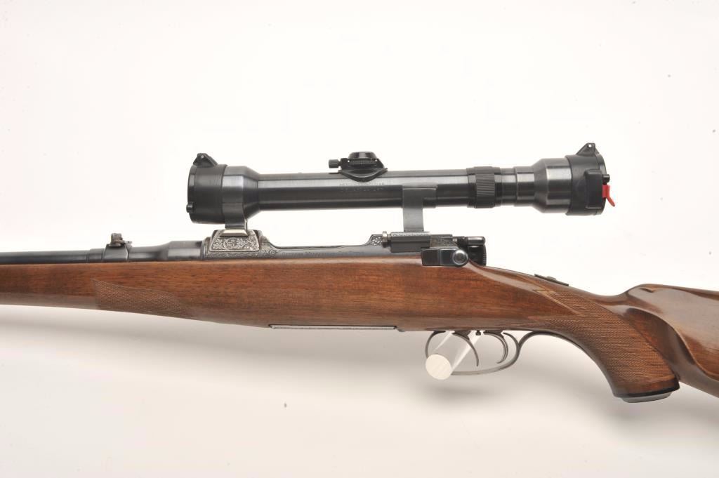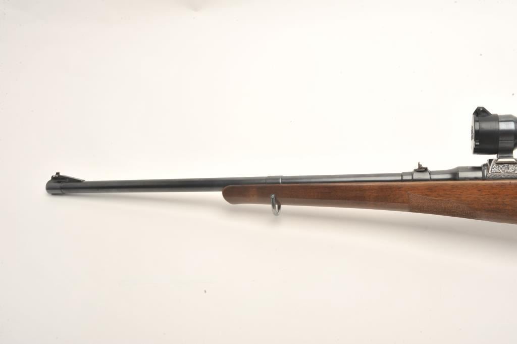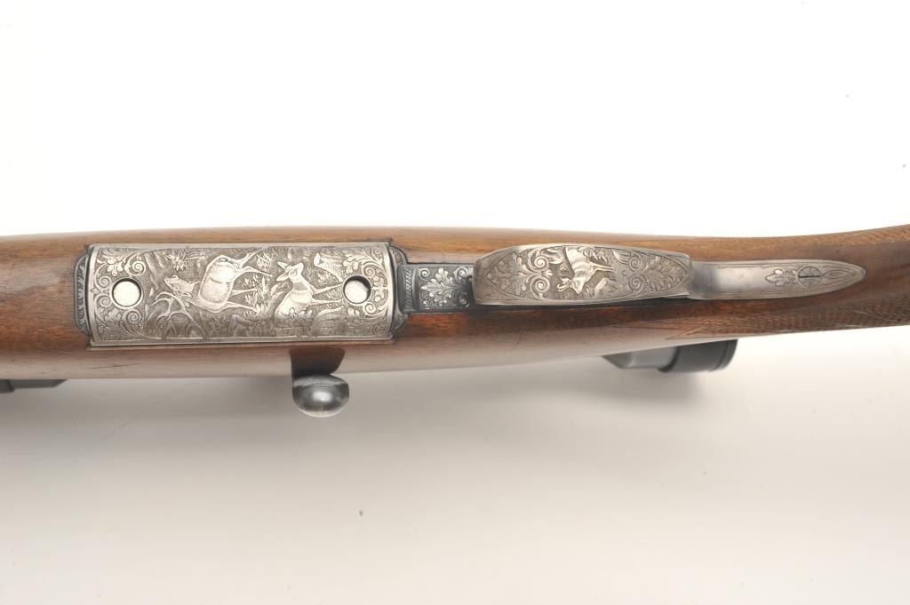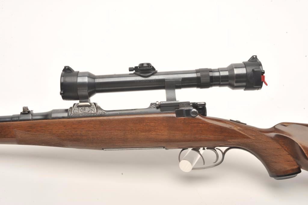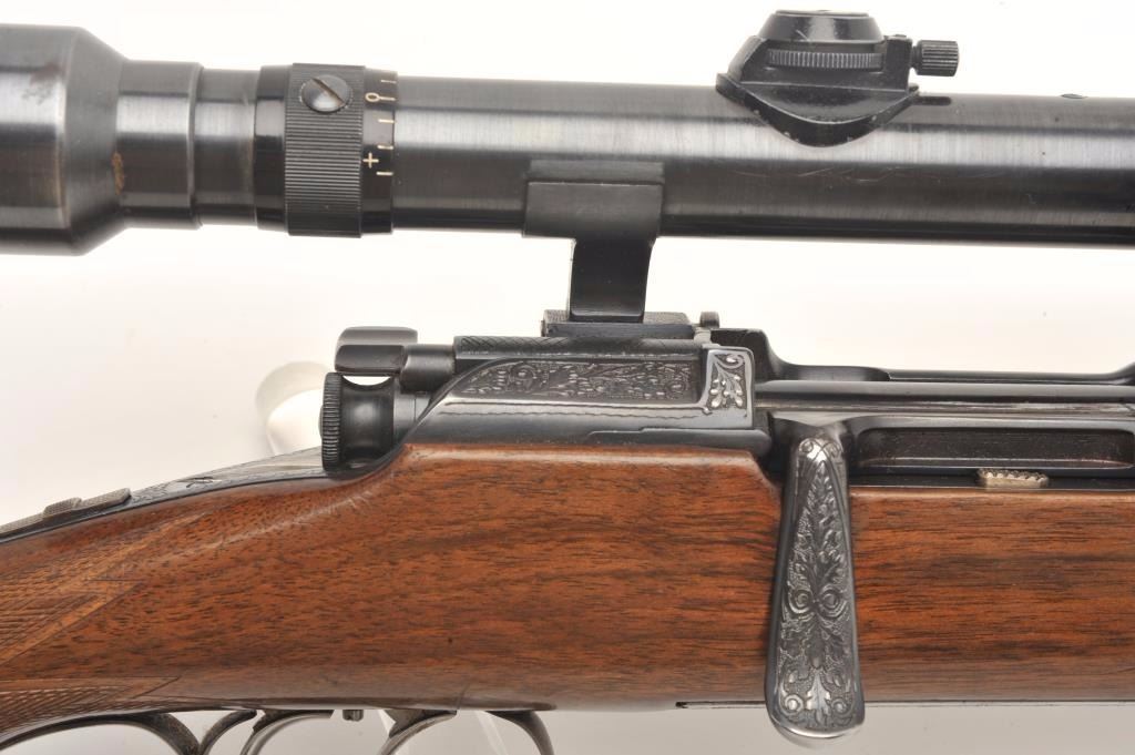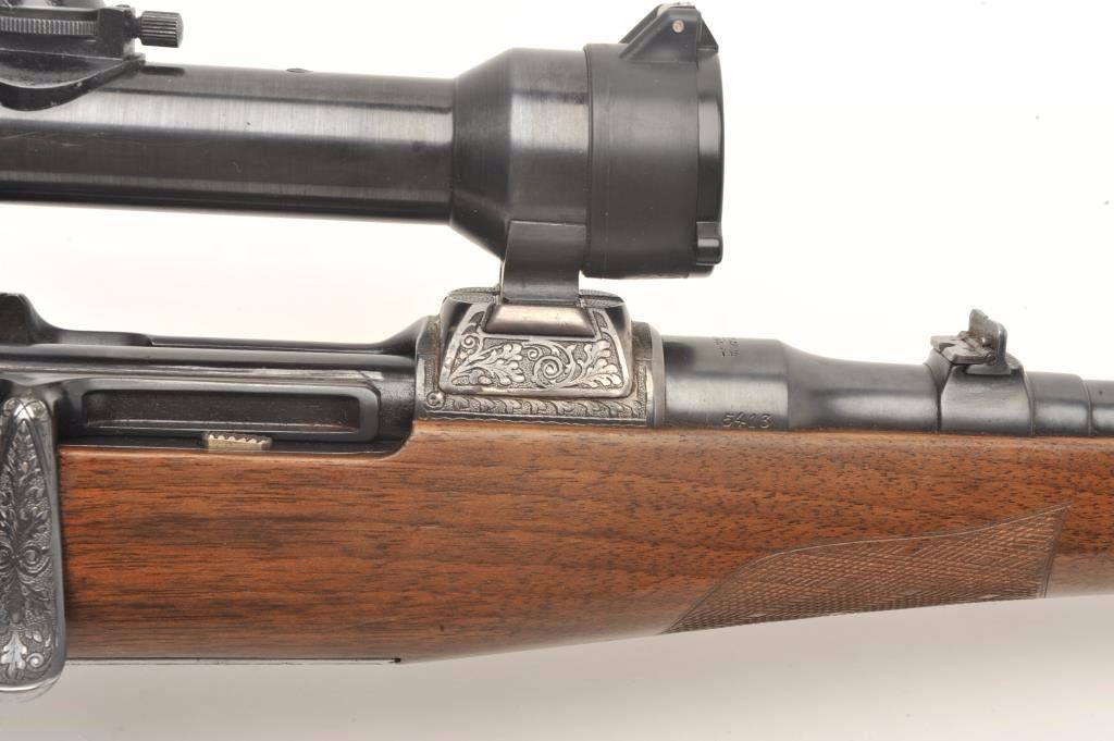 Steyr Mannlicher bolt action rifle, 7 x 57 caliber, serial #5413. The rifle is in very good to nearly fine overall condition with a 22” barrel. The barrel retains the majority of its blued finish with a ramp front andtwo-leaf rear sights. The receiver is beautifully relief engraved in a Germanic game scene with oak leaves, retaining significant original finish. The barrel is marked Anton Sodia, Ferlach ahead of thefront ring and the rifle is equipped with double set triggers and desirable tang safety. The finely checkered wood stock is in very good condition showing handling marks and small mars. The butt stock features aBavarian style cheek piece and ends with a slip on Decelerator pad over a plastic butt plate. The rifle is topped with correct claw mounts and a high quality Hensoldt-Wetzlar fixed 4x scope providing clean, crisp optics. The lot also includes two boxes of Sellier and Bellot 7 x 57 cartridges. The bore is good, the action crisp and markings are sharp on this desirable Mannlicher from a classic Austrian custom maker. (Modern) Est.: