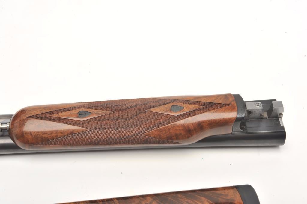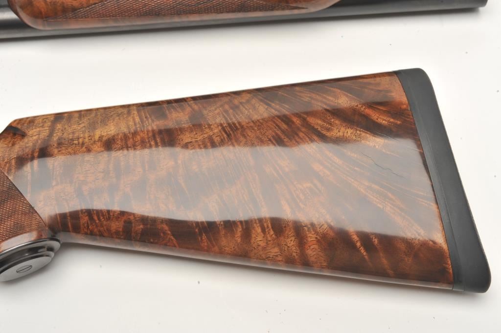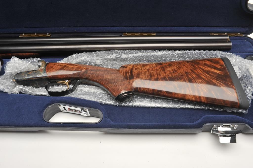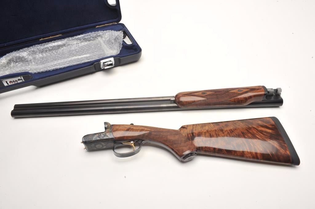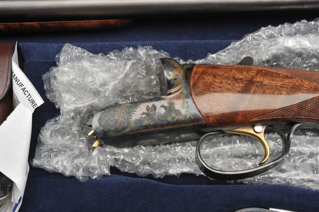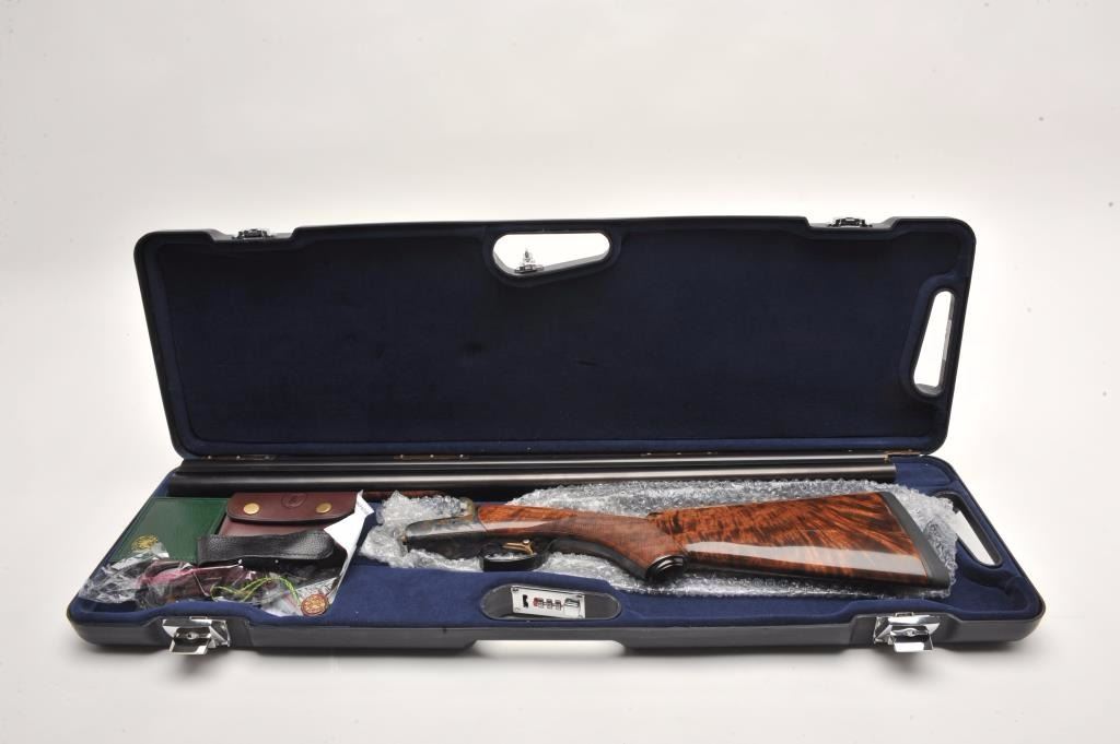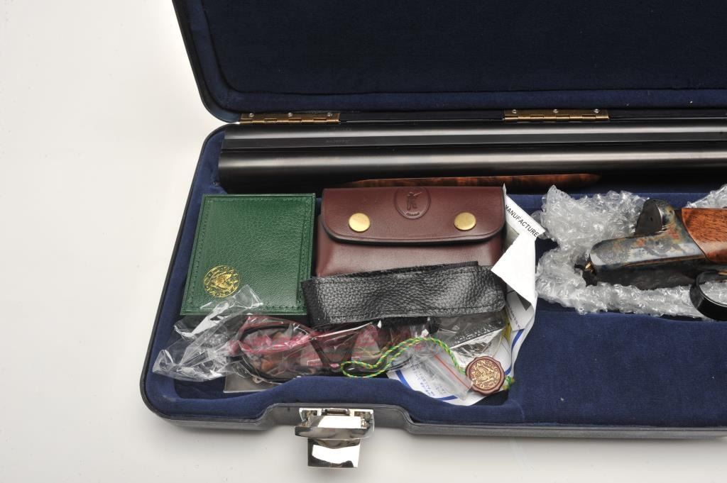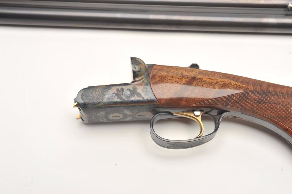 RBL Side by Side shotgun by Connecticut Arms, 12 gauge, serial #RBL005435. The shotgun is in as new in the box condition with 30” barrels with a brass bead front sight. The lot includes the original sales receipt dated April of 2014 with a full purchase cost of $6,245.00. The barrels retain nearly all of their high quality finish while the receiver is tastefully engraved with a game scene and shows beautiful case hardening. The actionfeatures a single, gold trigger. The finely checkered Walnut stock shows little or no use with incredible feather crotch grain and a high gloss finish. The butt stock ends with a Galazan marked rubber recoil padproviding a 14 ¼” LOP. The shotgun comes in a velvet lined plastic hard case with a full set of choke tubes in leather pouch, a set of silver plated snap caps and other accoutrements. The bores are excellent, theaction crisp and markings are sharp on this superior S x S shotgun. (Modern) Est.: $2,500-$5,000.