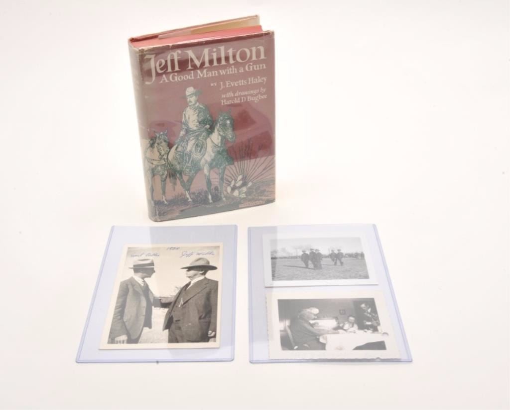 Historic Winchester Model 1887 lever action shotgun, 10 gauge, barrel period shortened to 24”, blued and case hardened finish, wood stocks, S/N 33340 with documentation as belonging to famous Western lawman, Jeff Milton. One original signed letter, dated September 18, 1970 states “Regarding the Model 1887 Lever Action 10 gauge Winchester shotgun which I recently let you have, number 33340, and with a 24 inch barrel: This gun along with a 12 gauge of the same model was given to me by Mr. Jeff Milton about 1935 or 1936 while I was Chief of the Border Patrol in the state of Arizona. I carried this shotgun (10 gauge) during and up to the time of my retirement with the U.S. Border patrol. With kindest regards, I am Yours very truly, Earl Fallis”. A similar notarized affidavit, dated Sept. 3, 1971 and hand signed by Mr. Fallis is also included. A 1971 factory letter is also included indicating this gun, by serial number, originally had a 30” barrel and was shipped on November 20, 1891. The gun is in overall very good condition displaying traces of original case colors on the frame and some areas of muted original blue on the barrel and loading tube, crisp action, sharp markings, very good bore and good wood stocks with checkered steel butt plate. Also included is a binder of original candid photos of Jeff Milton in his later years, pictures with Fallis and family members, etc., many with hand written captions on the back providing his connection with Milton. Jeff Milton was considered one of the greatest of all Western lawmen. He was born on Nov. 7, 1861 in Marianna, Florida, the youngest of fourteen children of Florida Governor John Milton. At the age of 15, Milton moved to Texas and 2 years later became a Texas Ranger. After 4 years, he left for New Mexico and Arizona where he continued his law enforcement career as a Deputy U.S. Marshal (1884) and later as an Arizona Sheriff’s Deputy under John Slaughter. Returning to Texas, Milton eventually became Police Chief of El Paso and on June 21, 1895, while working alongside lawman George Scarborough, shot and killed Martin Mroz, a well-known area outlaw. On Feb. 15, 1900, near Fairbank, AZ, while working as a Wells Fargo Express Messenger, Milton was involved in a shootout with the Burt Alvord gang attempting to rob a train that Milton was guarding. Although severely wounded, he returned fire, killing “Three Fingered Jack” Dunlop and wounding “Bravo” Juan Yoas. Although never fully recovering the use of his arm, in 1904, Milton became a Mounted Immigration Inspector (before the advent of the U.S. Border Patrol). Jeff eventually retired to Tombstone, Arizona in 1932 (where he and Fallis remained close friends for a number of years). He was known to Border Patrol agents as the “first Border Patrolman” and later moved from Tombstone to Tucson, AZ where he died on May 7, 1947, having no formal funeral service but instructing his ashes be scattered in his beloved desert. Formerly in the famous Texas collection of the late John Wilson. Also included with this lot is a first edition of “Jeff Milton, A good Man with a Gun” by J. Evetts Haley (hand signed by Haley). A chance to own a great lawman’s shotgun; previously displayed at the Tombstone, AZ Courthouse Museum while on loan from Earl Fallis. (Antique). Est.: $9,000-$18,000.