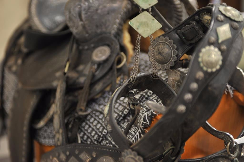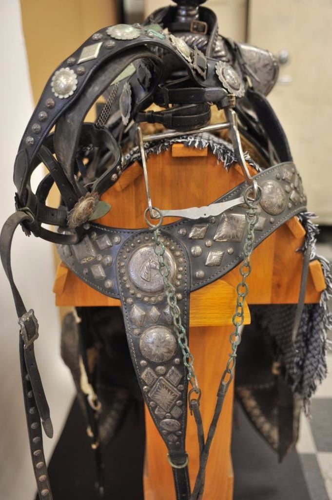 Silver mounted parade saddle belonging to Mickey Eissa who was a western personality that road in early Rose Bowl parades. Beautifully engraved silver horn and gullet signed “Bohlin Made Hollywood Calif.” Theseat is stamped “Hollywood Saddlery LTD, Mickey Eissa (Owner)”. The back of the seat shows a Cheyenne roll in scalloped or fluted design with fancy engraved silver back by same engraver as front. The seat and fendersshow blackened and basket weave carving. Mounted with silver horse heads and diamond all engraved en suite. California style tapaderos with matching silver horsehead and engraved geometric decorations. MatchingBohlin, Hollywood Calif. Signed bit and headstall with long and fancy reins engraved silver mounts with horse heads, conchos, geometrics and fancy silver studs. Some leather pieces are signed Bohlin Hollywood.Also silver mounted 6 ft. reins with drops engraved and raised horse head matching silver breast piece showing same designs as saddle, fenders and headstall. The saddle is in as found in the barn condition needing