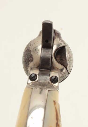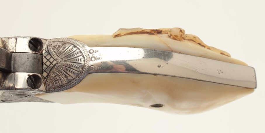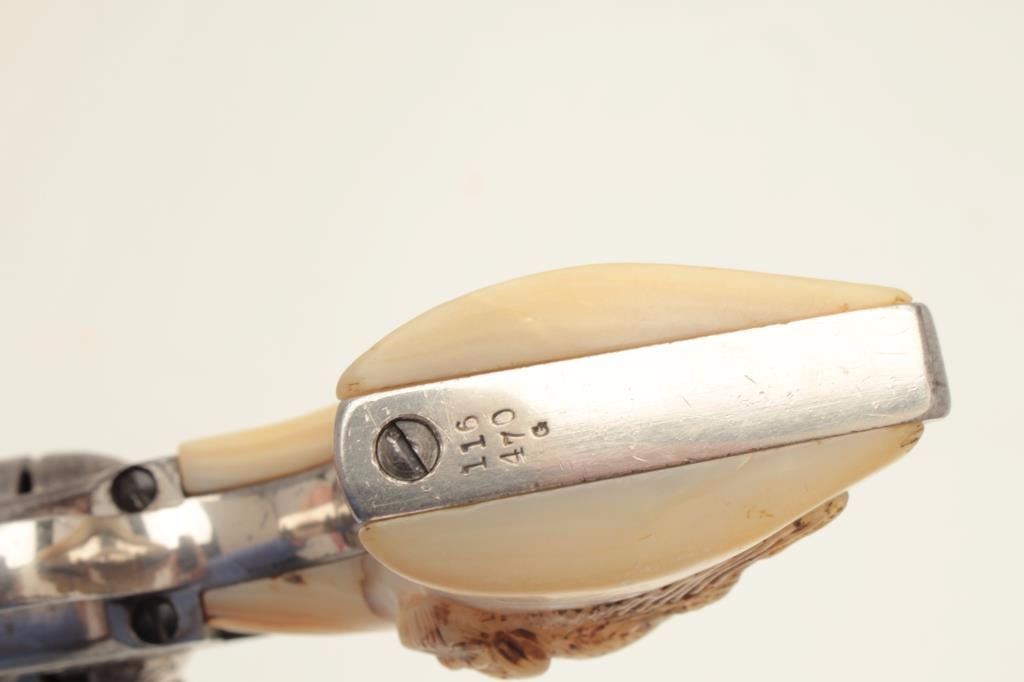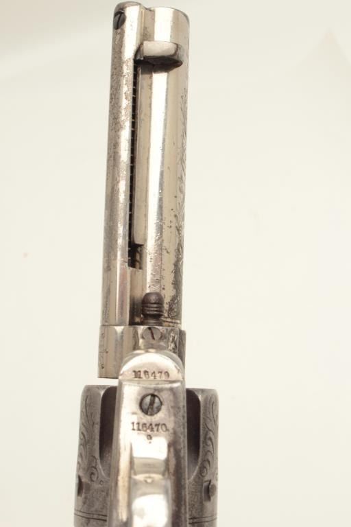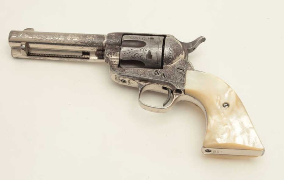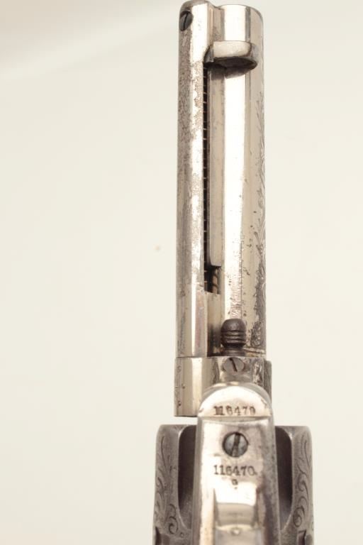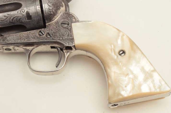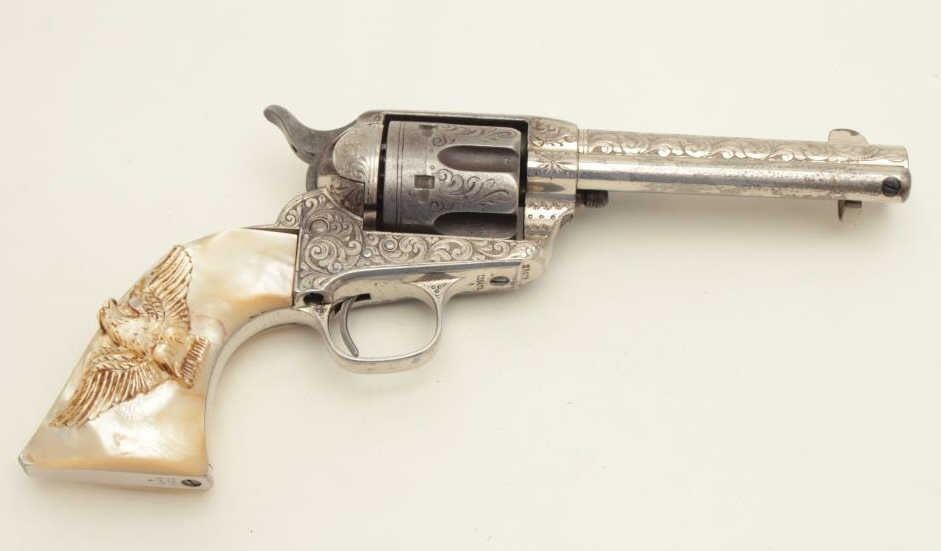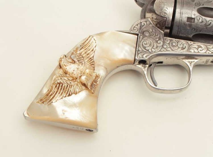 Engraved Colt SAA revolver, .45 caliber, 4.75” barrel, nickel finish, raised carved eagle pearl grips, S/N 116470, blackpowder, Nimschke engraved, shipped soft; in overall very good + condition with extensive coverage of engraving; considerable nickel finish remaining, particularly on barrel assembly and straps; good to very good bore, crisp action, sharp markings and very good beautiful iridescent pearl grips displayingfinely carved spread American eagle. (Antique). Est.: $14,000-$28,000.