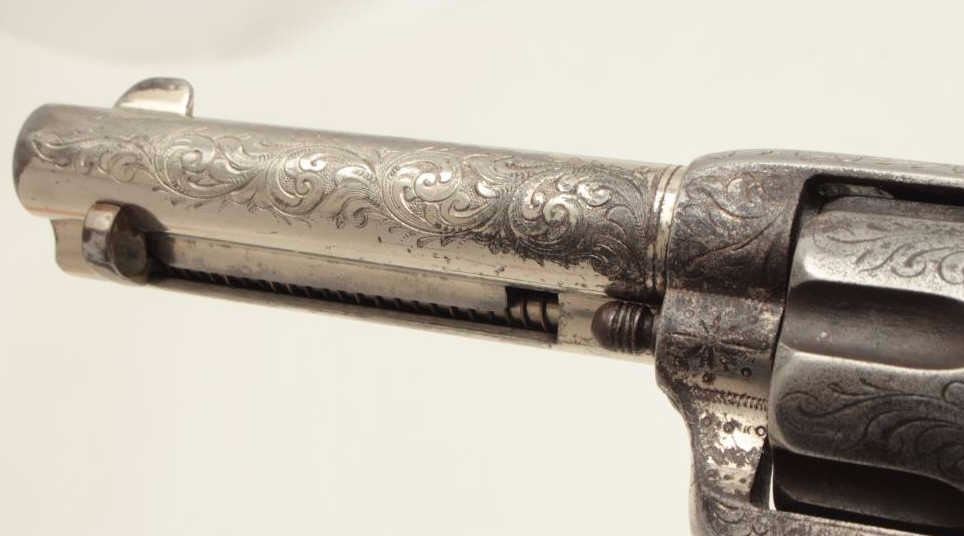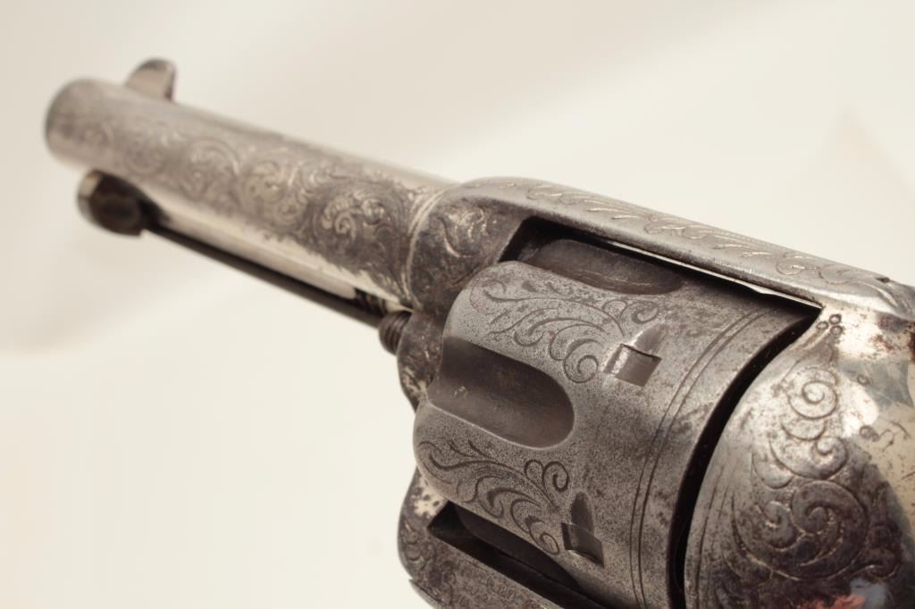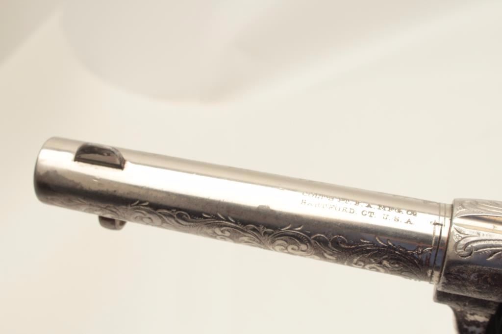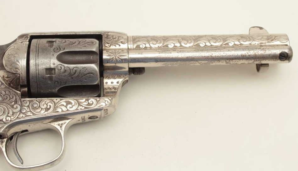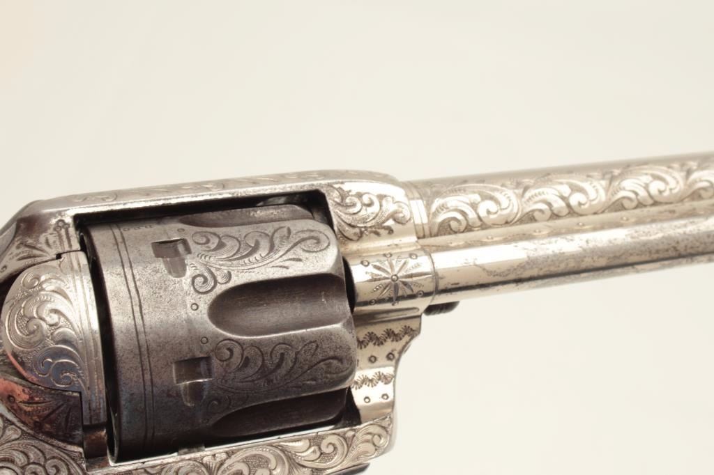 Lot 199 Engraved Colt SAA revolver, .45 caliber, 4.75” barrel, nickel finish, raised carved eagle pearl gr
