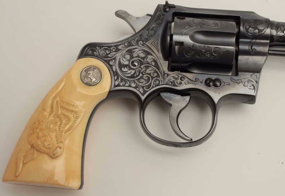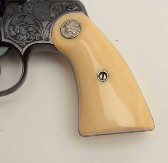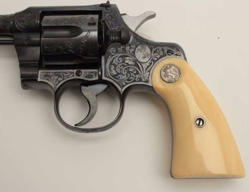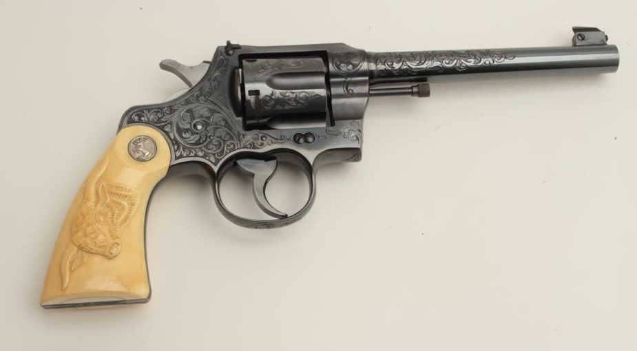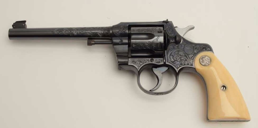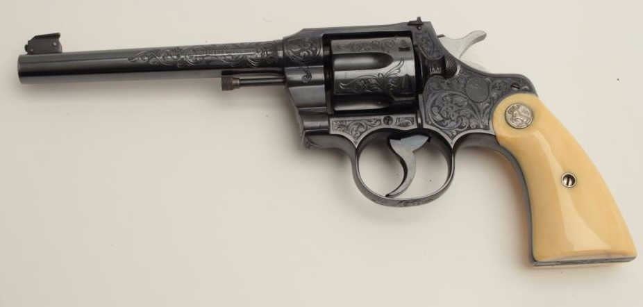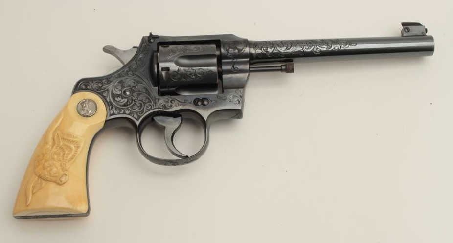 Fantastic Colt Officer’s Model Target DA revolver, .38 caliber, 6” barrel, blued finish, factory engraved, raised carved steer head ivory grips, S/N 536155, in excellent condition showing little use or handling;accompanied by a copy of a 1990-dated Colt factory letter confirming all features and indicating shipment to Morley-Murphy Hardware Co., Green Bay, WI on February 8, 1927, 1 gun in shipment. ALSO, under “Remarks” ofletter: “Records also indicate this revolver was equipped with an Ivory Bead front sight at the time of shipment. This special work was processed on Colt Factory Order Number 12365/1”. A top collector quality Colt thatwould be hard to upgrade from! (C&R/PPT). Est.: $12,500-$25,000.