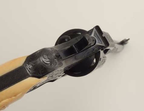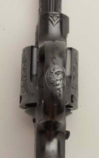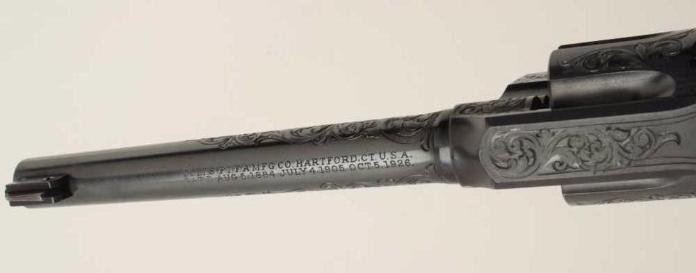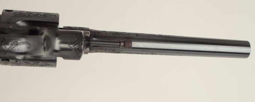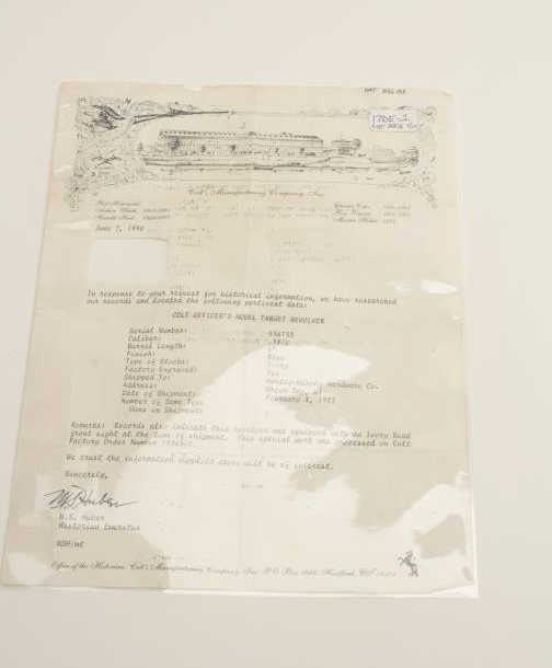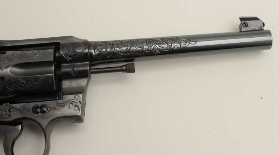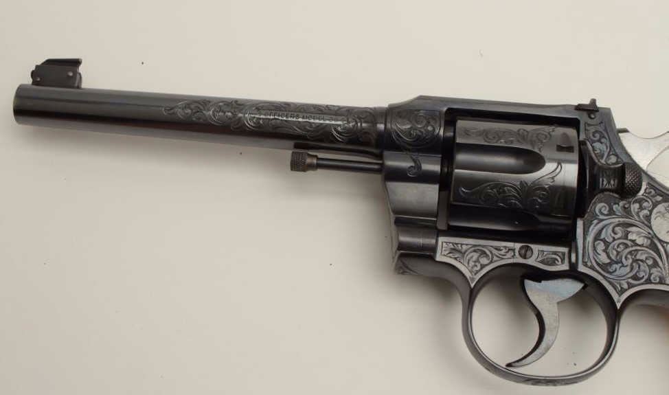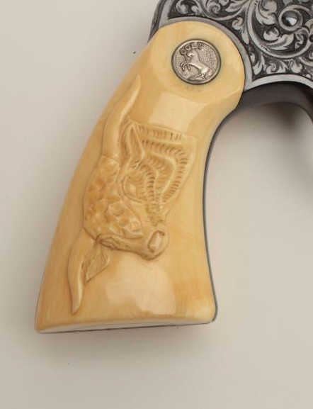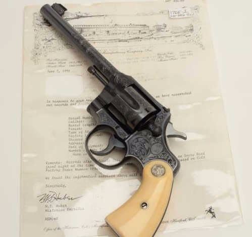Fantastic Colt Officer’s Model Target DA revolver, .38 caliber, 6” barrel, blued finish, factory engraved, raised carved steer head ivory grips, S/N 536155, in excellent condition showing little use or handling;accompanied by a copy of a 1990-dated Colt factory letter confirming all features and indicating shipment to Morley-Murphy Hardware Co., Green Bay, WI on February 8, 1927, 1 gun in shipment. ALSO, under “Remarks” ofletter: “Records also indicate this revolver was equipped with an Ivory Bead front sight at the time of shipment. This special work was processed on Colt Factory Order Number 12365/1”. A top collector quality Colt thatwould be hard to upgrade from! (C&R/PPT). Est.: $12,500-$25,000.