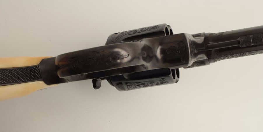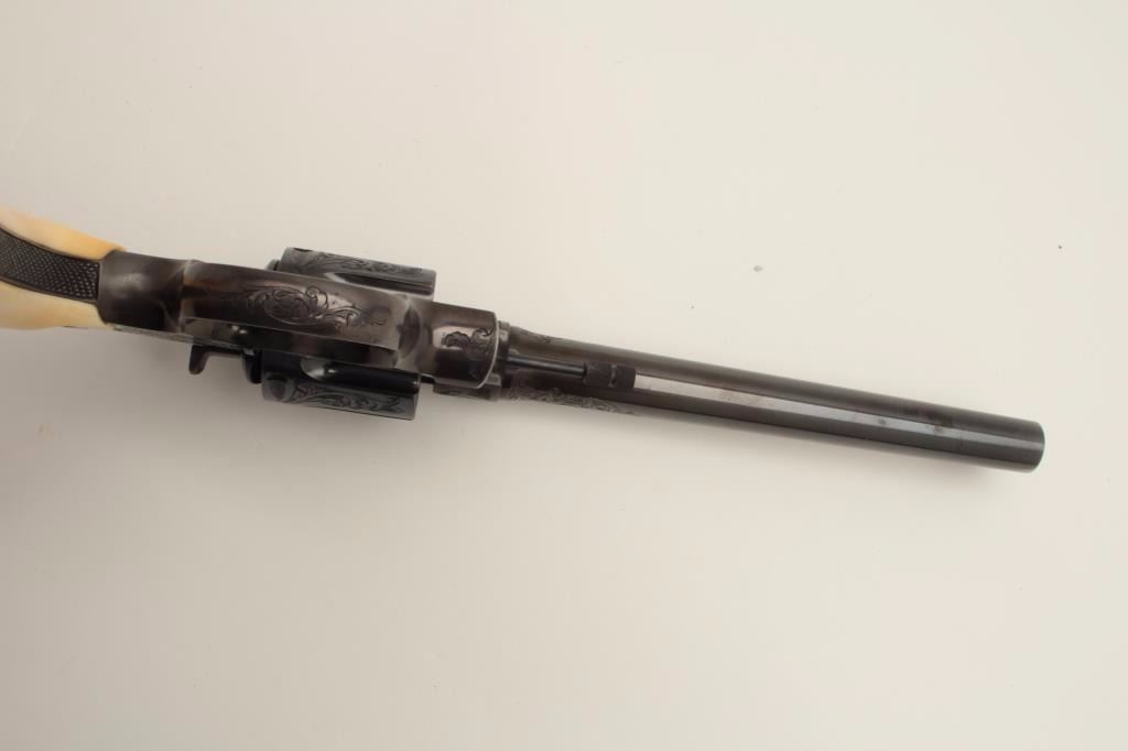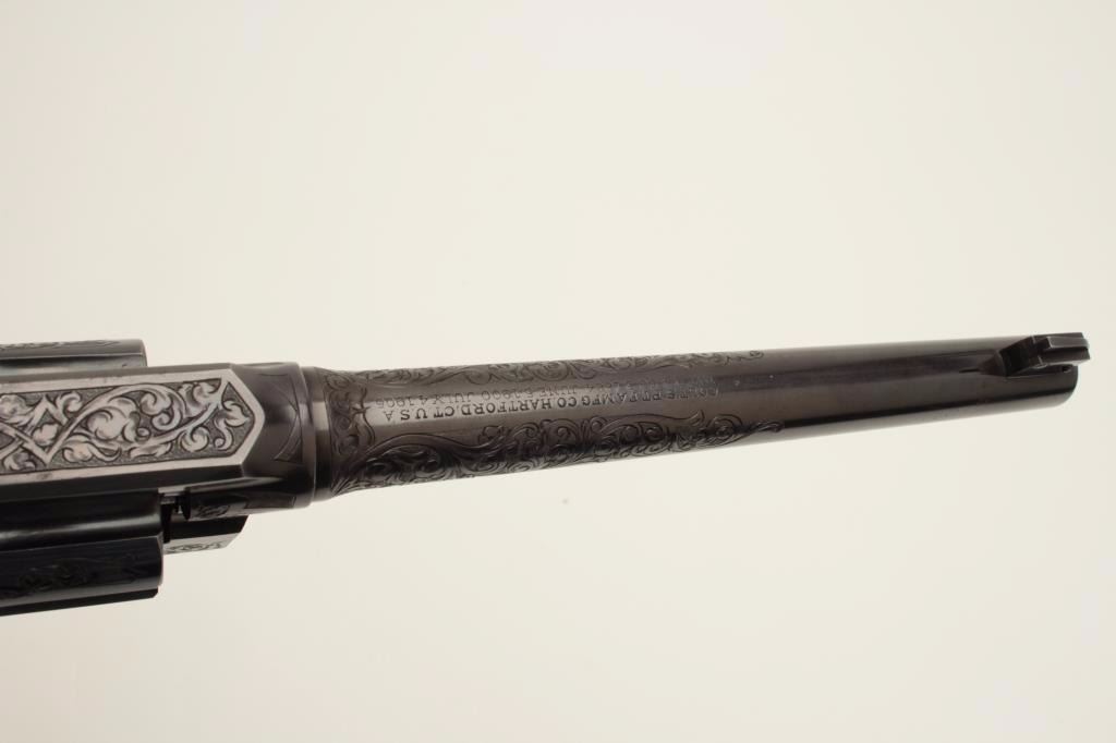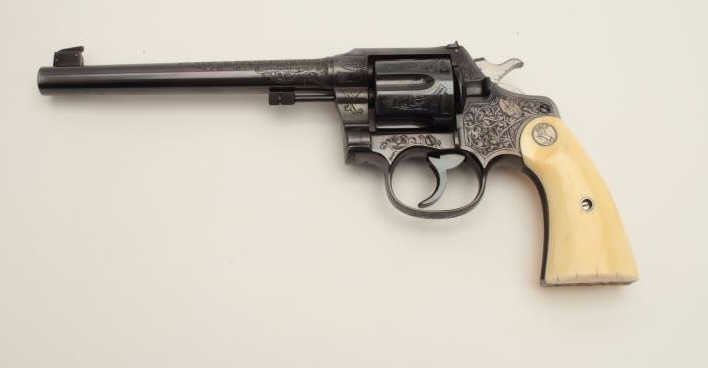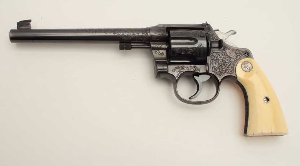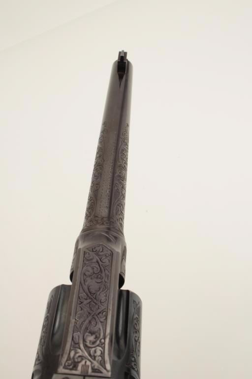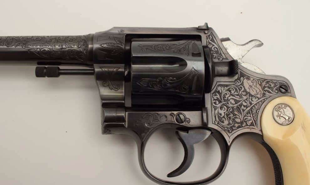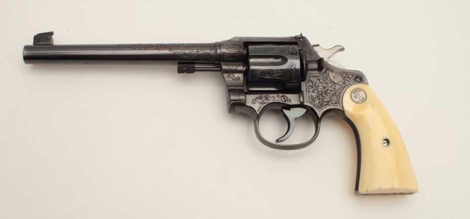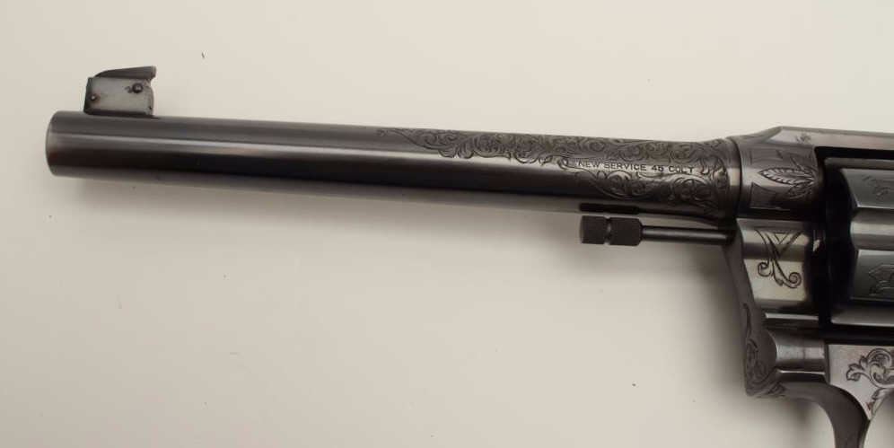 Lot 200b Factory Engraved Colt New Service Target DA revolver, .45 Colt caliber, 7.5” barrel, blued finish,