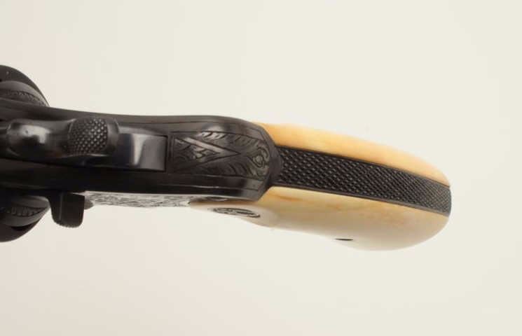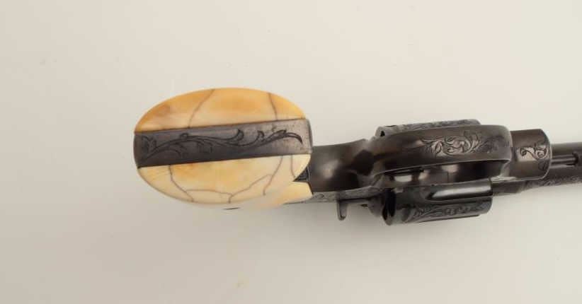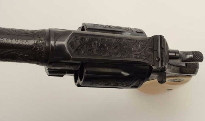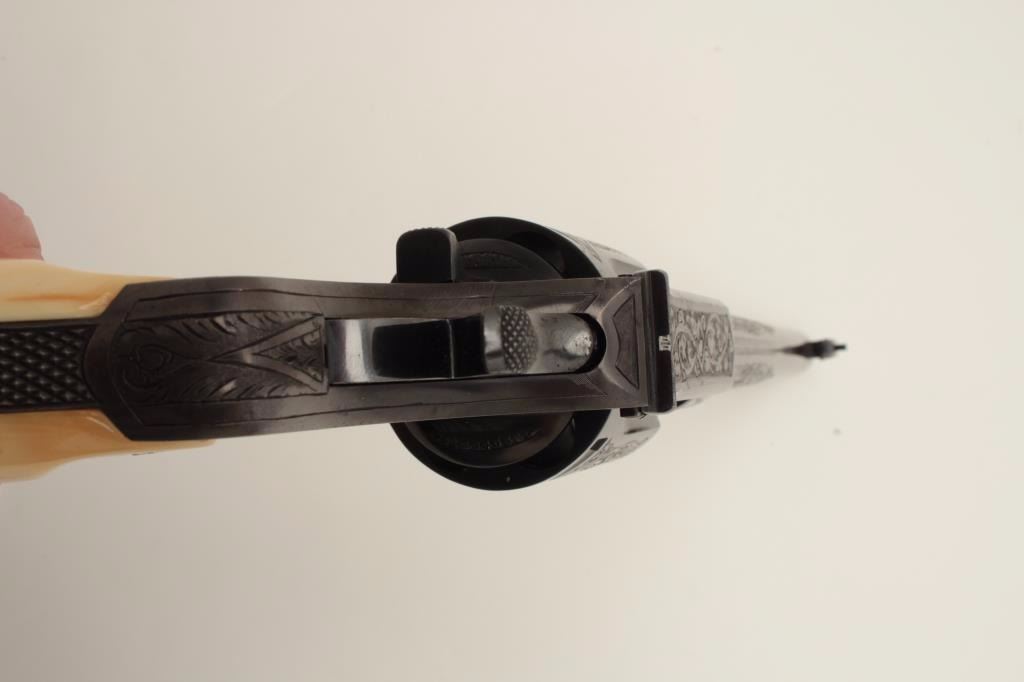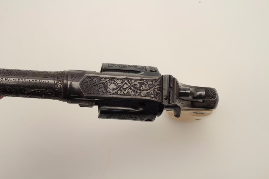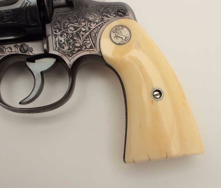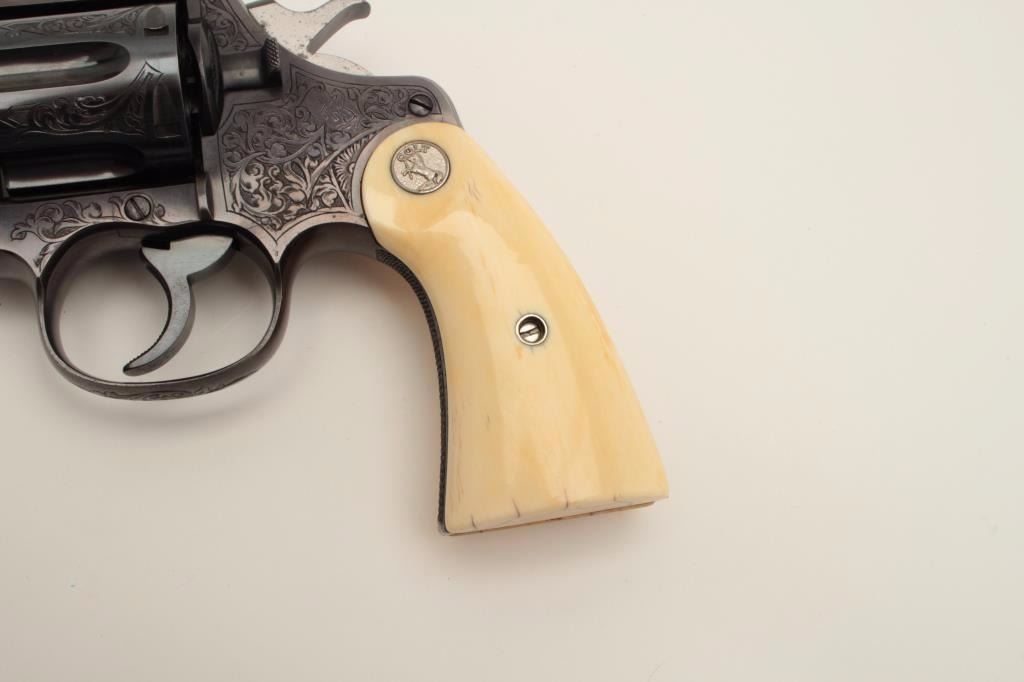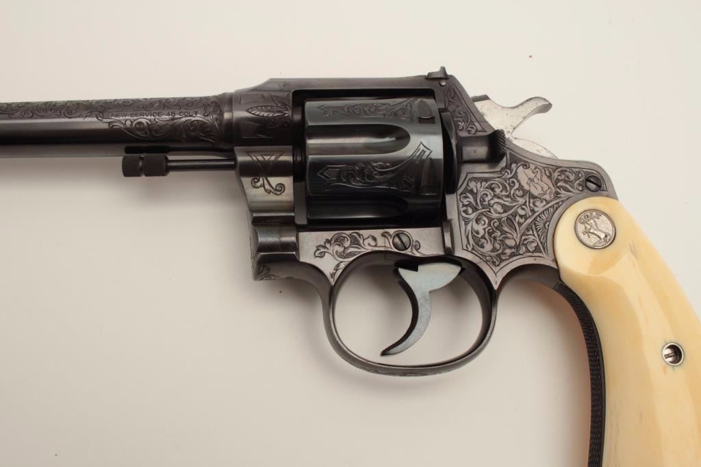 Factory Engraved Colt New Service Target DA revolver, .45 Colt caliber, 7.5” barrel, blued finish, Colt ivory medallion grips, checkered grip straps, S/N 307104, in overall excellent condition displaying 98-99%original finish with only slight muzzle edge wear, excellent bore, crisp action, markings and engraving, excellent grips showing classic age. Accompanied by a Colt factory letter confirming features and factoryengraving; shipped to Iver Johnson Sporting Goods Co., address not listed, Dealer locations Boston, Worchester & Fitchburg, MA, shipped on September 27, 1923 to order #7796/1, one gun in shipment. Hard toimprove upon this one! (C&R/PPT). Est.: $14,000-$28,000.