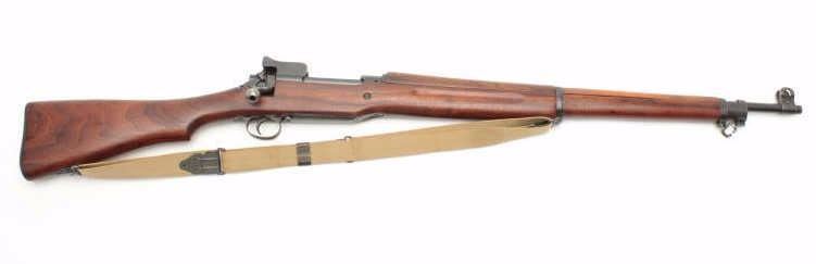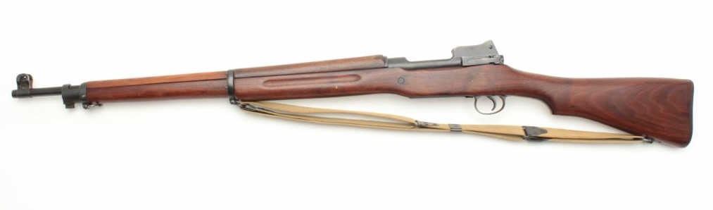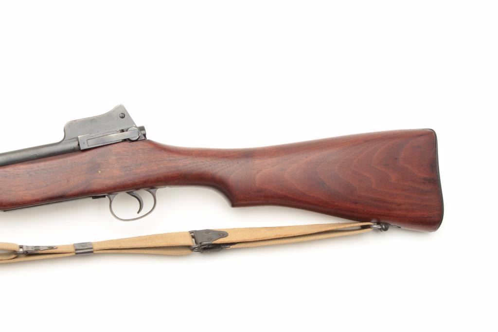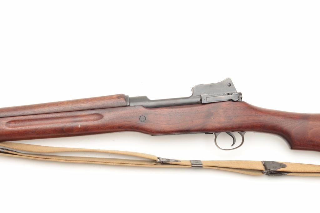 U.S. Model 1917 bolt action rifle by Winchester, .30-06 caliber, 26” Winchester barrel dated 5-18, military blued finish, wood stock, woven sling, S/N 301034, in overall fine condition displaying themajority of its military finish, fine bore, crisp action, sharp markings and fine stock with 2 circle P proofs and inspector’s cartouche. (C&R). Est.: $750-$1,500.