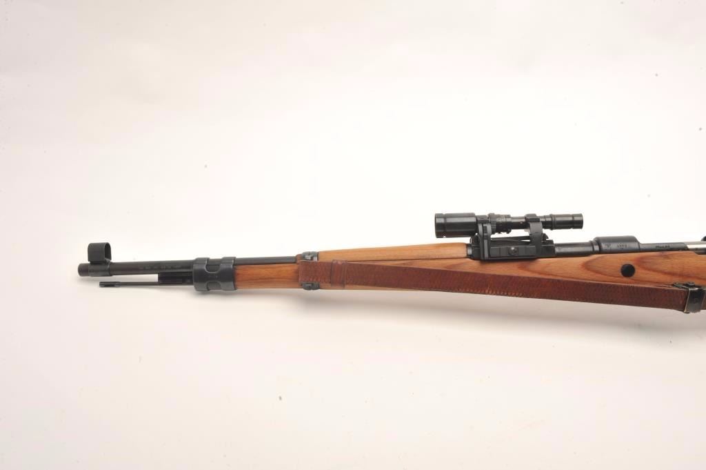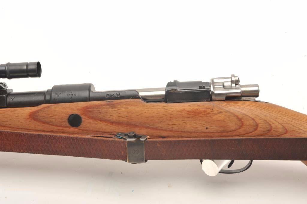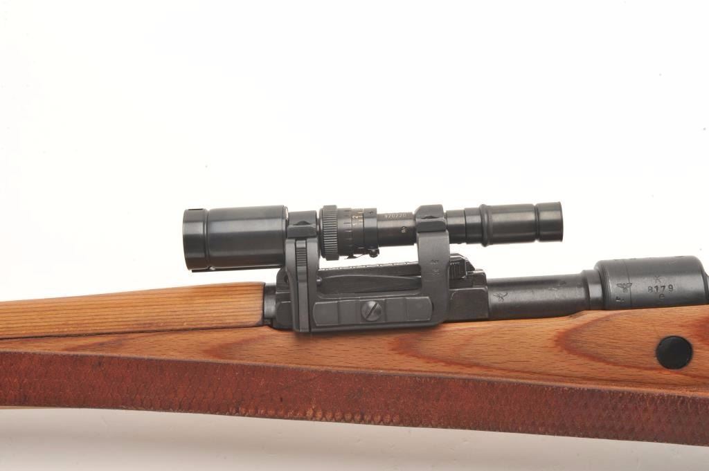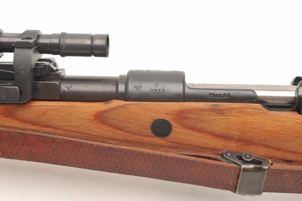 Mitchell Mauser Model 98 bolt action rifle, 8mm caliber, 25” barrel, import-marked, nazi proofed, wood stock, leather sling, S/N 8179E, mounted with a ZF-41 scope, sniper quality with crisp optics, in overall finecondition as re-furbished, 42 dated on top of receiver; also Mitchell Mauser metal case for scope. (C&R/PPT). Est.: $900-$1,800.