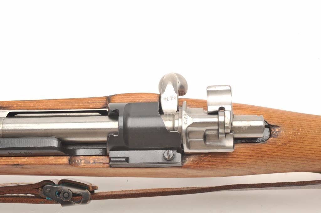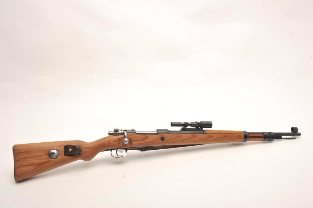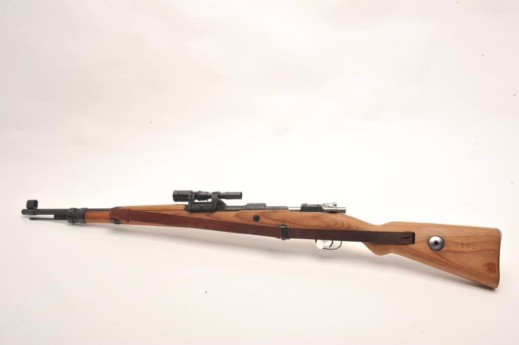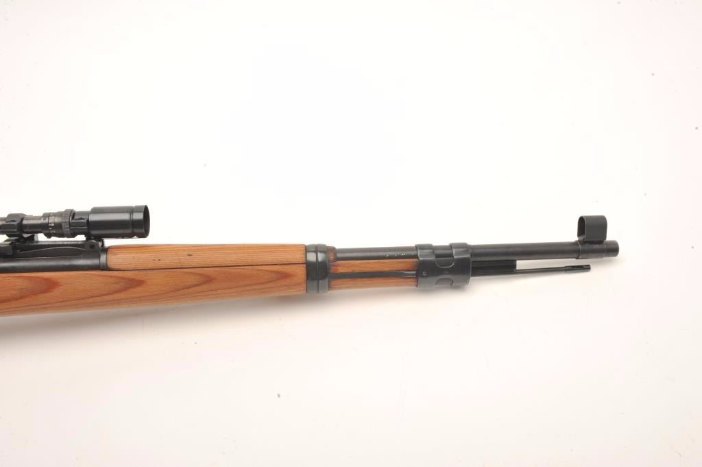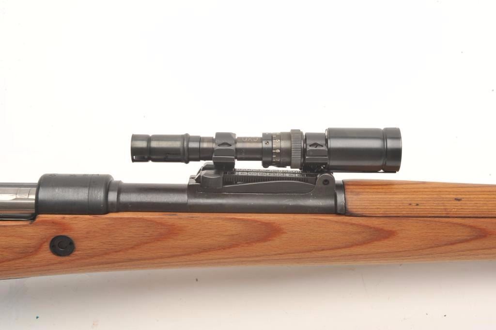 Mitchell Mauser Model 98 bolt action rifle, 8mm caliber, 25” barrel, import-marked, nazi proofed, wood stock, leather sling, S/N 8179E, mounted with a ZF-41 scope, sniper quality with crisp optics, in overall finecondition as re-furbished, 42 dated on top of receiver; also Mitchell Mauser metal case for scope. (C&R/PPT). Est.: $900-$1,800.