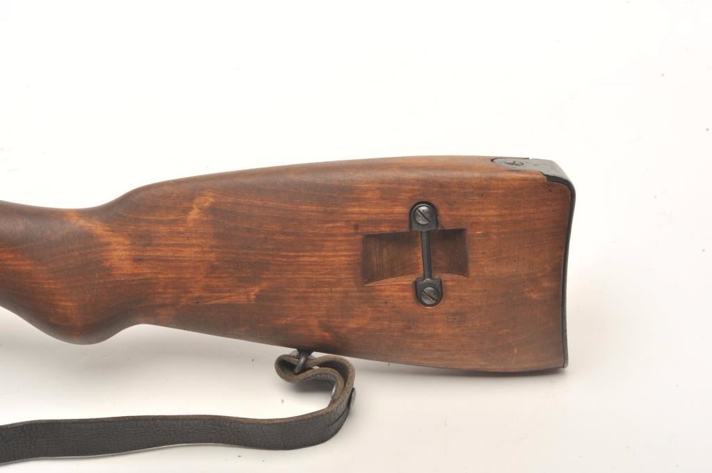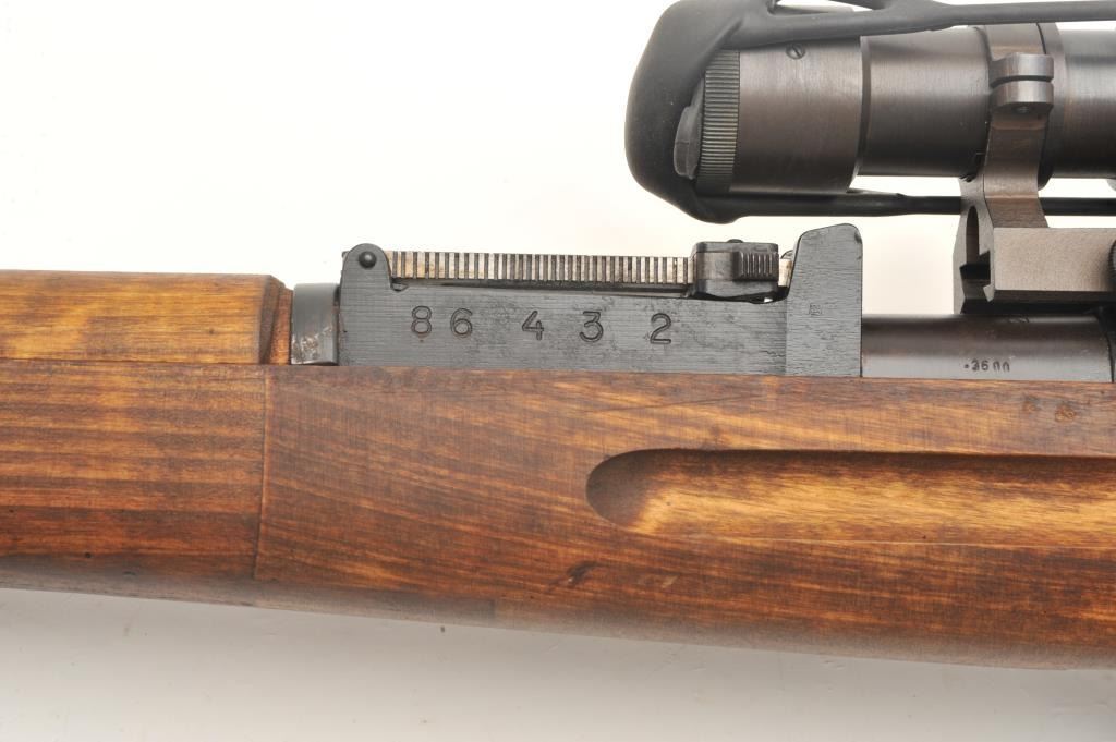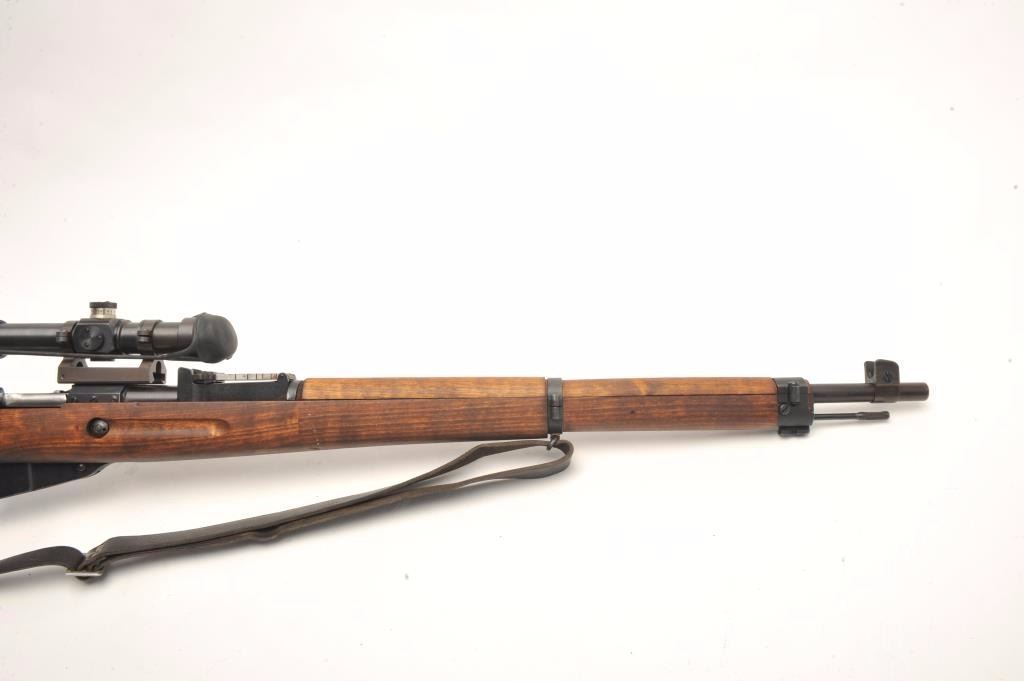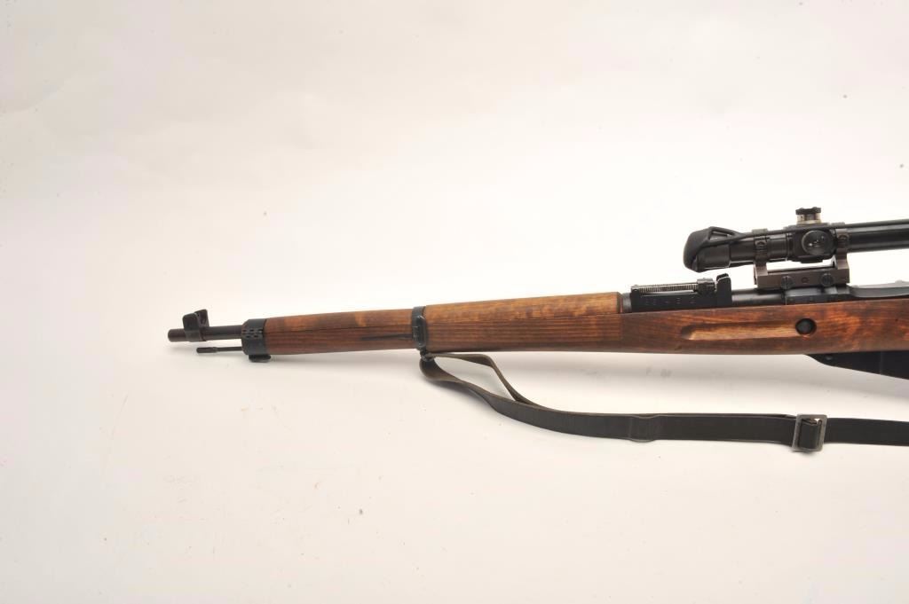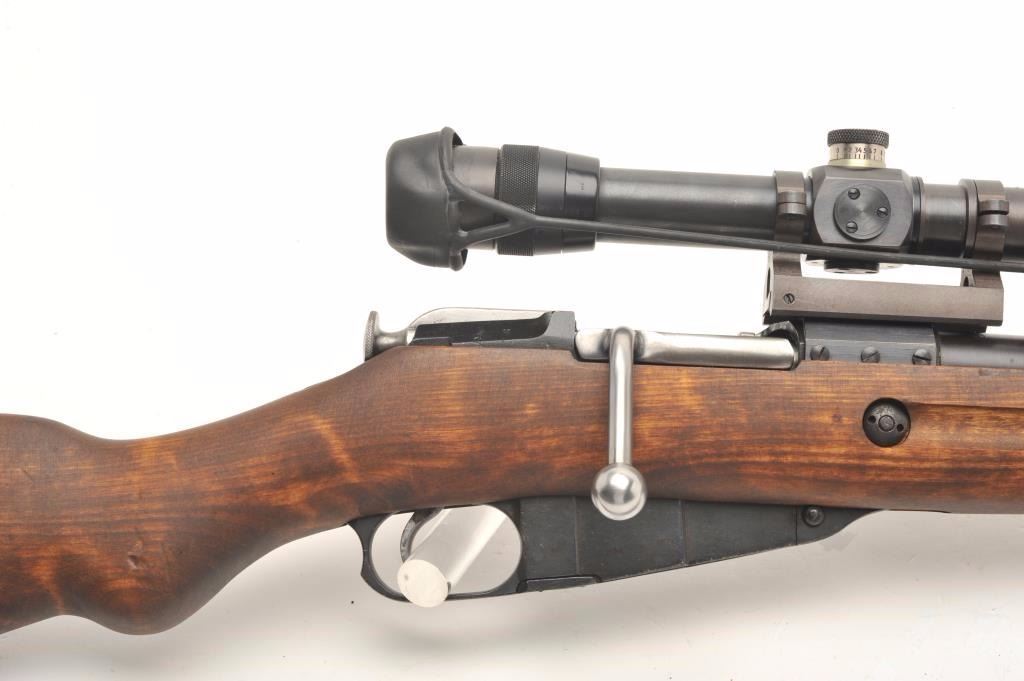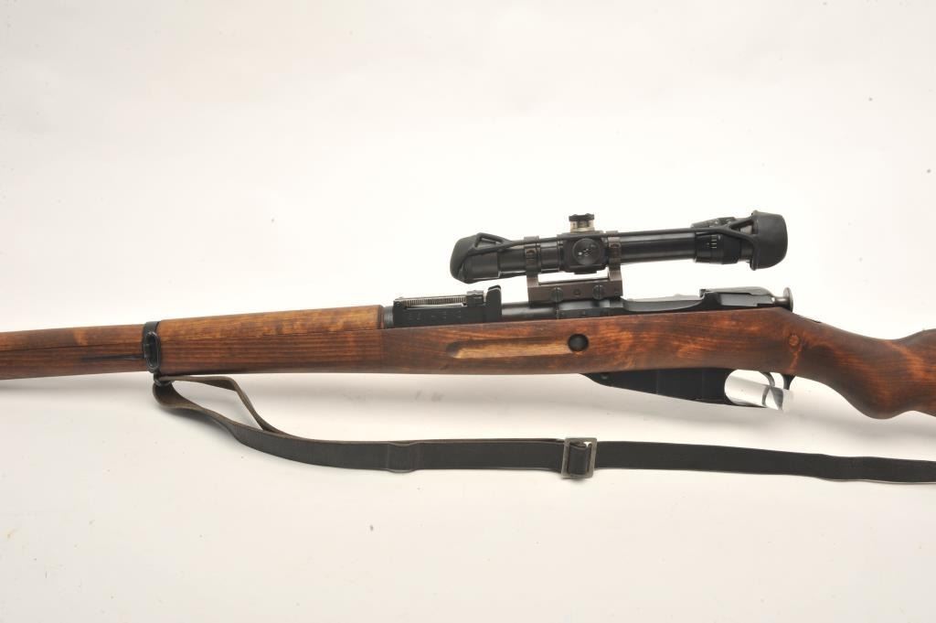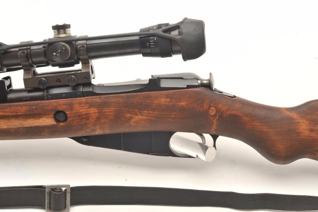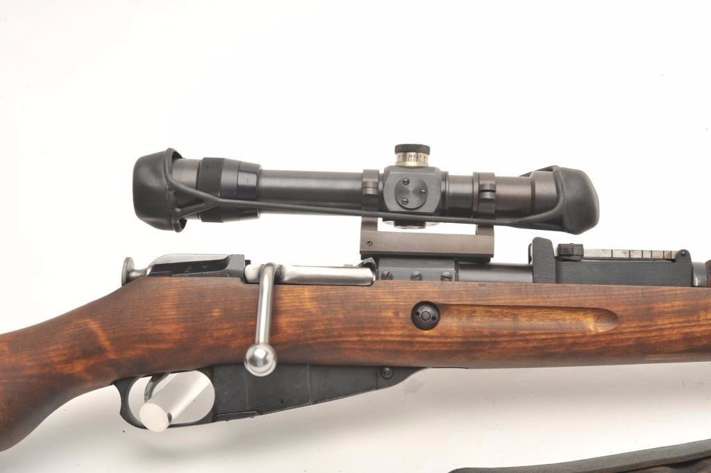 Finnish Nagant bolt action rifle, import-marked, with scope displaying crisp Zeiss optics, Russian re-built, wood stock, leather sling, S/N 86432, in overall very good to near fine as restored.(C&R/PPT). Est.: $800-$1,600.