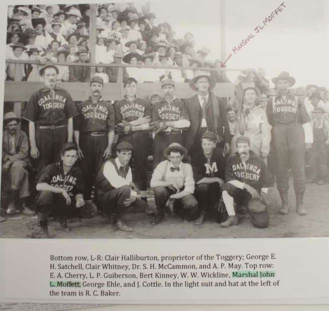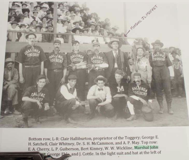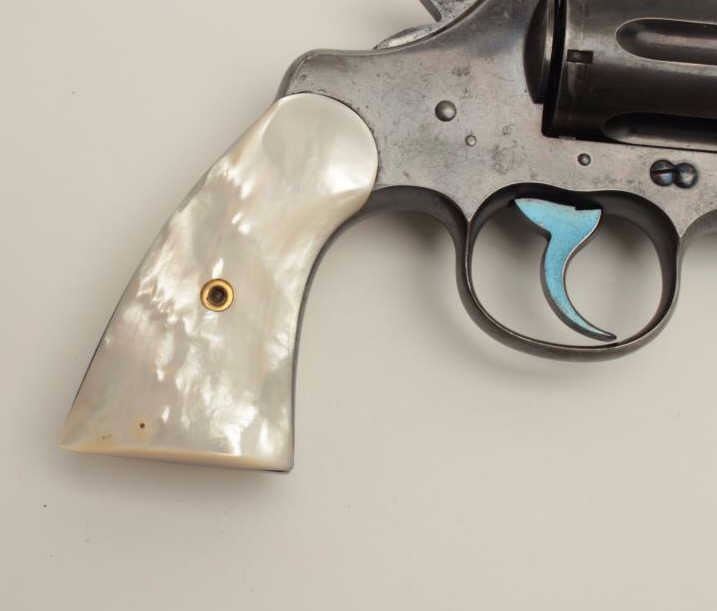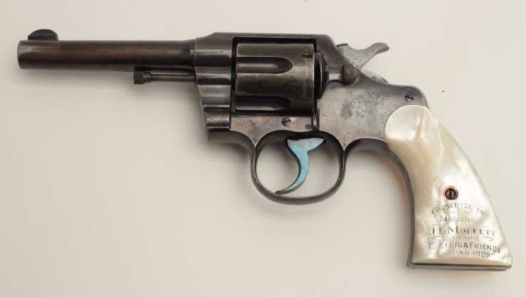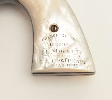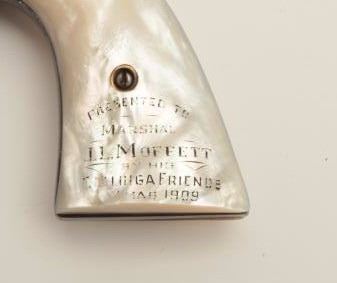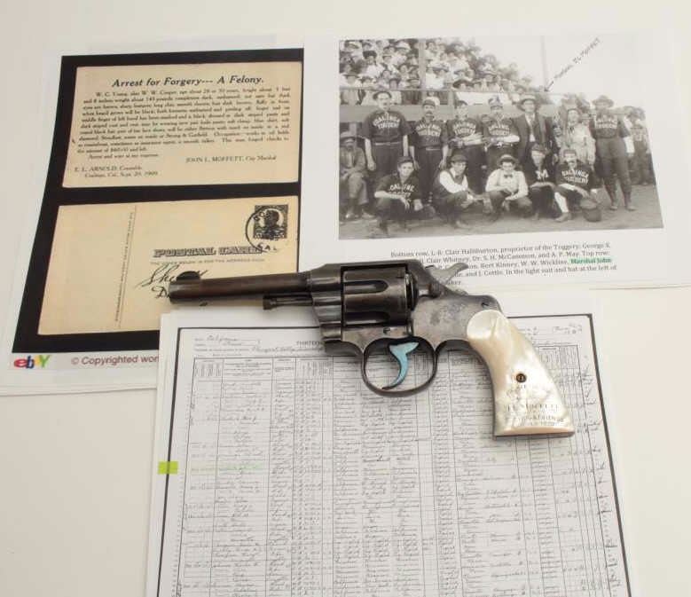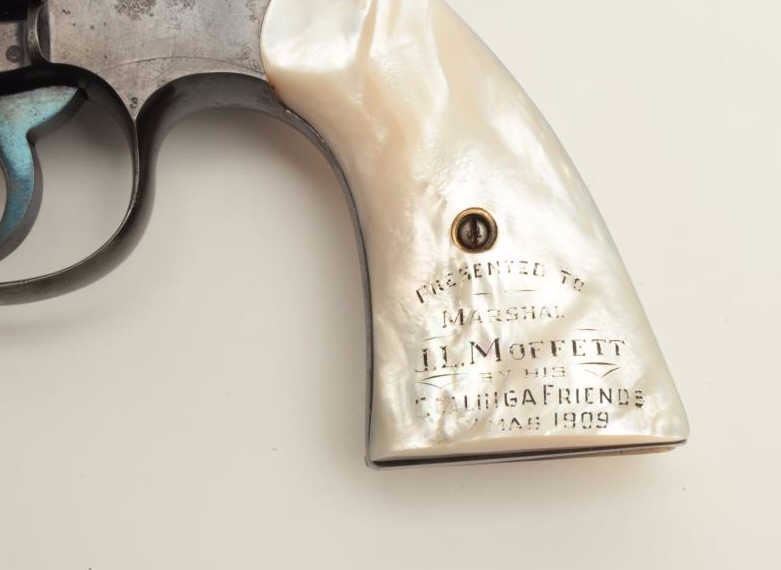 Historic Colt Army Special DA revolver, .32 W.C.F. caliber, 4.5” barrel, blued finish, pearl grips with period inscription on left grip “Presented to Marshal J. L. Moffett by his Coalinga Friends/Xmas 1909”, S/N 313949,in overall very good + condition displaying considerable original blued finish mixed with brown patina and some holster wear with minor spots of light erosion; crisp action, good markings and a very good bore. Thegrips are beautifully iridescent and the inscription shows considerable black enamel fill in the lettering. Accompanying this gun are copies of two photos of the “Coalinga Toggery” baseball team with Marshal Moffettstanding with the group in front of bleachers that are packed with fans. Additionally, there are several copies of newspaper, census, and postcard notices of wanted persons related to City Marshal Moffett.Additional research on Moffett should provide the successful bidder with more information on Moffett’s career. (C&R/NO PPT). Est.: $2,000-$4,000.