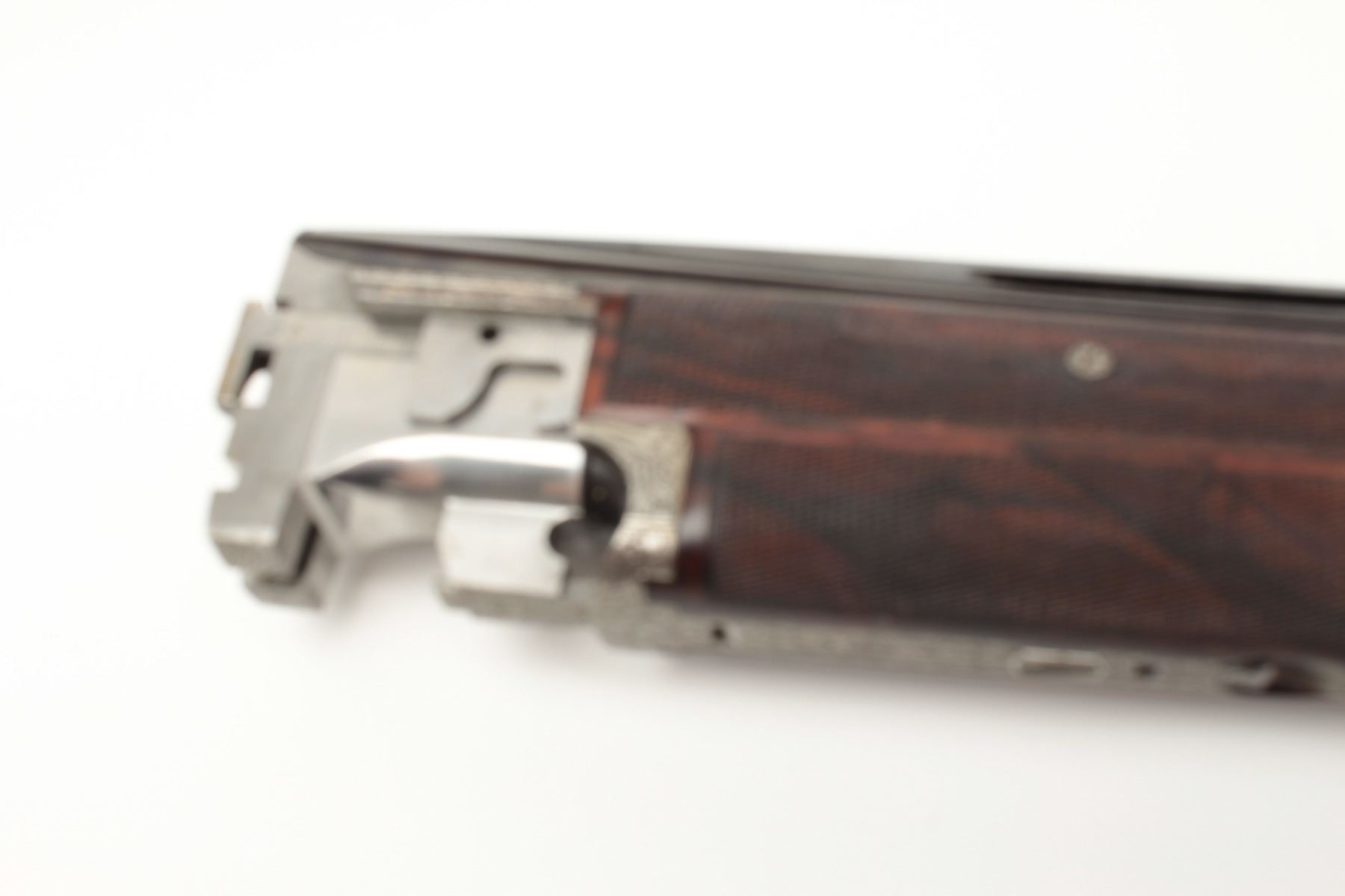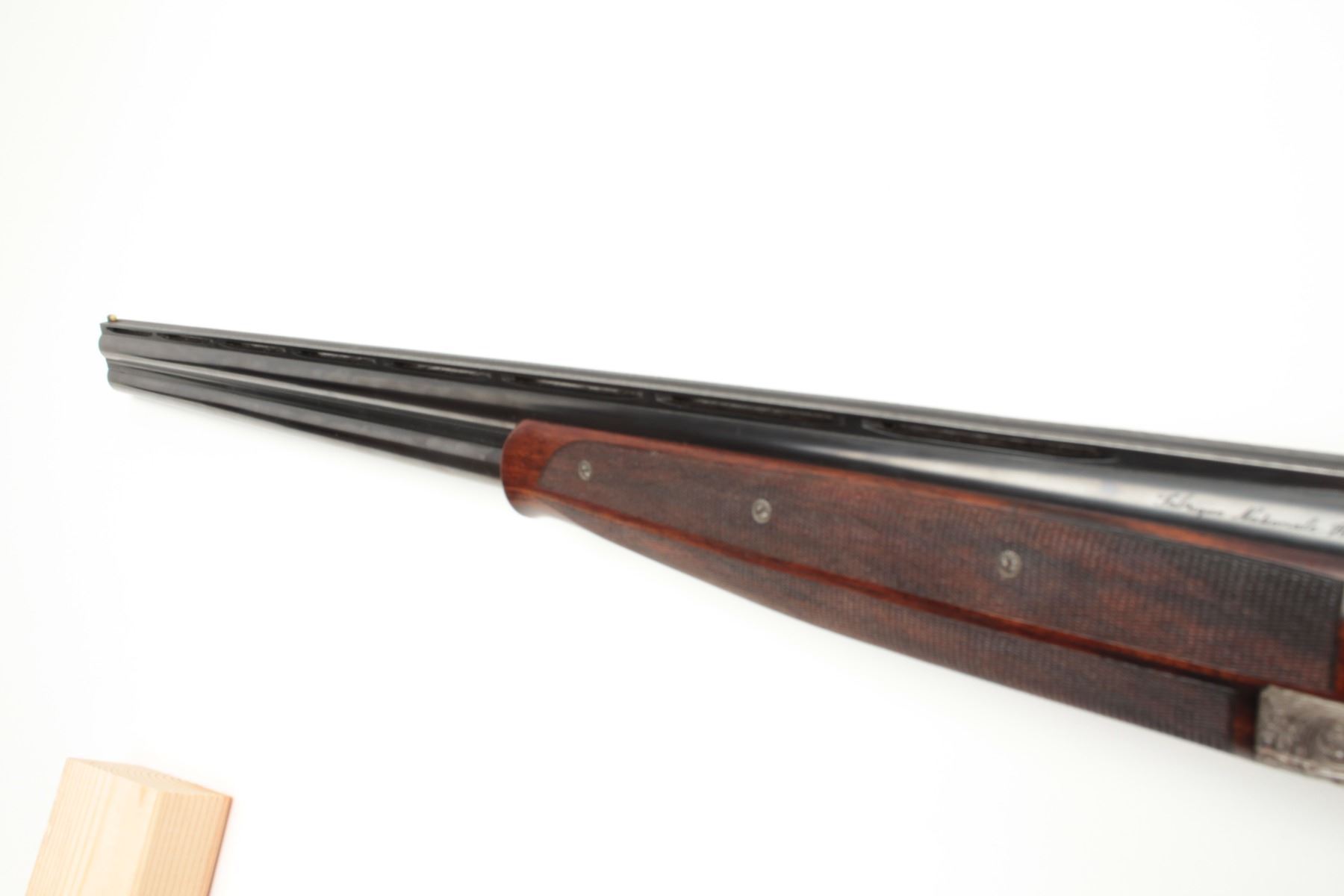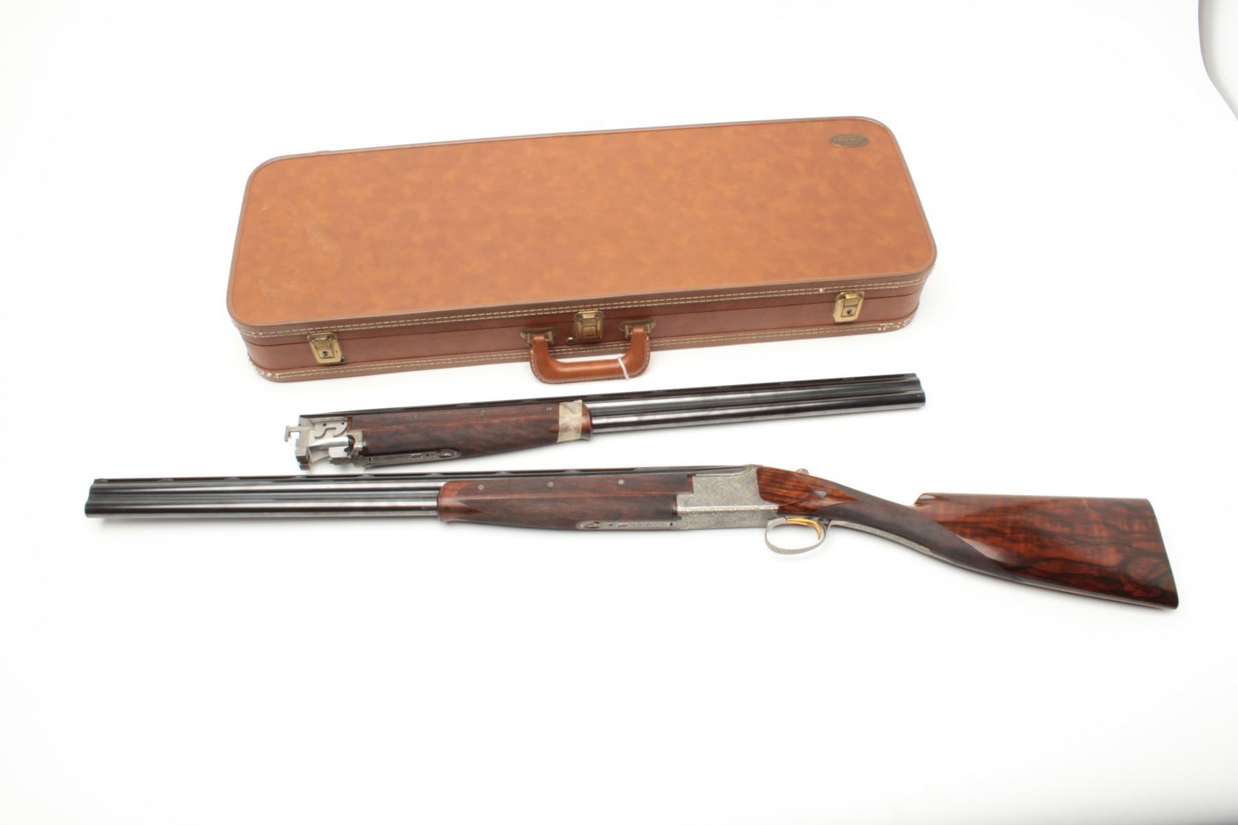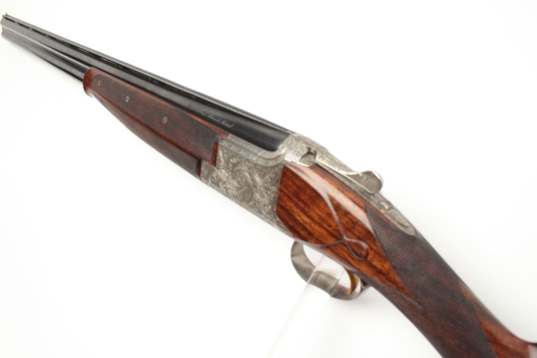 F.N. Custom workshop B25 O/U Belgium made 12GA shotgun, 2 barrel set and elaborately scroll engraved, S/N 18194-73. The engraving is signed J. Lodewy at the bottom left of the frame. Barrel #1 is 27 ½” with a low riseand hand filed rib with split forend. Both barrels are choked improved cylinder. Barrel #2 is 27 ½” with the same configurations, split forend, matching numbers and choked modified/modified both barrels. Singletrigger and auto ejectors. The stocks are select burl walnut with fine checkering on forends, wrist, and English style wood butt. 14 ½” pull and approximately 1 ¼” drop at the comb and 1 ½” at the heel. Perch bellyEuropean style buttstock. The metal surfaces remain in near fine condition with 95%-98% original finish showing minor loss and slight use. The stock needs repair and restoration with one forend having a crack (Pieceretained and easy repair). The buttstock shows a hair line crack and weakness at the right side of the wrist. An extremely expensive and fine set that would be in excess of $25,000 to replace with a long