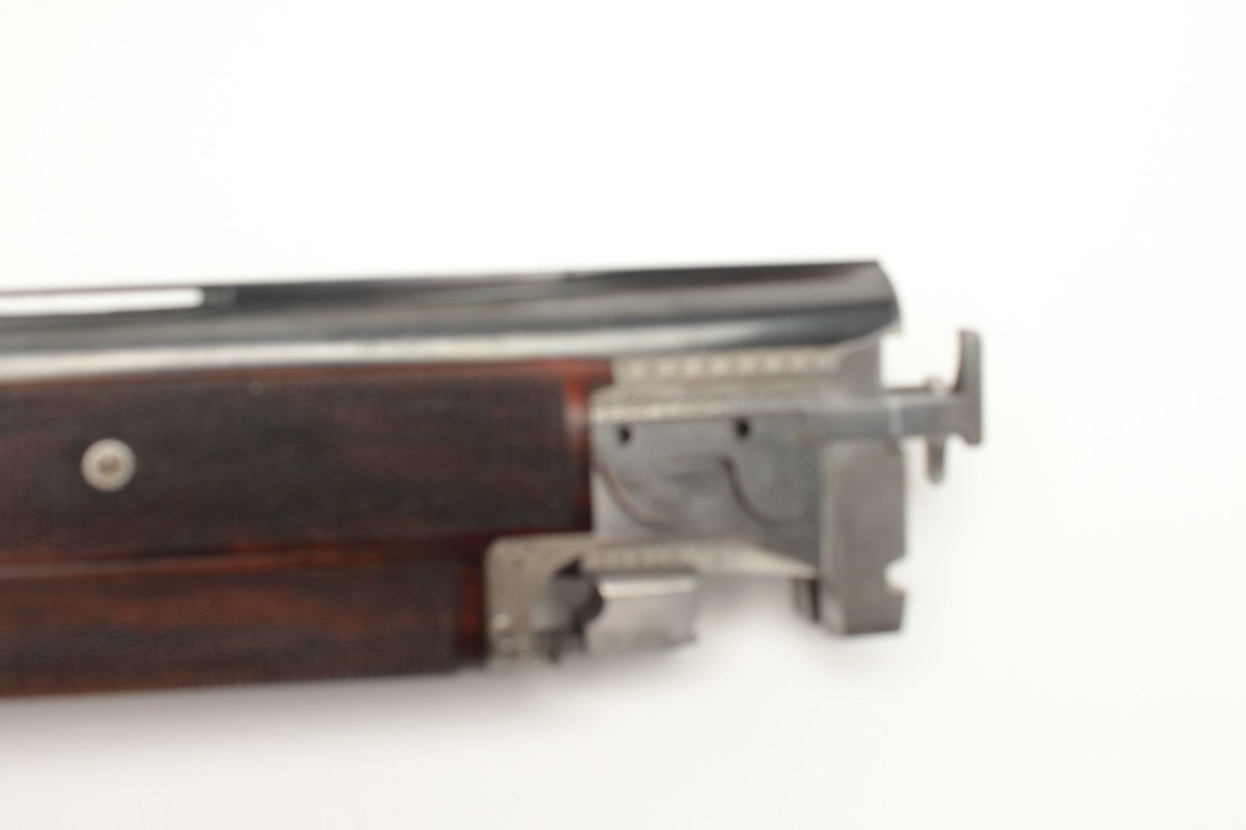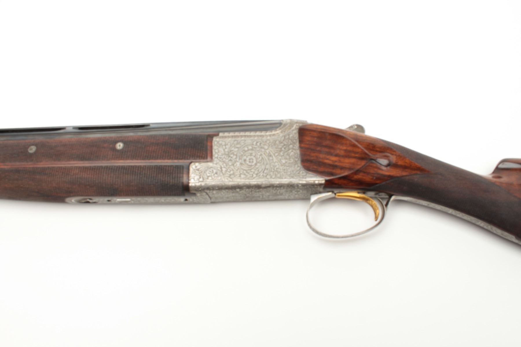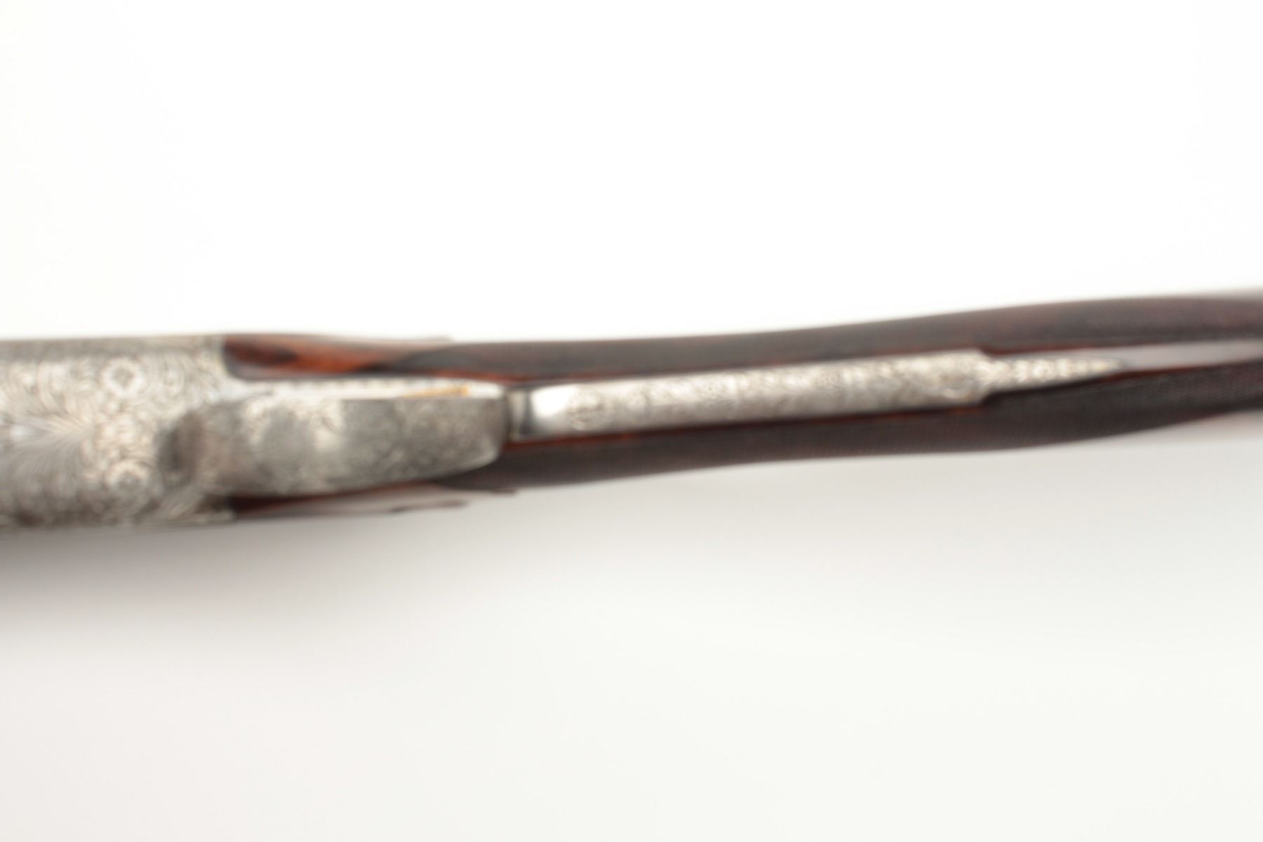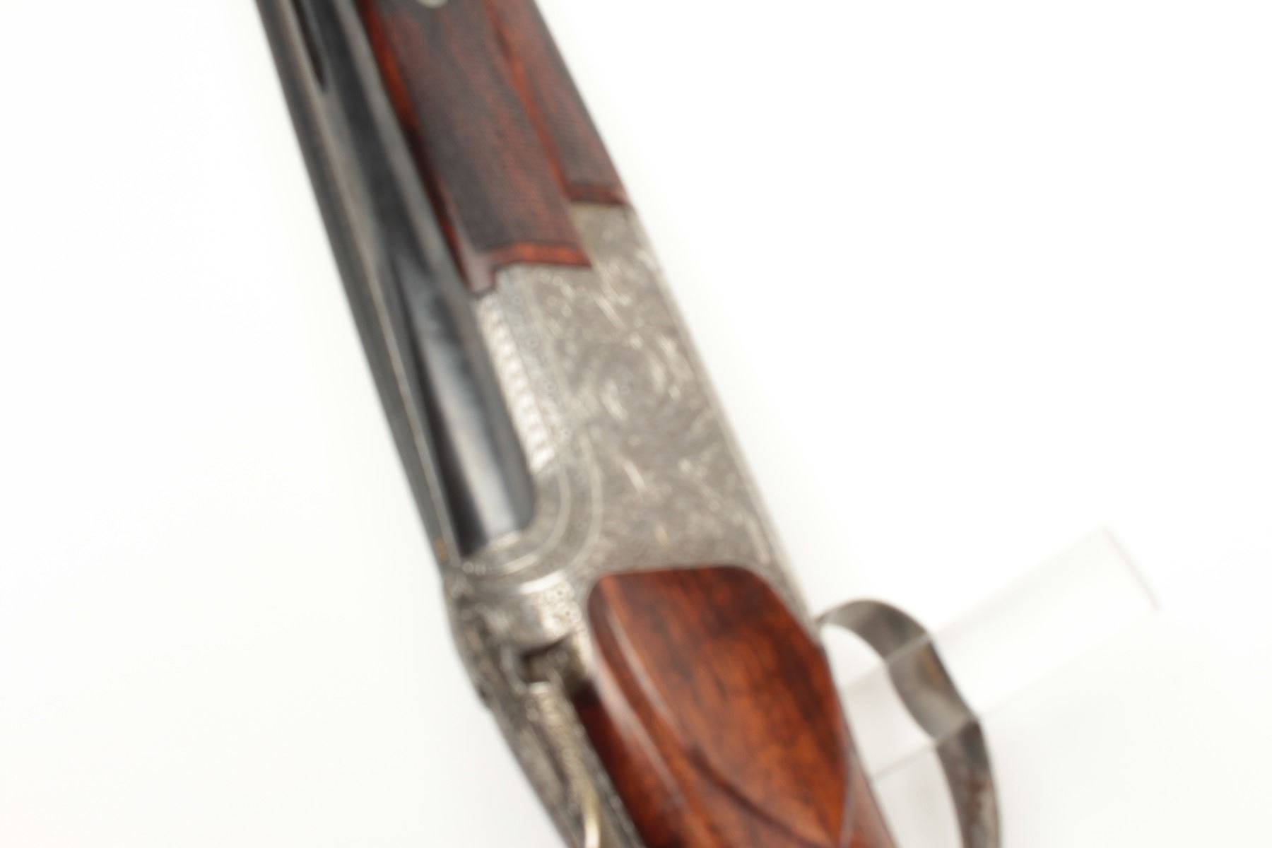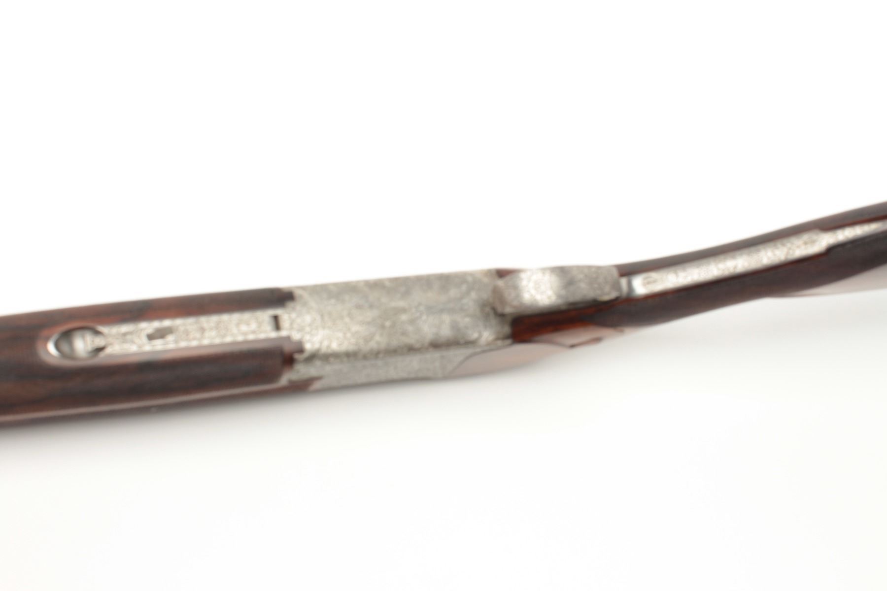 F.N. Custom workshop B25 O/U Belgium made 12GA shotgun, 2 barrel set and elaborately scroll engraved, S/N 18194-73. The engraving is signed J. Lodewy at the bottom left of the frame. Barrel #1 is 27 ½” with a low riseand hand filed rib with split forend. Both barrels are choked improved cylinder. Barrel #2 is 27 ½” with the same configurations, split forend, matching numbers and choked modified/modified both barrels. Singletrigger and auto ejectors. The stocks are select burl walnut with fine checkering on forends, wrist, and English style wood butt. 14 ½” pull and approximately 1 ¼” drop at the comb and 1 ½” at the heel. Perch bellyEuropean style buttstock. The metal surfaces remain in near fine condition with 95%-98% original finish showing minor loss and slight use. The stock needs repair and restoration with one forend having a crack (Pieceretained and easy repair). The buttstock shows a hair line crack and weakness at the right side of the wrist. An extremely expensive and fine set that would be in excess of $25,000 to replace with a long
