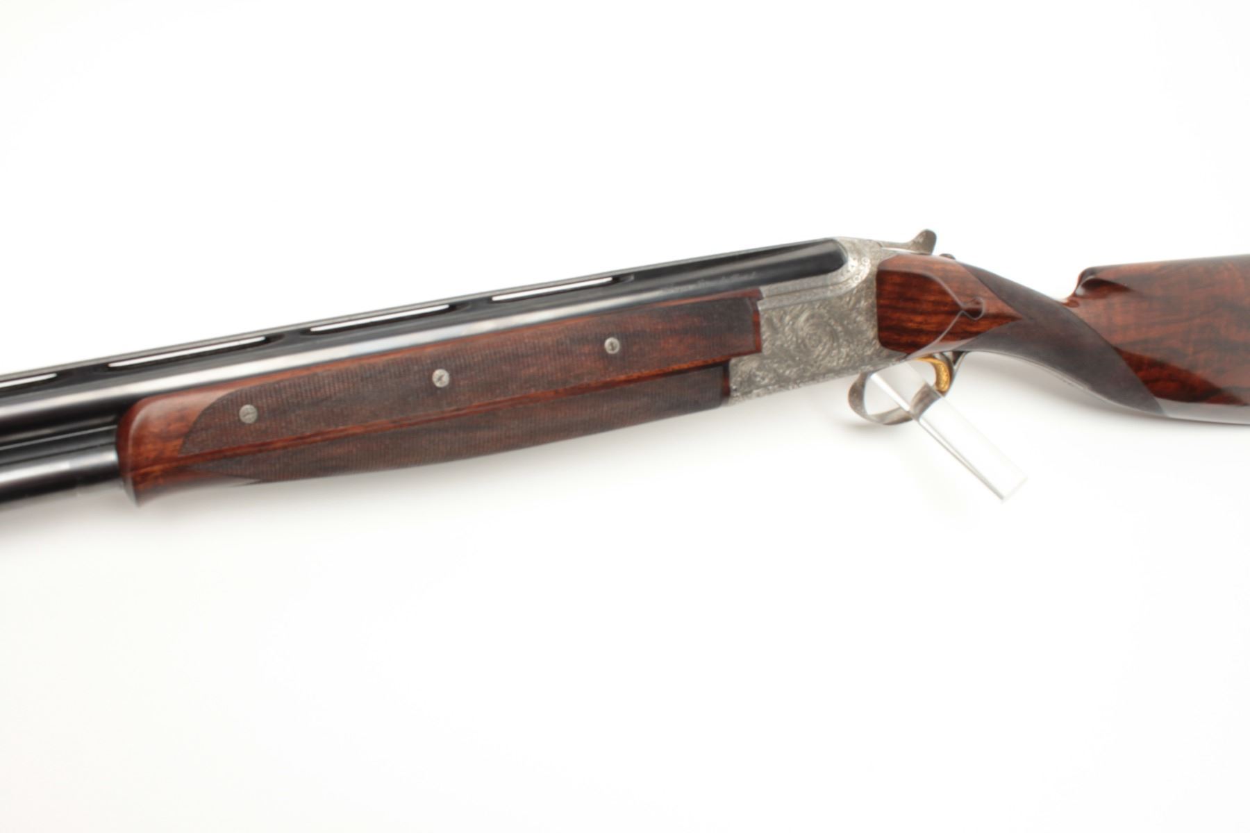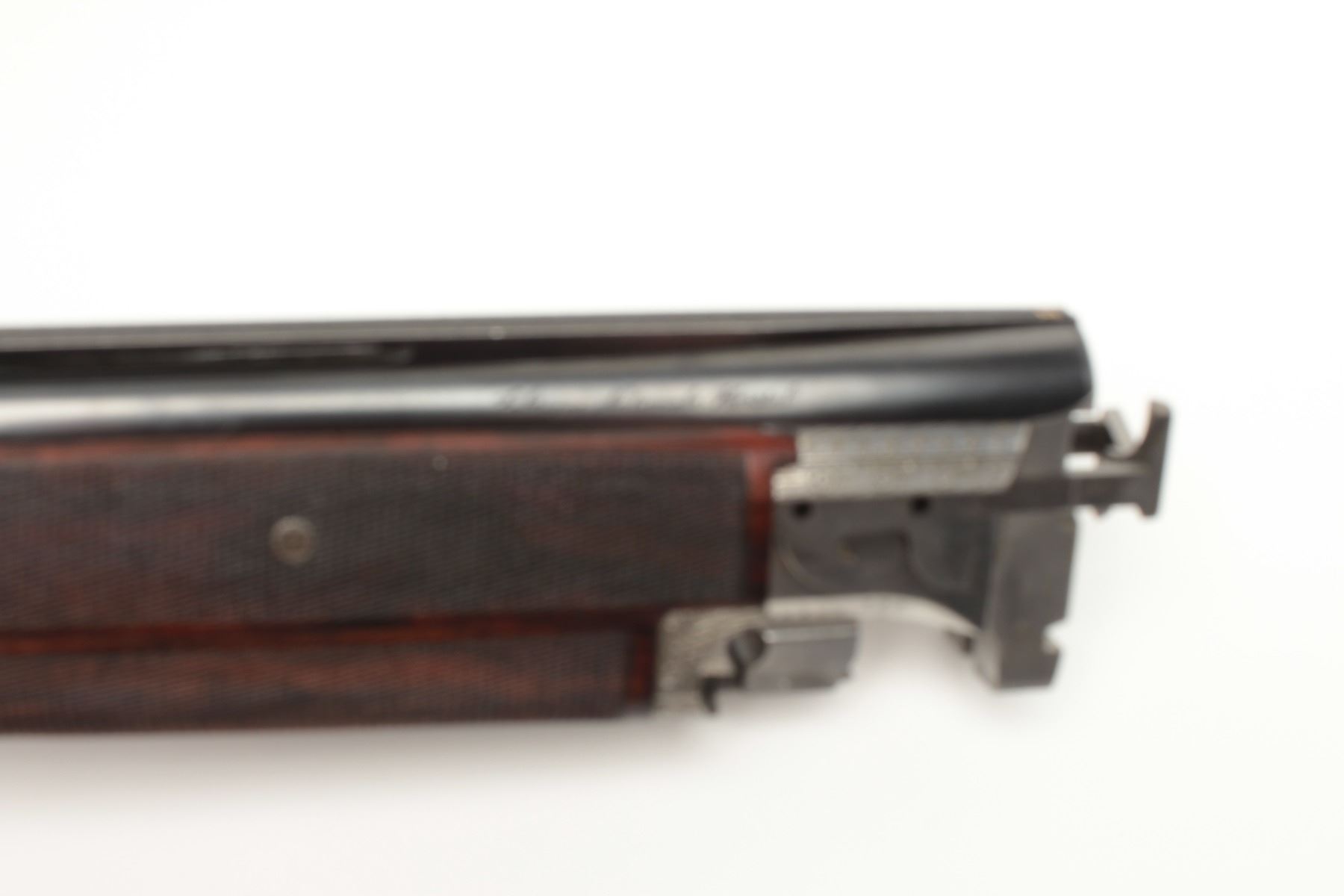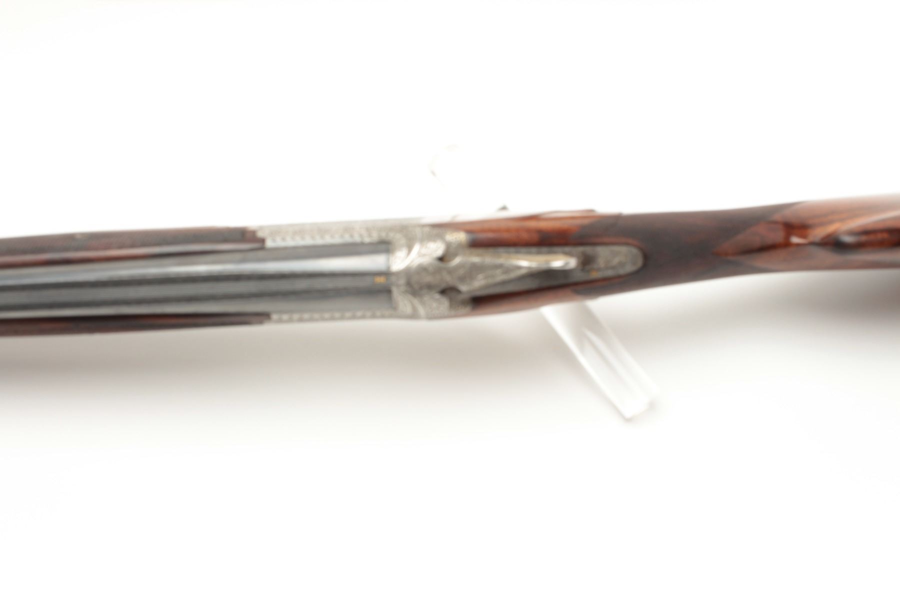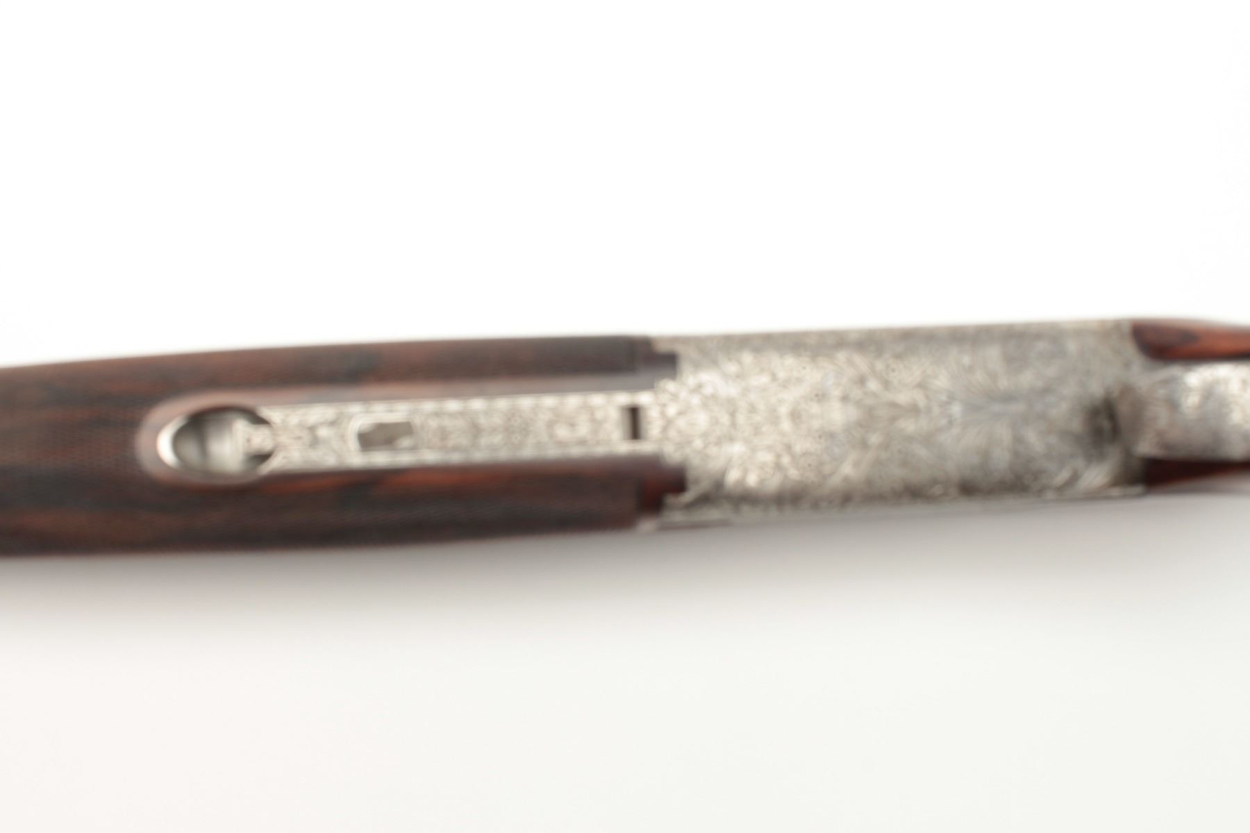 F.N. Custom workshop B25 O/U Belgium made 12GA shotgun, 2 barrel set and elaborately scroll engraved, S/N 18194-73. The engraving is signed J. Lodewy at the bottom left of the frame. Barrel #1 is 27 ½” with a low riseand hand filed rib with split forend. Both barrels are choked improved cylinder. Barrel #2 is 27 ½” with the same configurations, split forend, matching numbers and choked modified/modified both barrels. Singletrigger and auto ejectors. The stocks are select burl walnut with fine checkering on forends, wrist, and English style wood butt. 14 ½” pull and approximately 1 ¼” drop at the comb and 1 ½” at the heel. Perch bellyEuropean style buttstock. The metal surfaces remain in near fine condition with 95%-98% original finish showing minor loss and slight use. The stock needs repair and restoration with one forend having a crack (Pieceretained and easy repair). The buttstock shows a hair line crack and weakness at the right side of the wrist. An extremely expensive and fine set that would be in excess of $25,000 to replace with a long