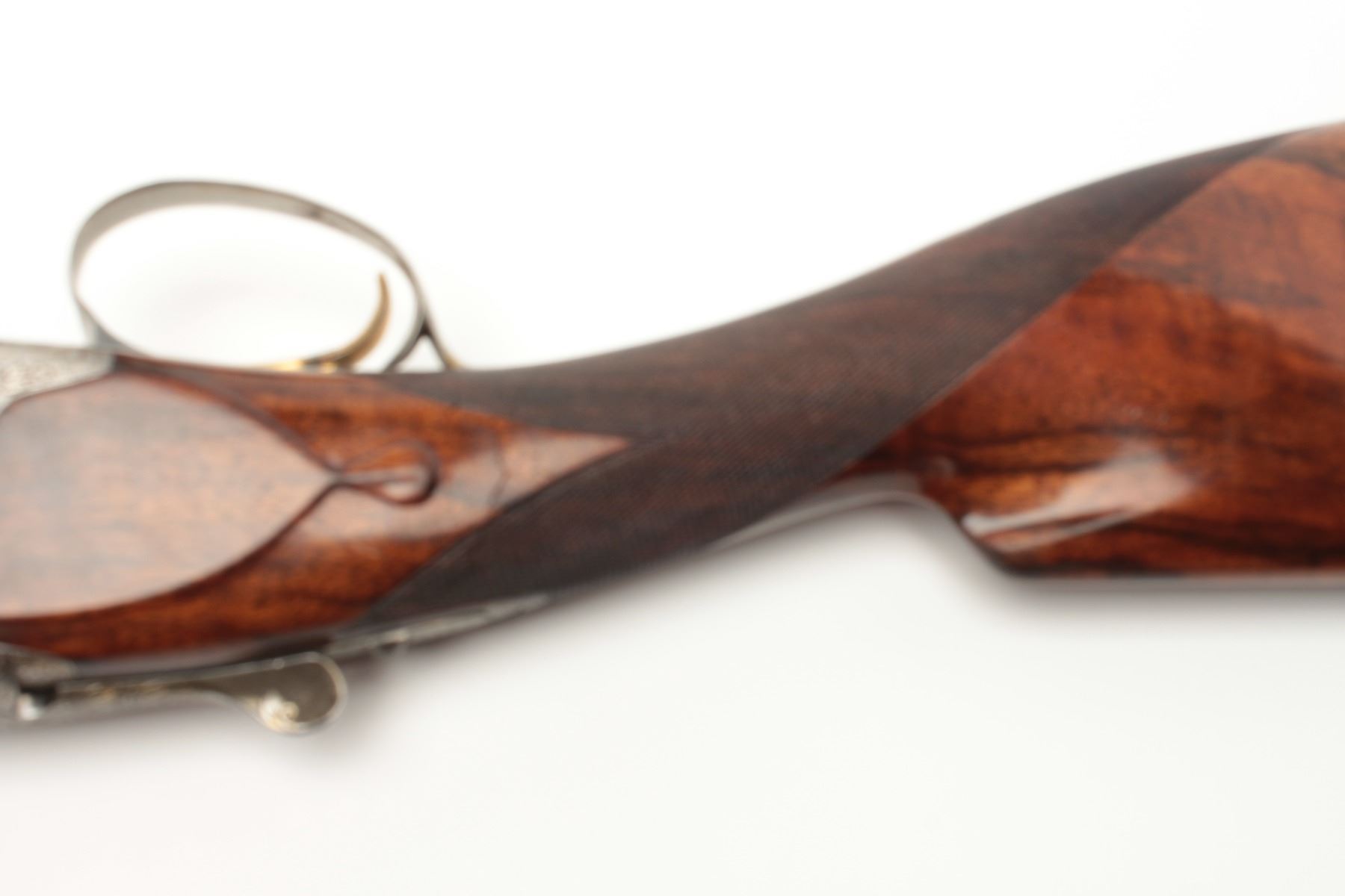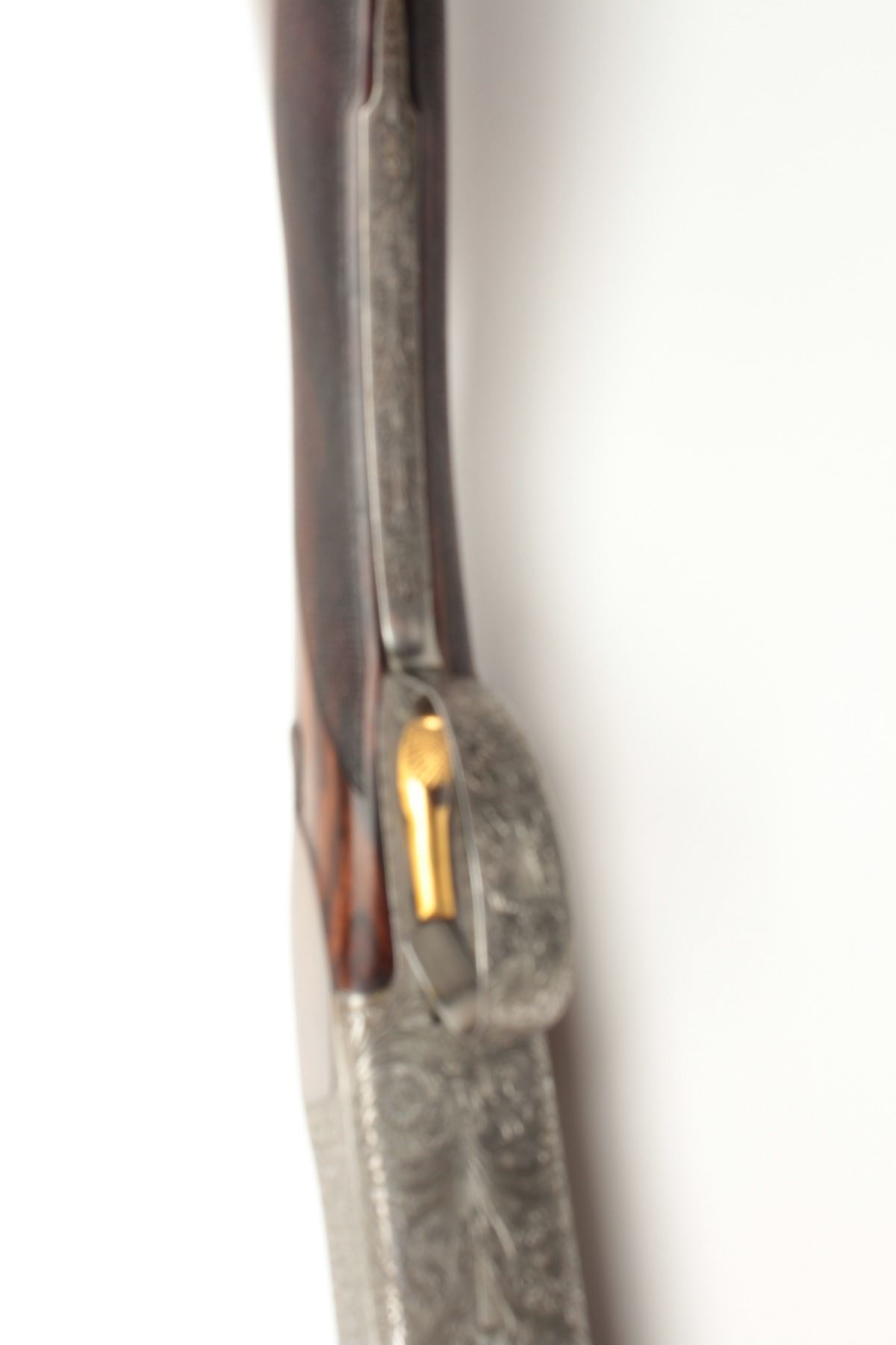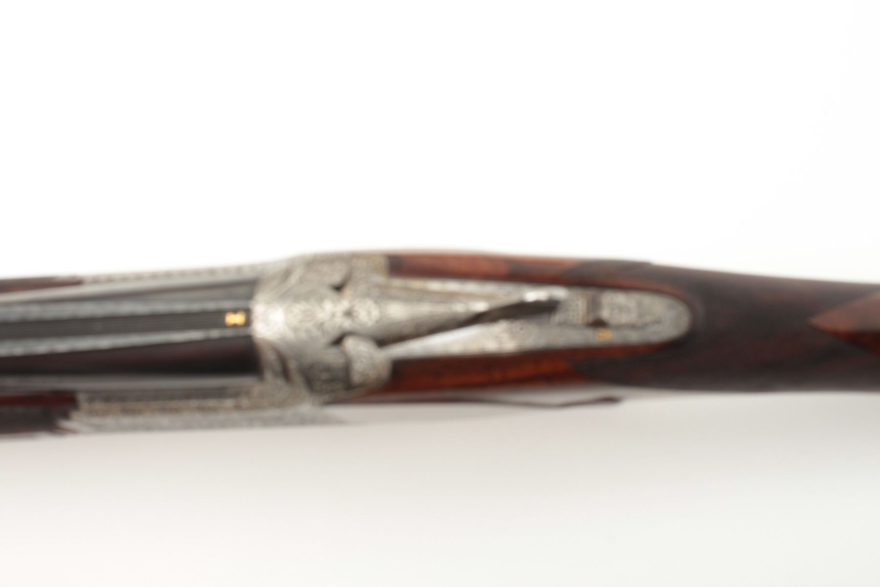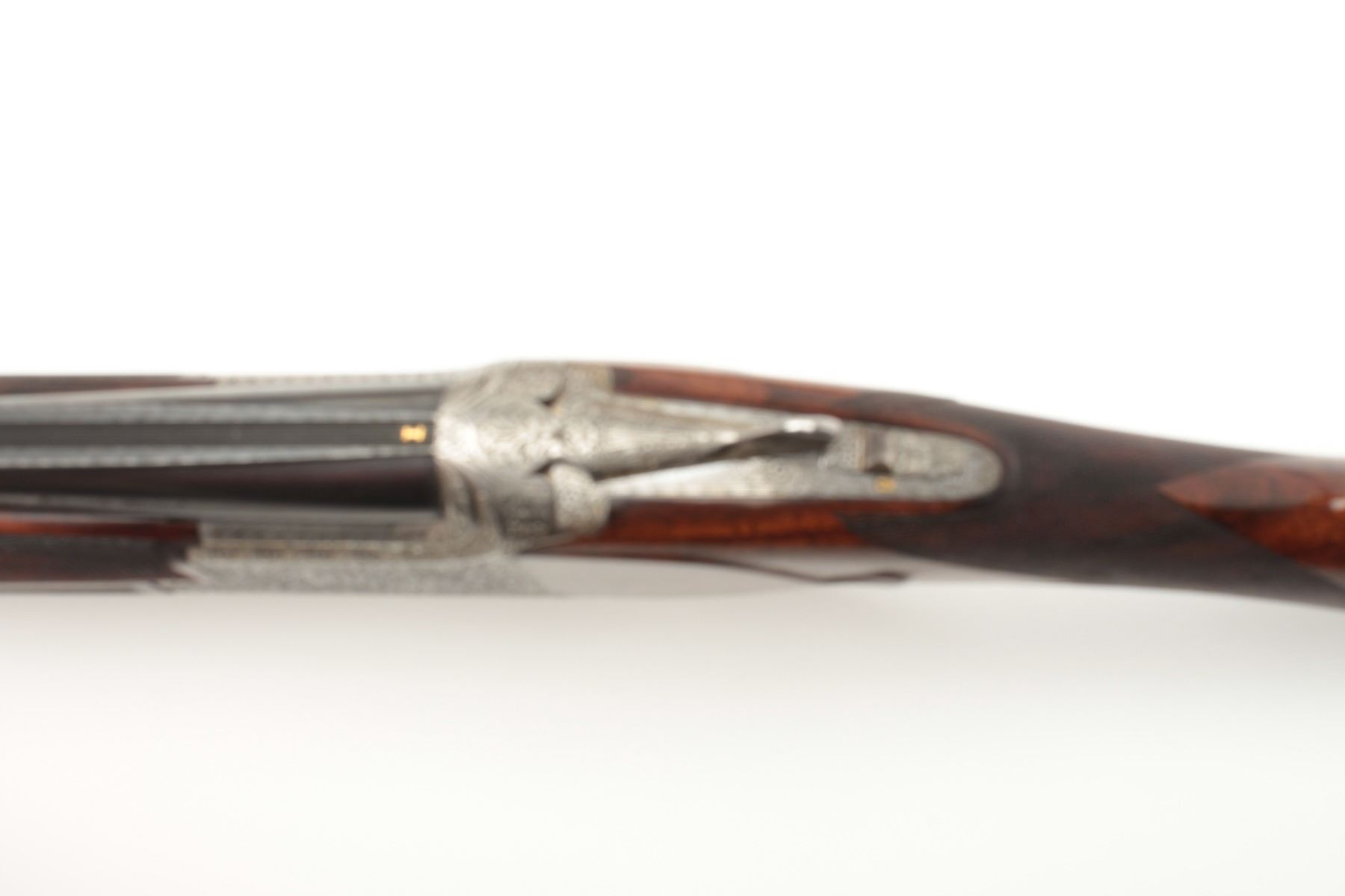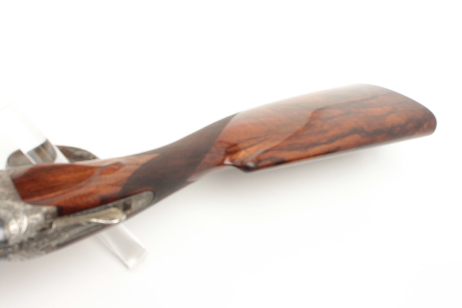 F.N. Custom workshop B25 O/U Belgium made 12GA shotgun, 2 barrel set and elaborately scroll engraved, S/N 18194-73. The engraving is signed J. Lodewy at the bottom left of the frame. Barrel #1 is 27 ½” with a low riseand hand filed rib with split forend. Both barrels are choked improved cylinder. Barrel #2 is 27 ½” with the same configurations, split forend, matching numbers and choked modified/modified both barrels. Singletrigger and auto ejectors. The stocks are select burl walnut with fine checkering on forends, wrist, and English style wood butt. 14 ½” pull and approximately 1 ¼” drop at the comb and 1 ½” at the heel. Perch bellyEuropean style buttstock. The metal surfaces remain in near fine condition with 95%-98% original finish showing minor loss and slight use. The stock needs repair and restoration with one forend having a crack (Pieceretained and easy repair). The buttstock shows a hair line crack and weakness at the right side of the wrist. An extremely expensive and fine set that would be in excess of $25,000 to replace with a long