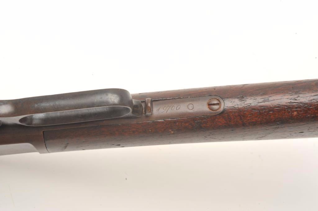 Winchester 1st Model 1873 lever action rifle, .44-40, 28” round barrel, plain trigger, wood stocks with 4-piece cleaning rod in butt trap, S/N 19760, in overall very good condition showing a dark brown patina onmetal surfaces, crisp action, very good bore, sharp markings and very good wood stocks displaying some old mars and scratches from carry and storage. Accompanied by a 2001-dated factory letter in frame confirming features and indicating received in warehouse on August 28, 1877 and shipped on July 6, 1878 to order #12316. (Antique). Est.: $5,000-$10,000.