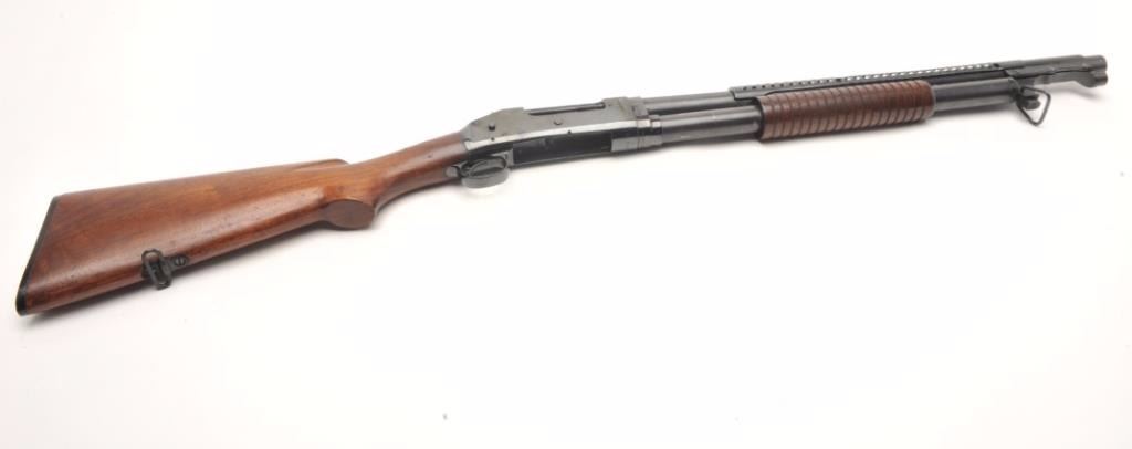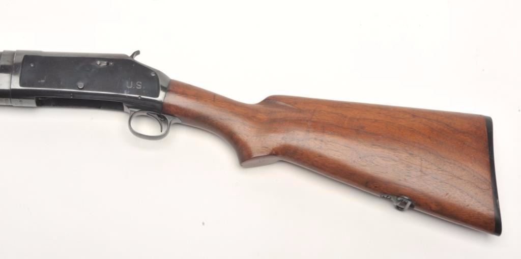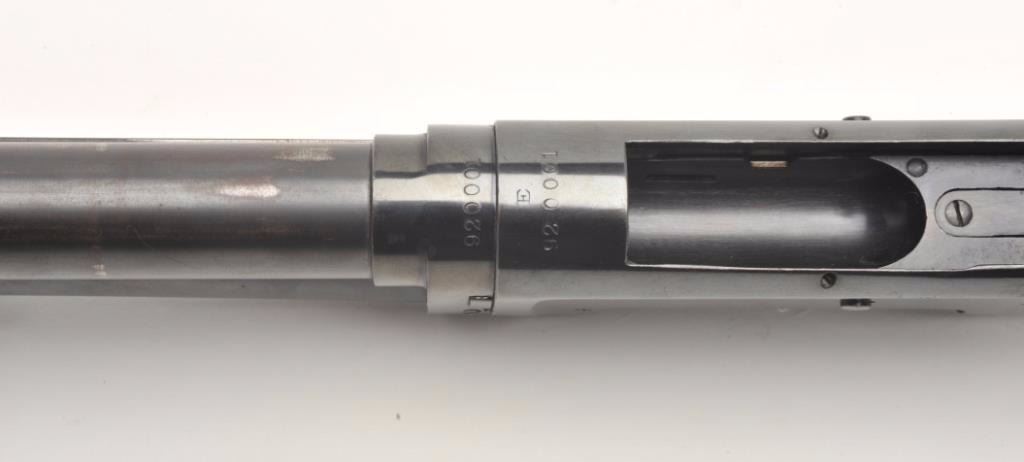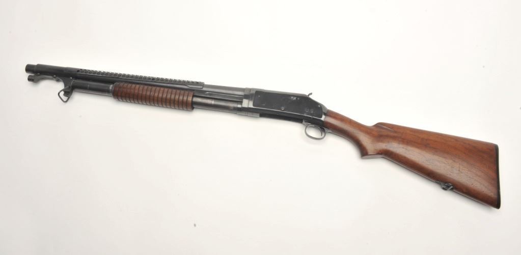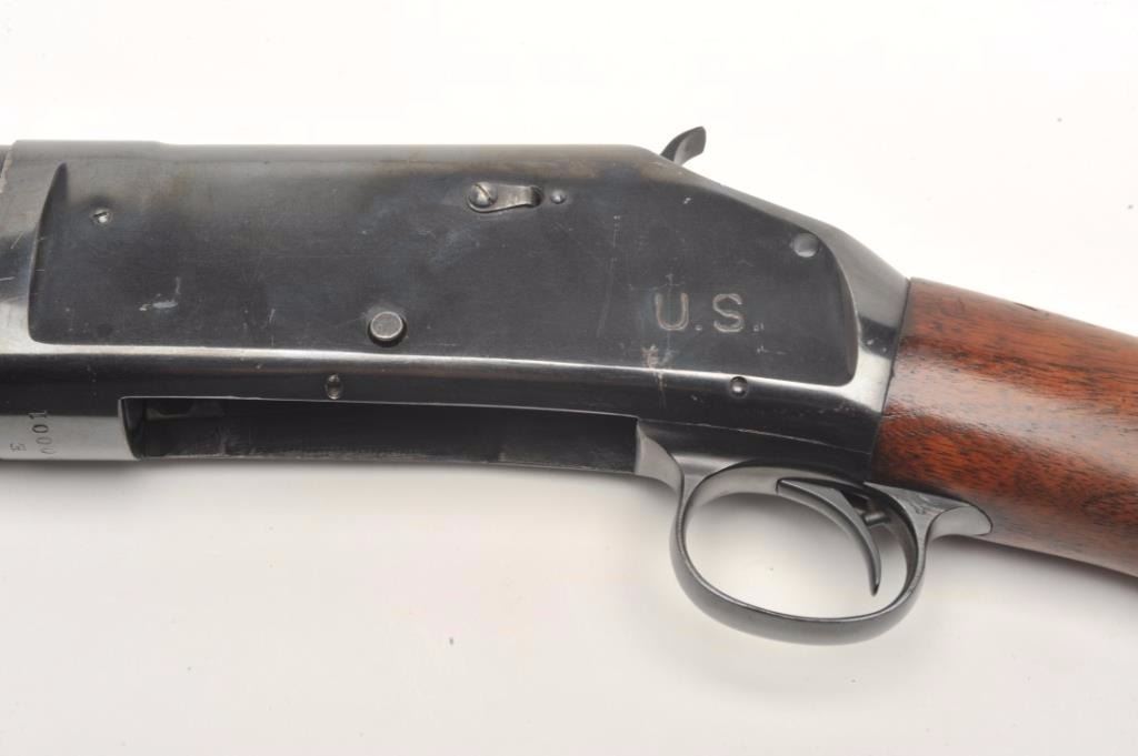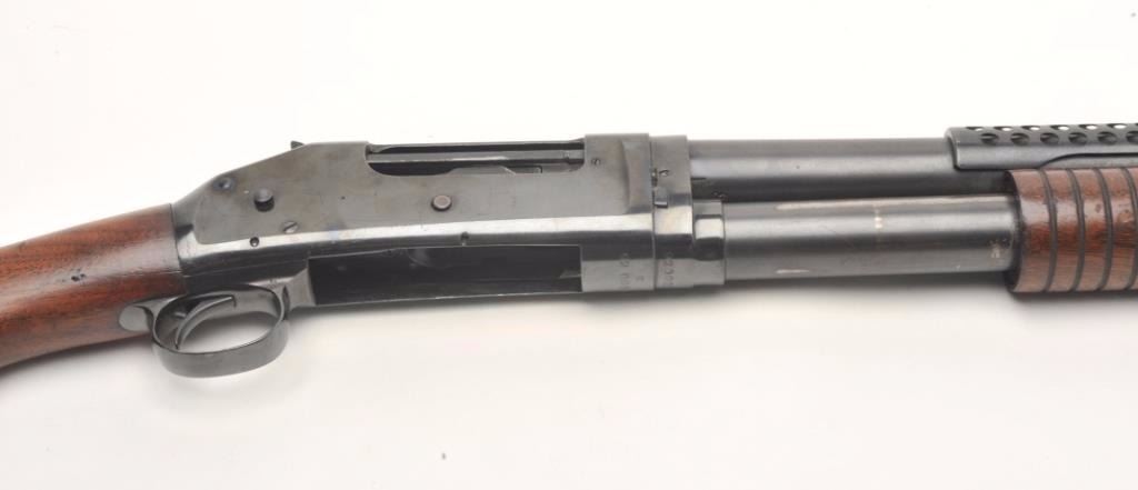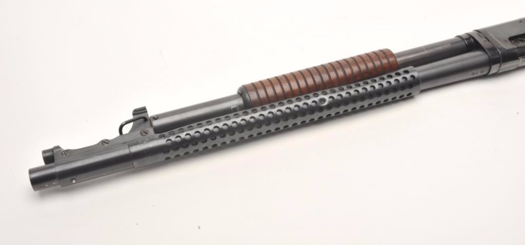 Winchester Model 97 pump action takedown “trench” shotgun with ventilated barrel guard, 12 gauge, cylinder choked, 21” barrel, blued finish, wood stocks, U.S.-marked frame (left rear side), flaming bomb proof mark on top of barrel at breech plus 2 Winchester proof marks, one on the top front of the receiver and one on the breech end of the barrel near the flaming bomb proof, S/N E920001. This gun is in overall very good to fine condition with the majority of its original finish remaining, fine bore, crisp action and markings with very good to near fine wood. (C&R/PPT). Est.: $1,500-$3,000.