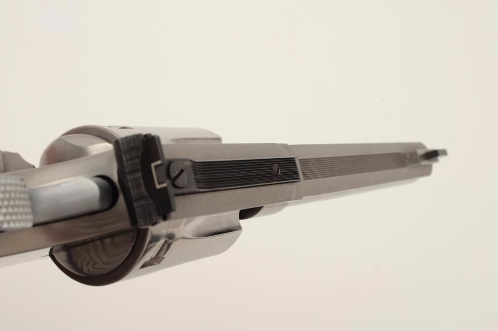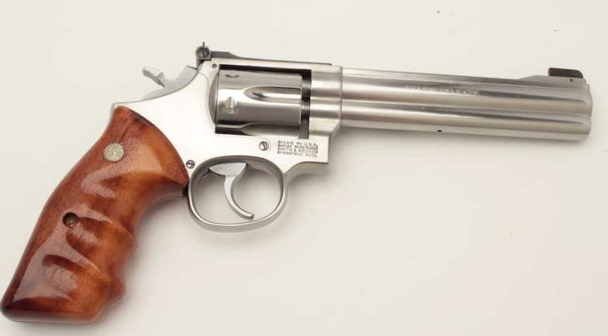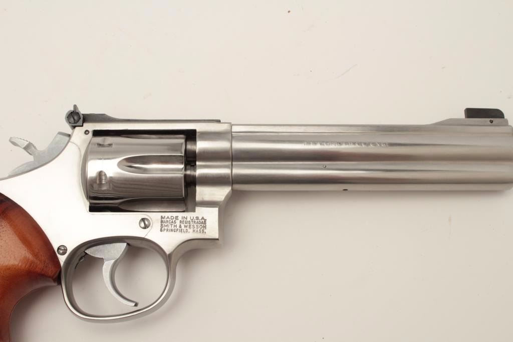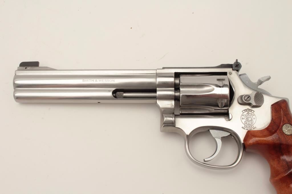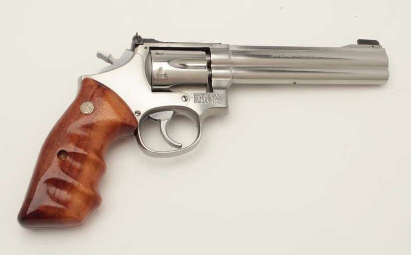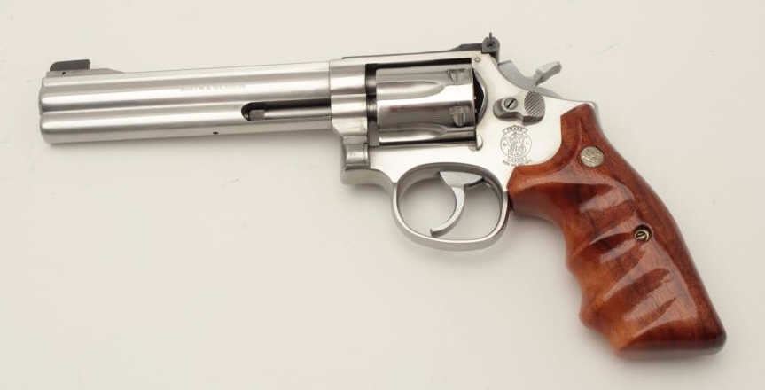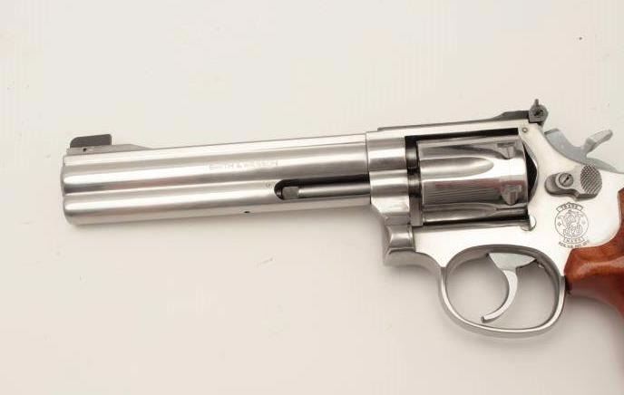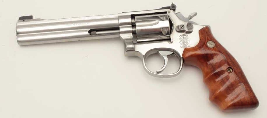 Lot 226 Smith & Wesson Model 617 DA revolver, .22LR caliber, 6” barrel, stainless, finger groove wood meda
