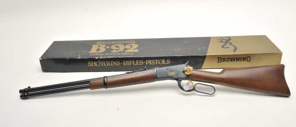 Browning Model B-92 lever action SRC Centennial (1878-1978), .44 Rem. Mag. caliber, 20” barrel, blued finish, wood stocks, S/N 1878B-3899, in like new condition with instructions manual and factorycardboard box with inserts. (Modern). Est.: $600-$1,200.