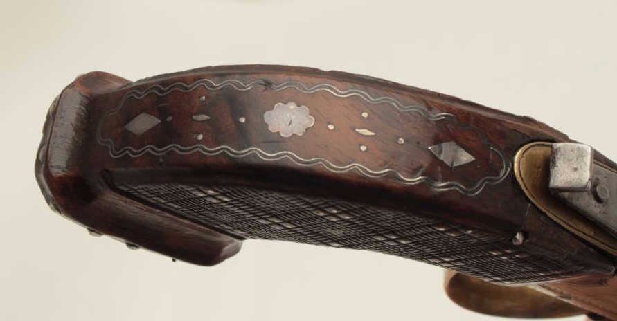 Ketland & Co., London-marked pair of all brass O/U tap action flintlock pistols, .41 caliber, 3.5” barrels, checkered and silver decorated wood grips, in overall very good + to near fine condition displaying a pleasingpatina to brass, crisp actions, very good markings and very good to near fine grips. (Antique). Est.: $2,000-$4,000.
