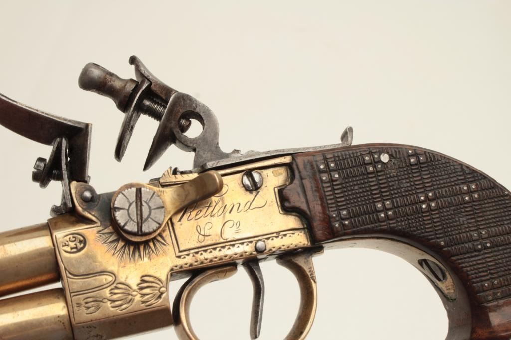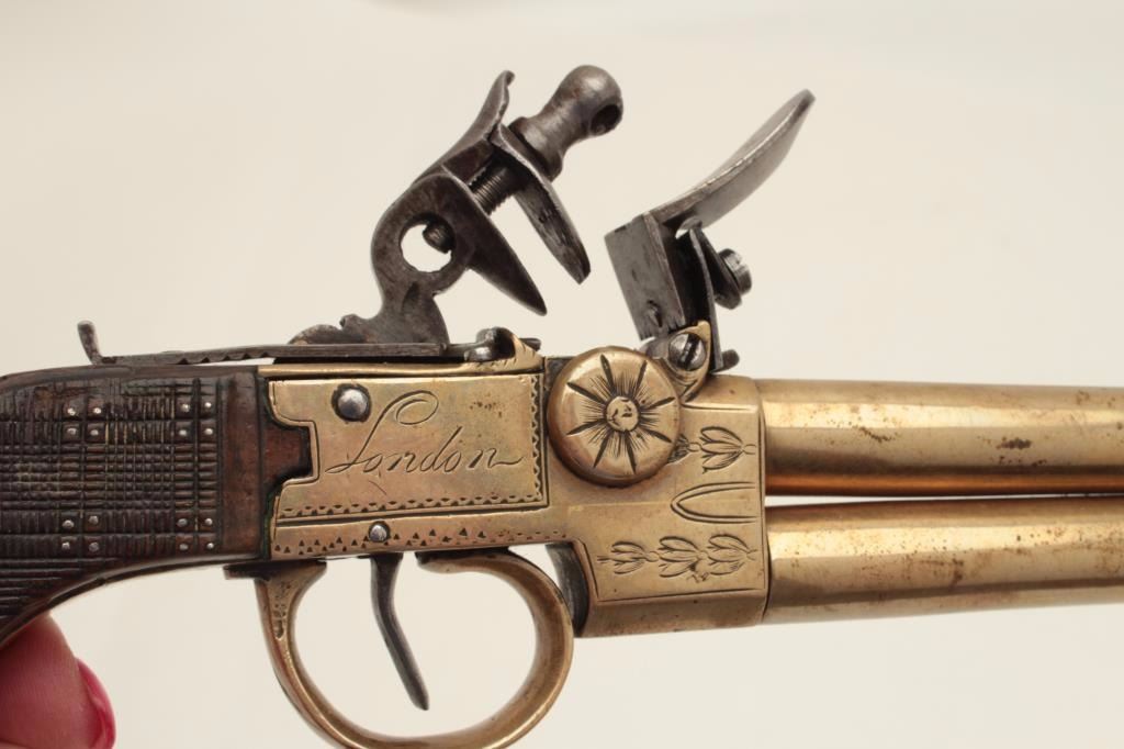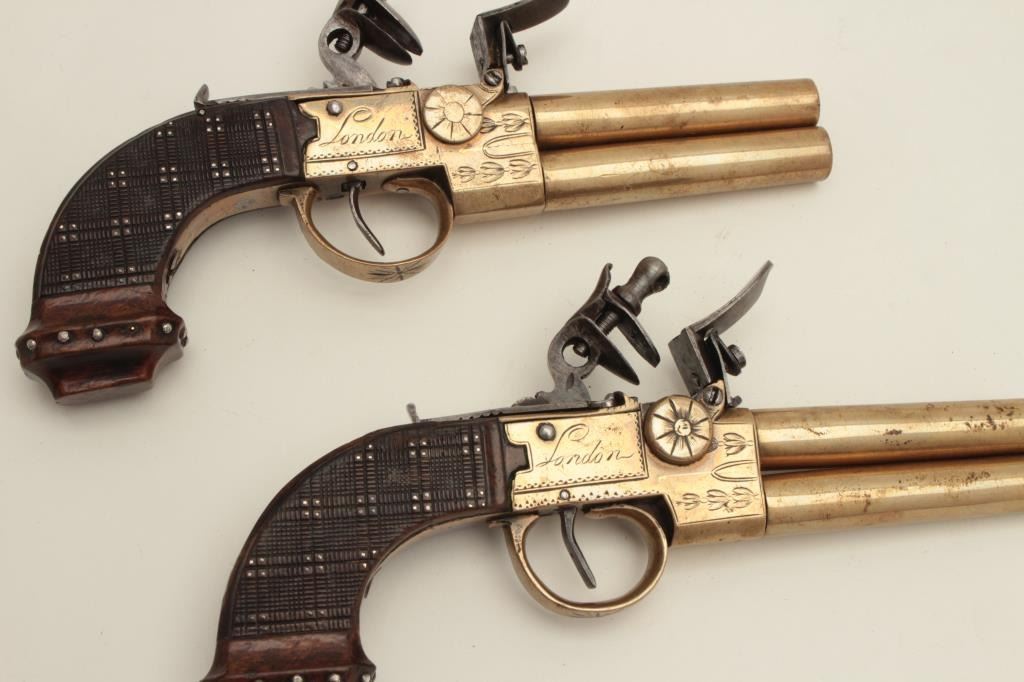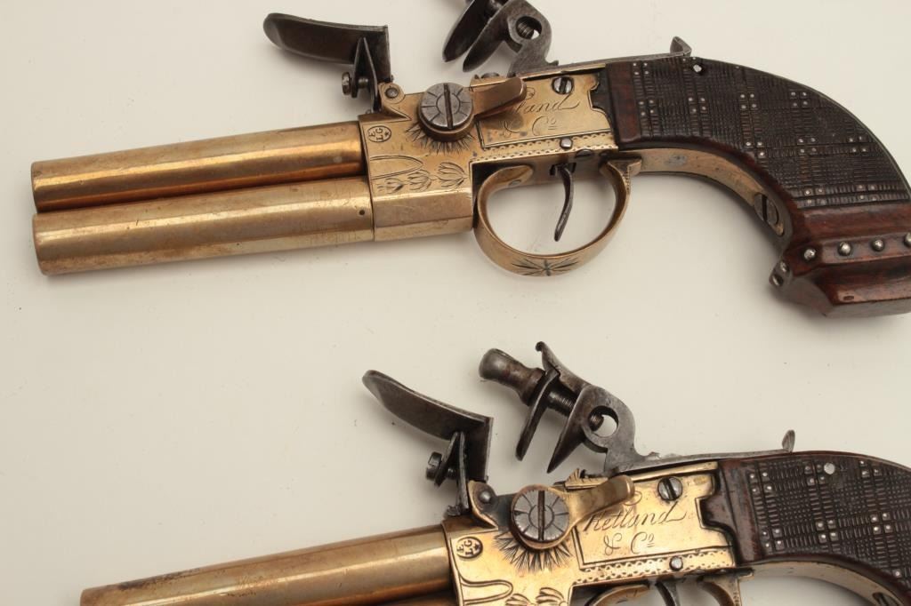 Lot 243 Ketland & Co., London-marked pair of all brass O/U tap action flintlock pistols, .41 caliber, 3.5”