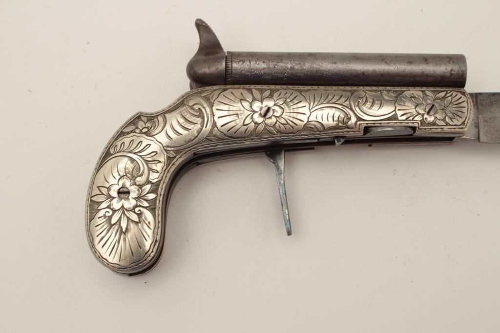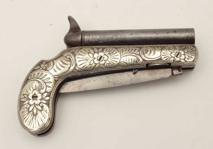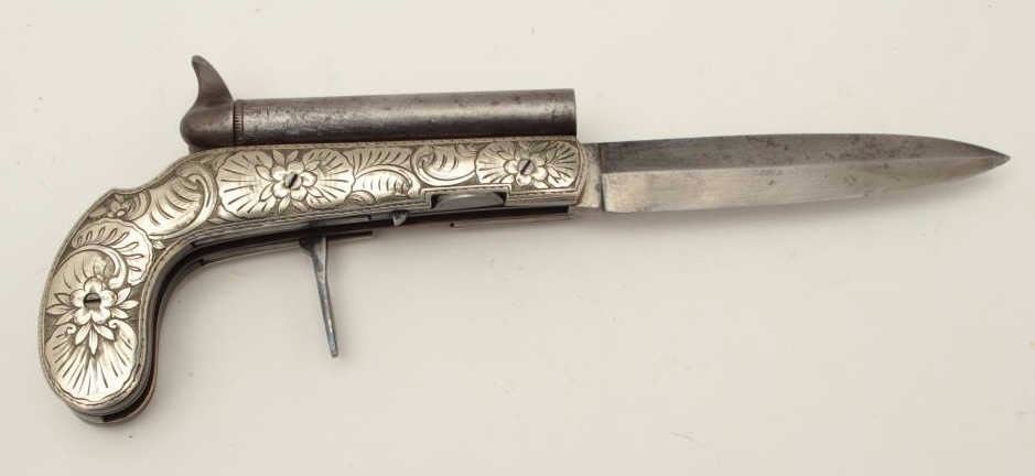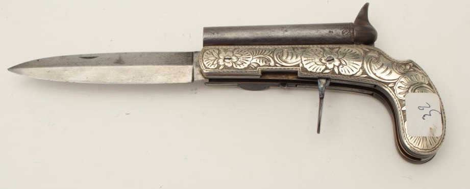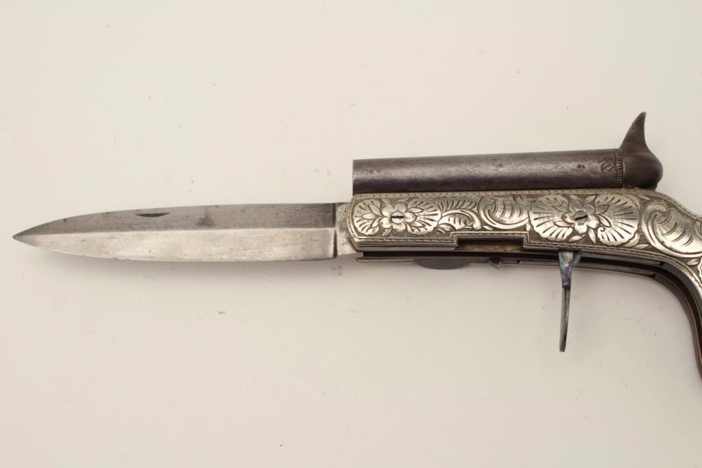 Continental double barrel percussion knife pistol with fancy engraved German silver body circa 1850-60s. Approximately .36 caliber barrels of 3 ¼” mounted SxS with two folding triggers. Bright blue on the triggers andhammers and near fine condition overall. The blade measures approximately 4 ¼”. (Antique) Est.: $2500-$5000