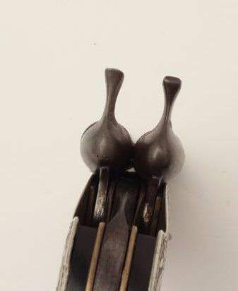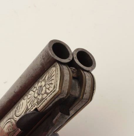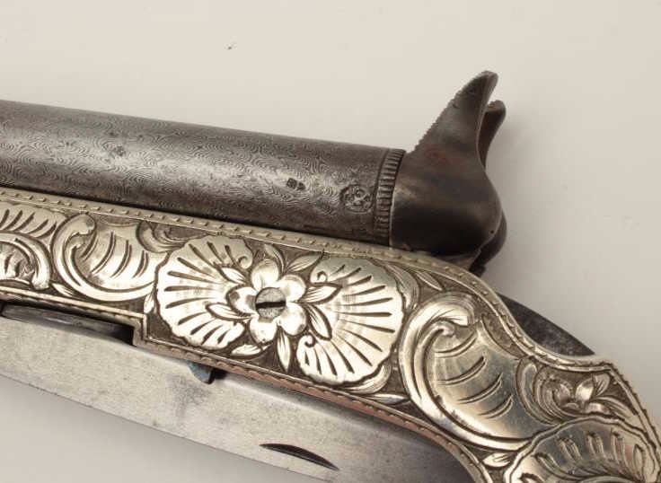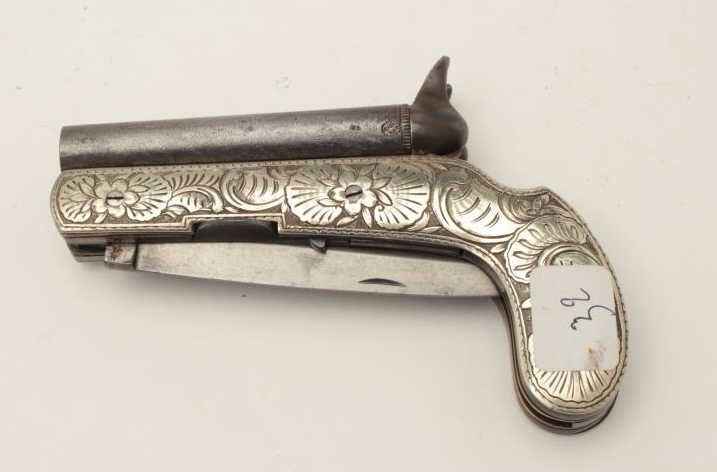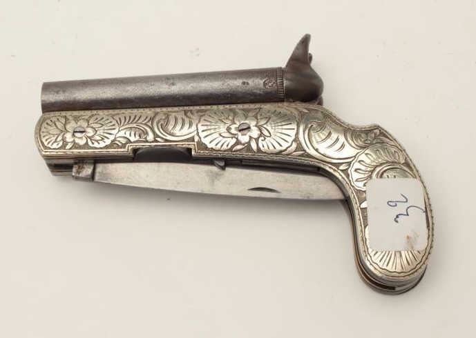 Lot 259 Continental double barrel percussion knife pistol with fancy engraved German silver body circa 185
