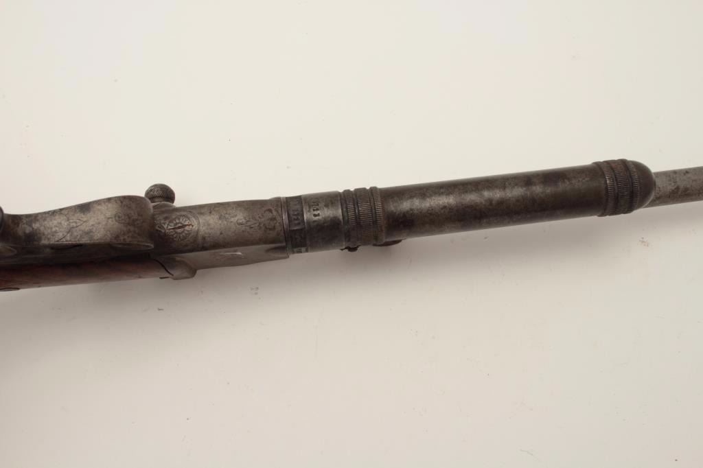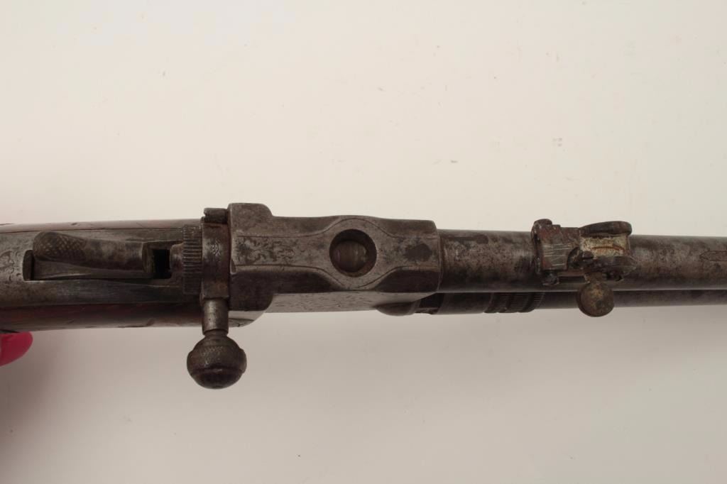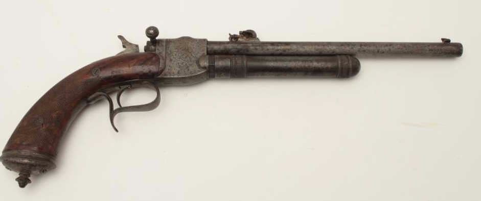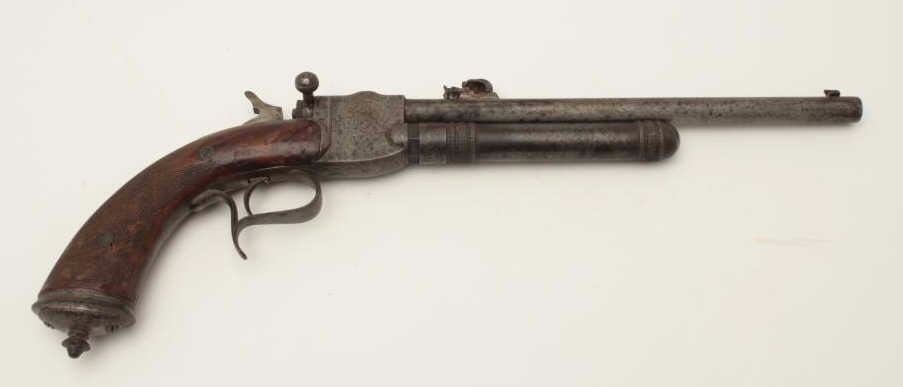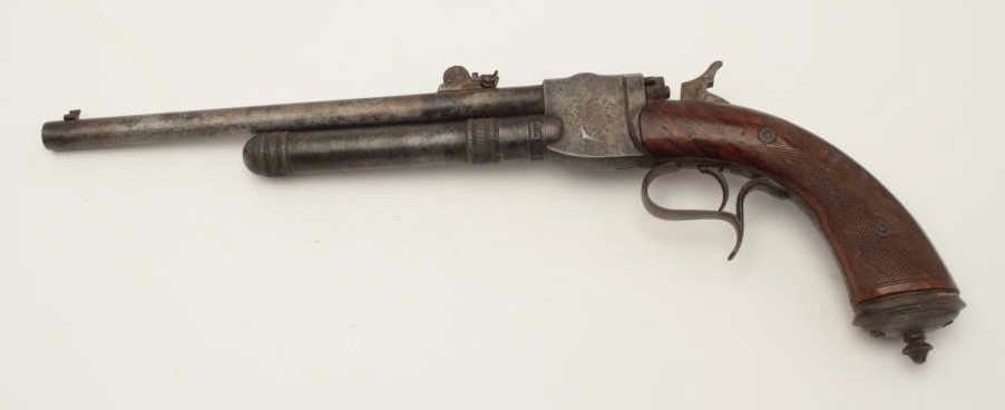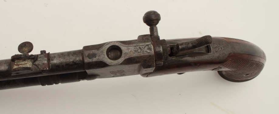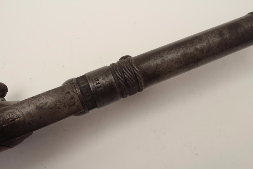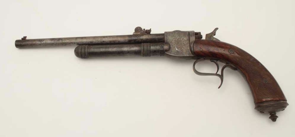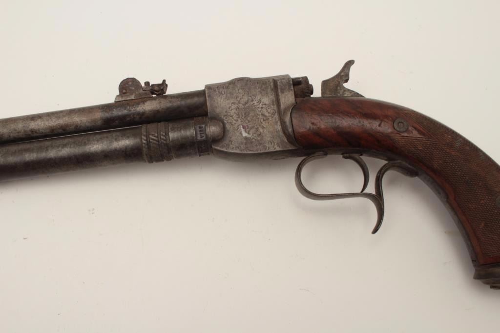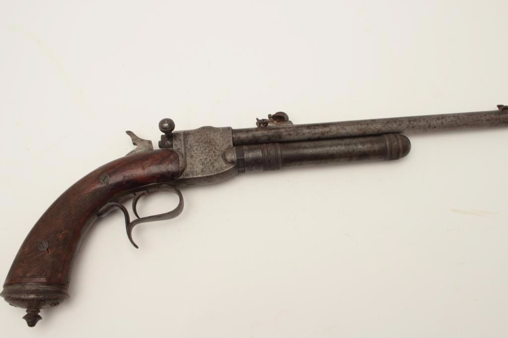 High quality French 19th century air pistol inlaid in gold “St. Etienne on the barrel. Approximately .32 caliber (7.65mm) and measures 18 ½” overall with a 10” barrel along with target quality sights. Engravedframe with checkered wood grip. In good overall condition with normal aging and minor imperfections, S/N 3713 with proofs and unidentified maker’s marks. A removable cylinder is mounted beneath the barrel andunscrews. This cylinder can be charged by a hand pump whivh is not included. Very collectible and scarce. Est.: $1500-$3000