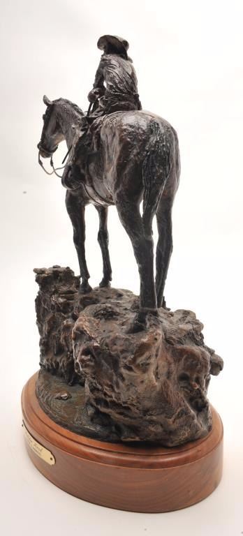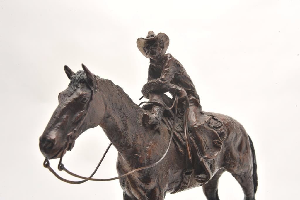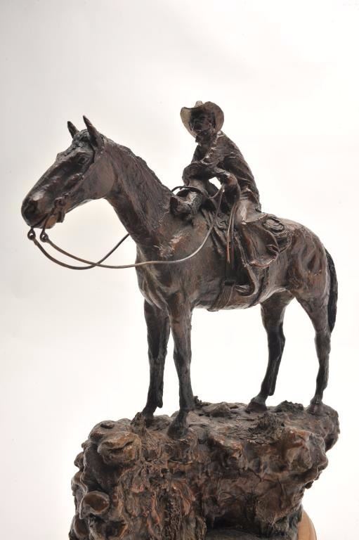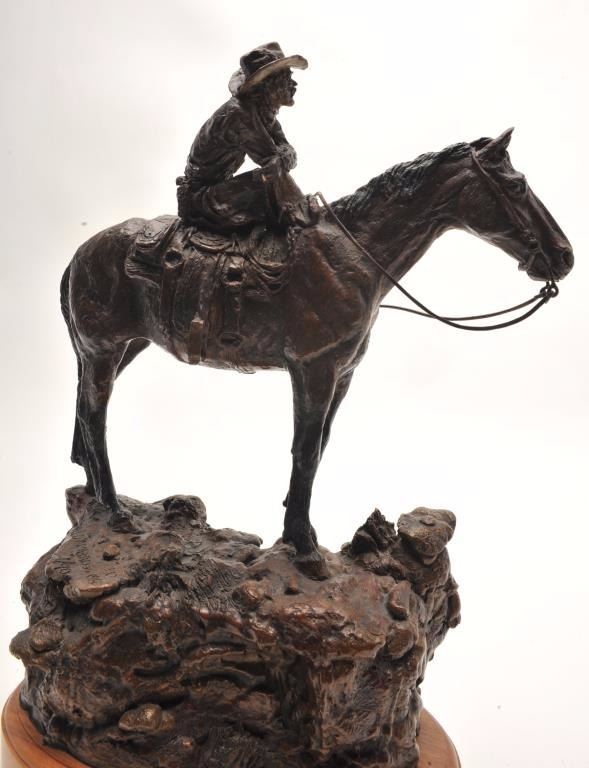 Original bronze entitled “Holdin’ Herd”, #7/40 by well-known artist Jasper D’Ambrosi, approximately 15” in height including wood base; a classic looking cowboy and his horse. Est.: $600-$1,200.