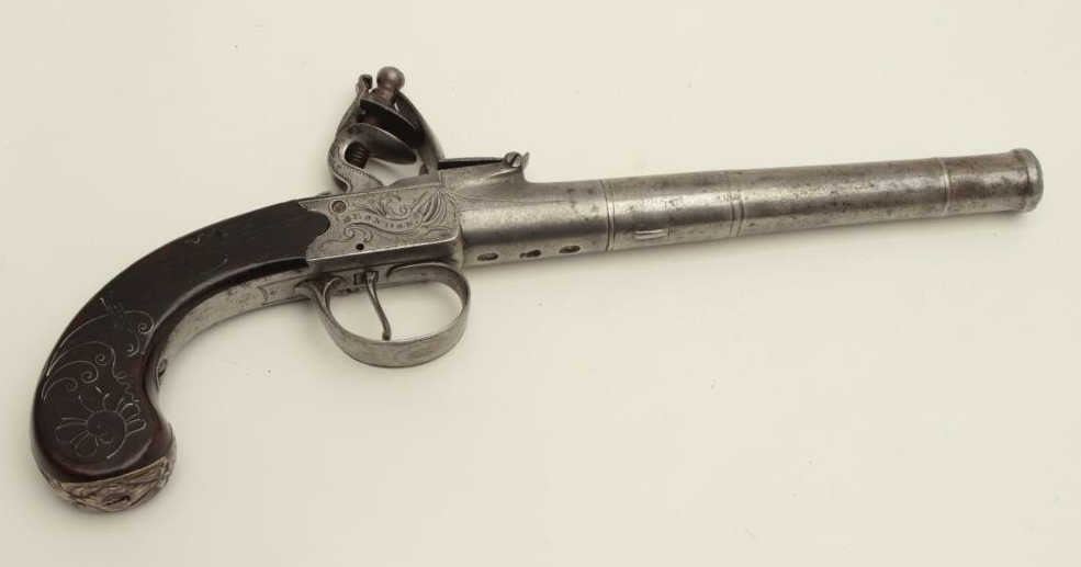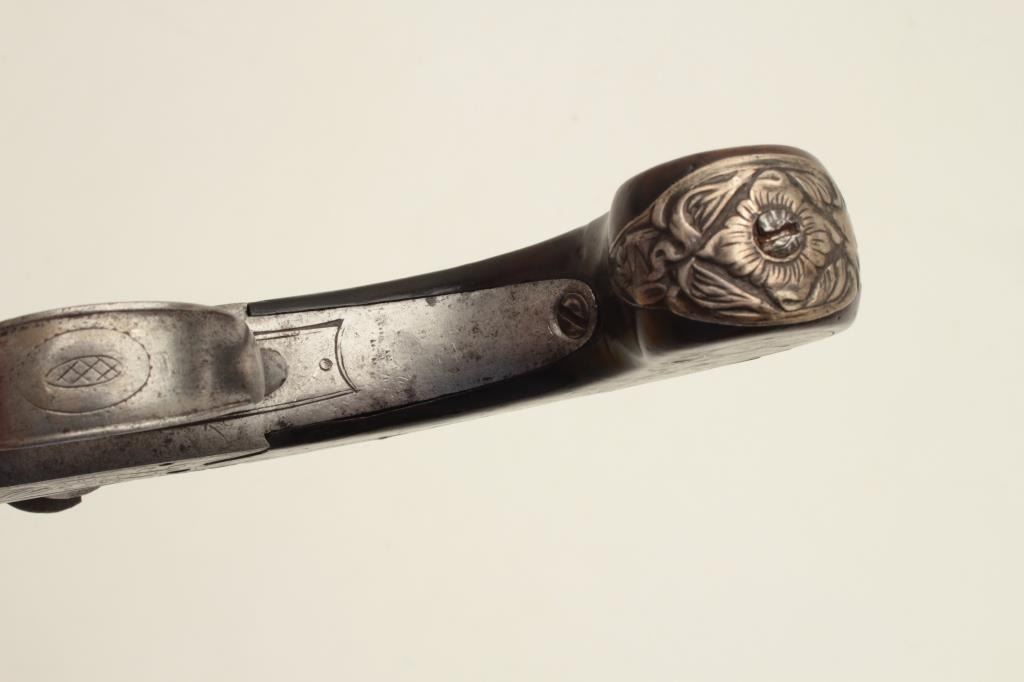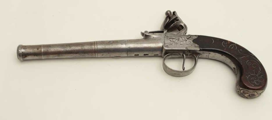 Lot 267 Turney flintlock pistol, center hammer, .58 caliber, 6” screw-off cannon barrel, silver mounted an