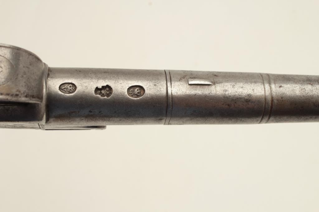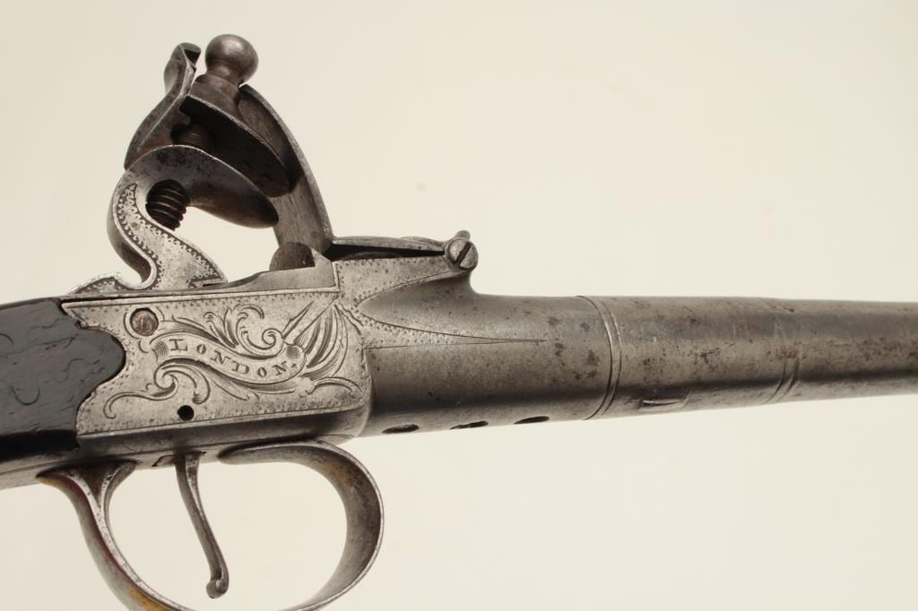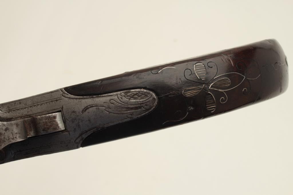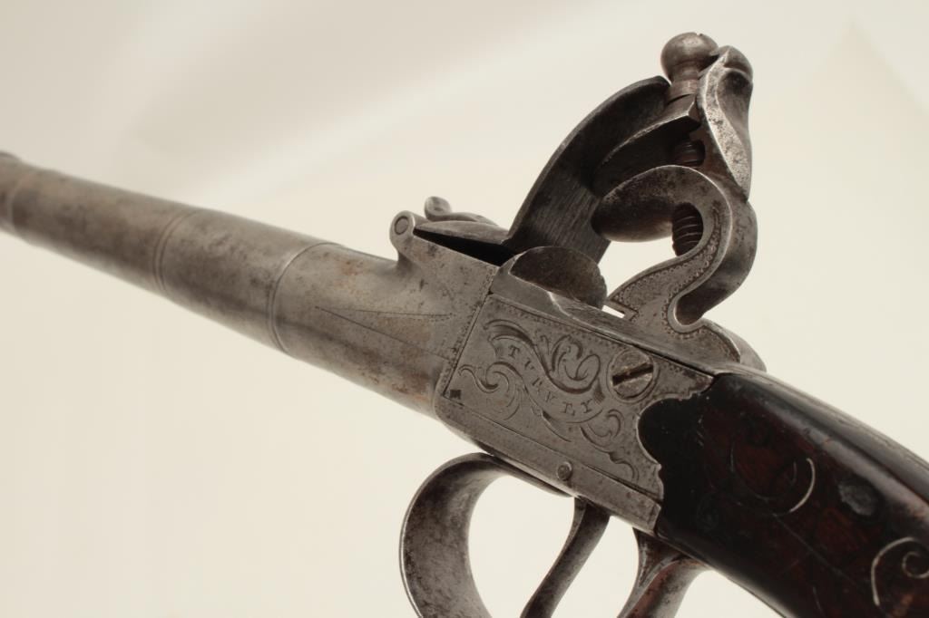 Turney flintlock pistol, center hammer, .58 caliber, 6” screw-off cannon barrel, silver mounted and silver wire inlaid wood grip, mid-1700’s; in overall very good condition with grey patina to metal surfaces, goodaction. (Antique). Est.: $600-$1,200.