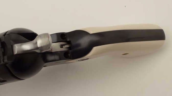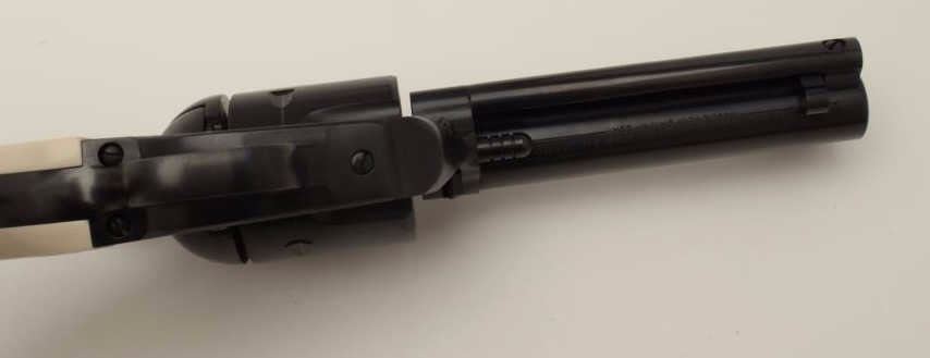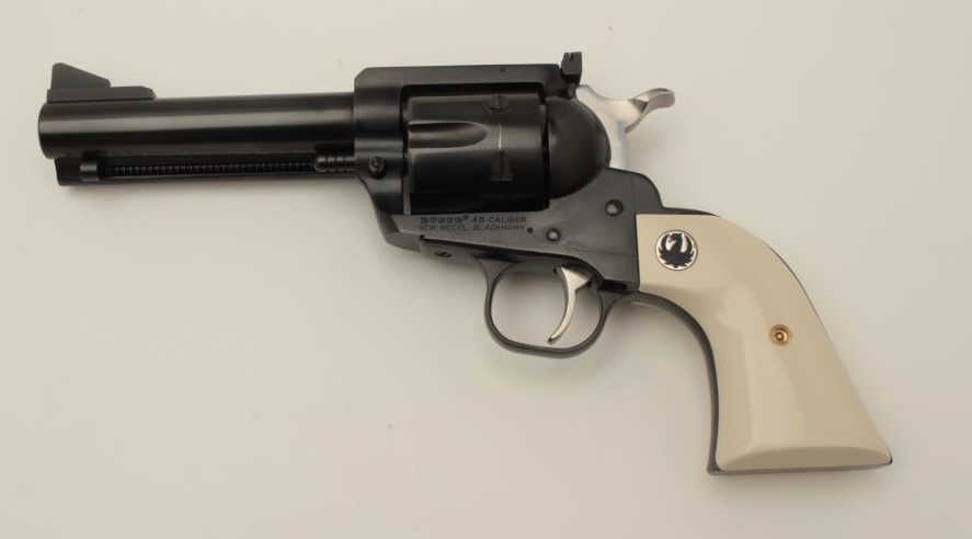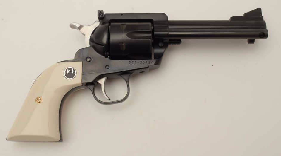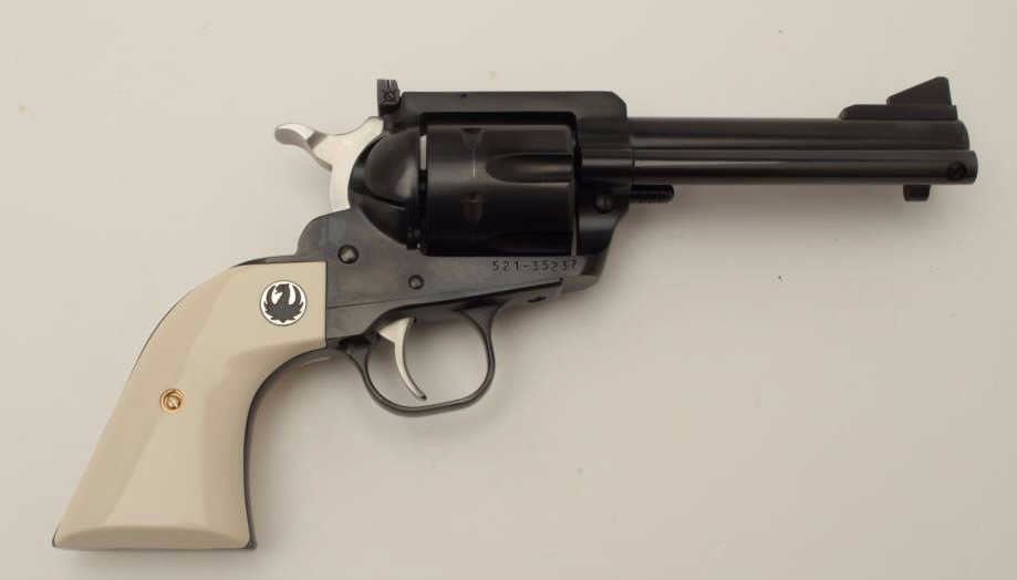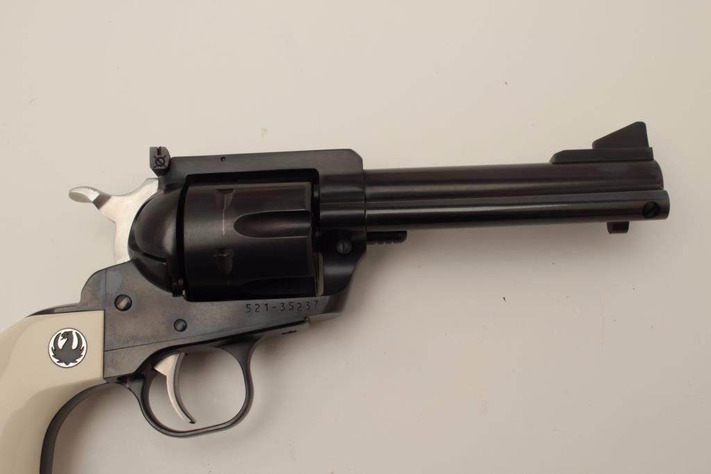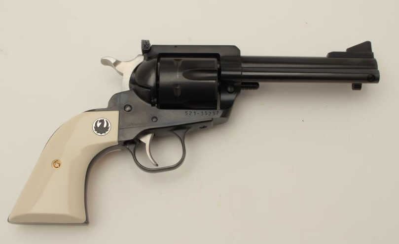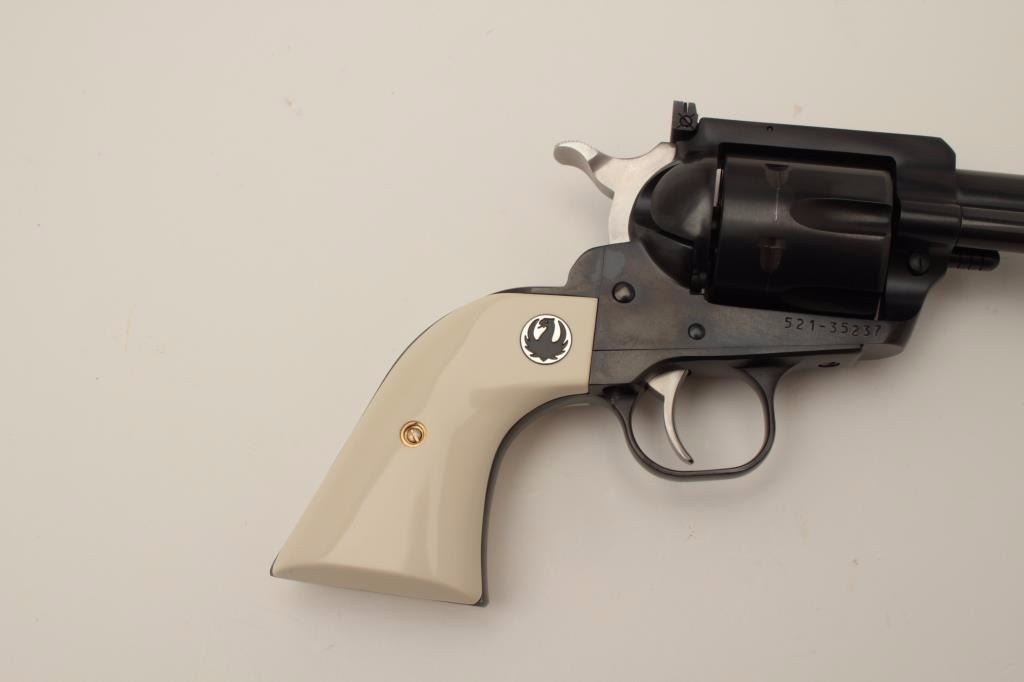 Ruger New Model Blackhawk single action revolver, .45 caliber with extra .45 ACP cylinder, 4.75” barrel, blued finish, faux ivory medallion grips, S/N 521-35237, in overall excellent condition; accompanied byan extra hammer. (Modern/PPT). Est.: $400-$800.