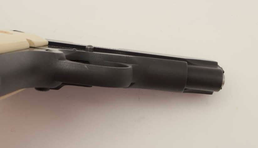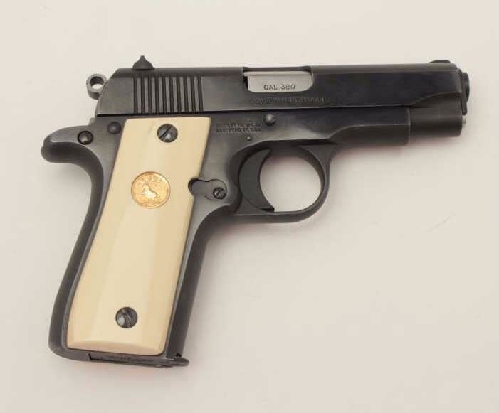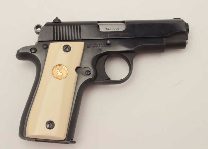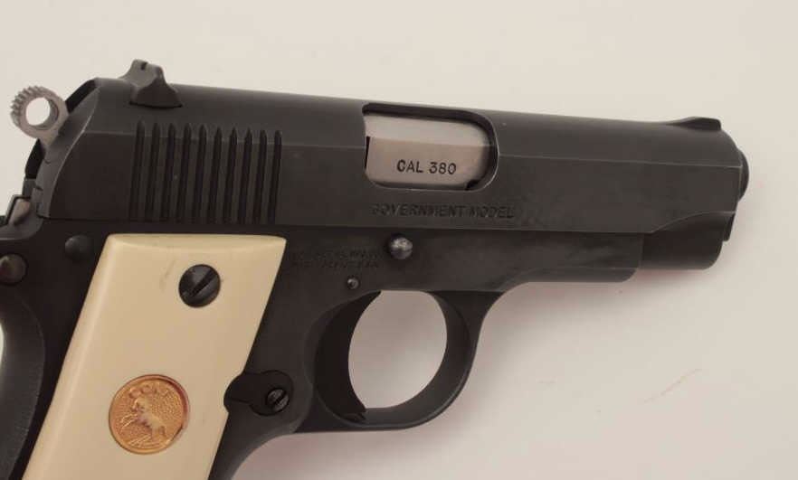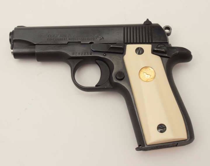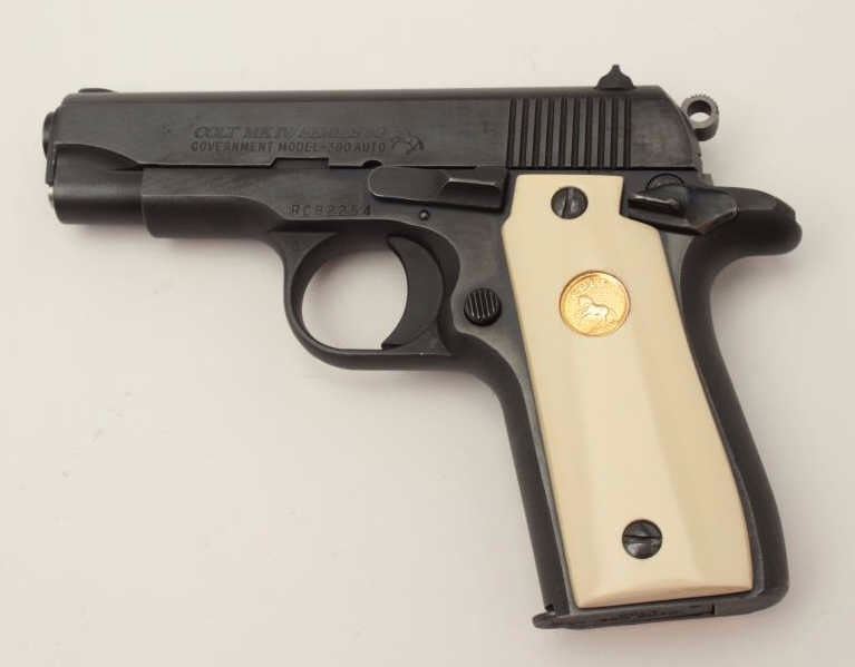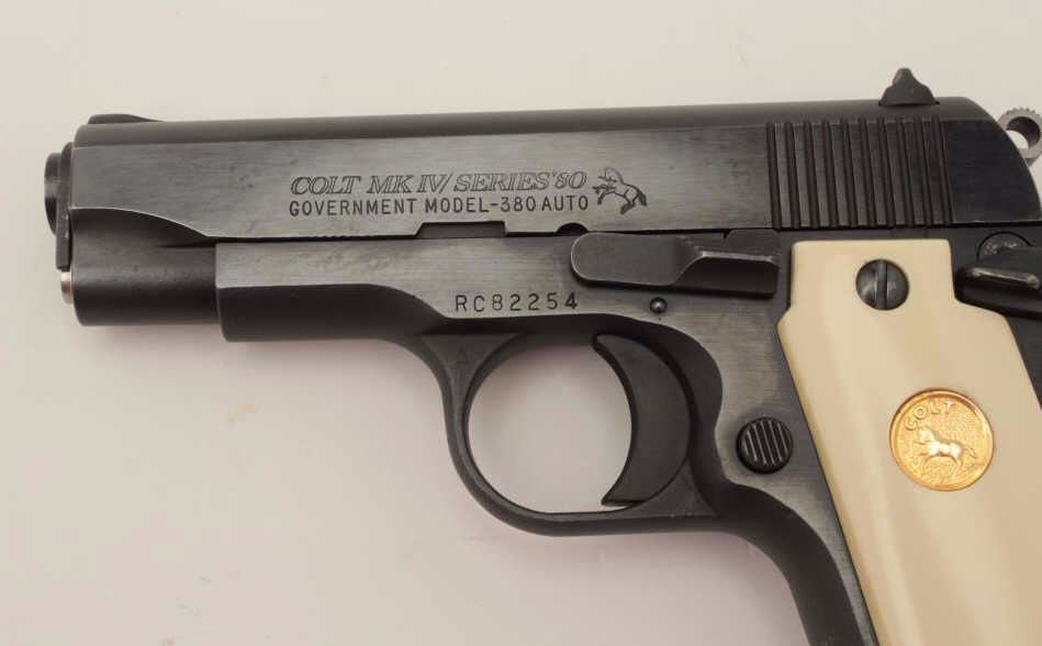 Colt Mark IV/Series 80 Government Model semi-automatic pistol, .380 Auto caliber, 3.5” barrel, blued finish, faux ivory medallion grips, S/N RC82254, accompanied by an extra magazine, extra checkered blackmedallion grips and several extra small parts. This gun is in overall excellent condition. (Modern/PPT). Est.: $600-$1,200.