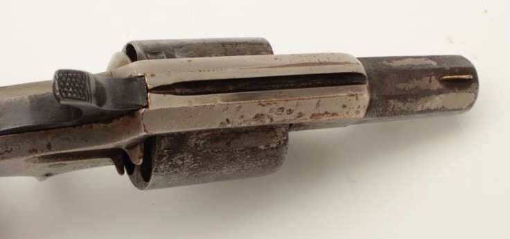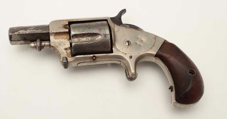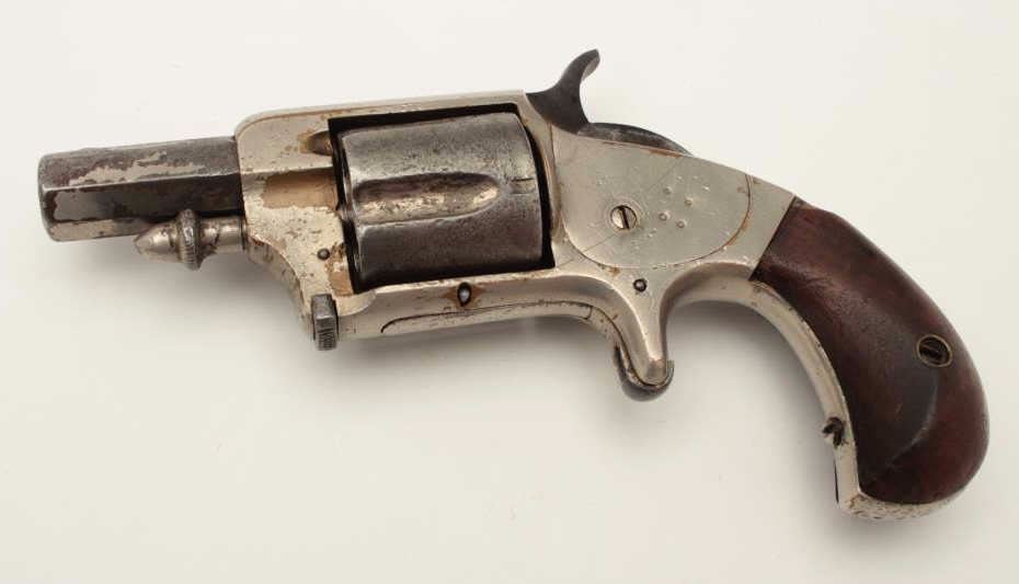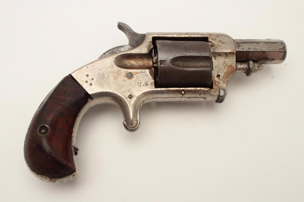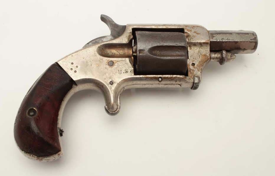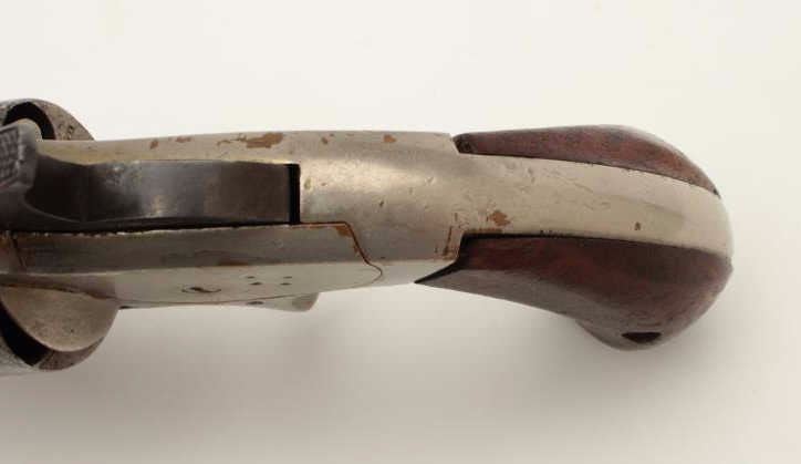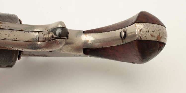 Whitney spur trigger .38 caliber revolver, 2” octagon barrel, nickel finish, rosewood grips, S/N 729, “U.S.” stamped on right side of frame (??); also 4 dots on each side of frame; intriguing; possible U.S. CartridgeCo. collection or Gov’t agency (like Secret Service?). Unknown significance; definitely an old marking but no attribution is found to date in available research. (Antique). From the Whitney family collection. Est.: $350-$700.