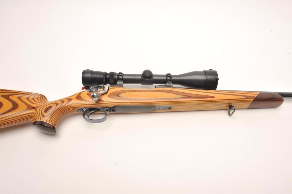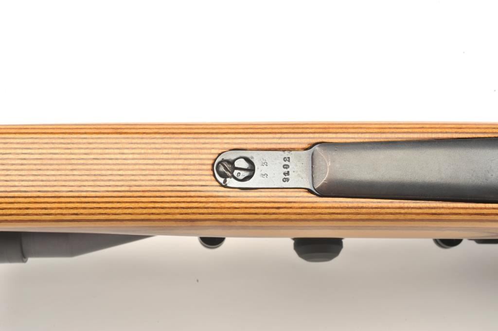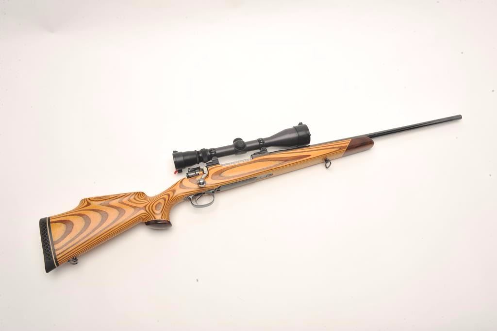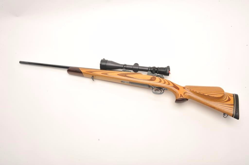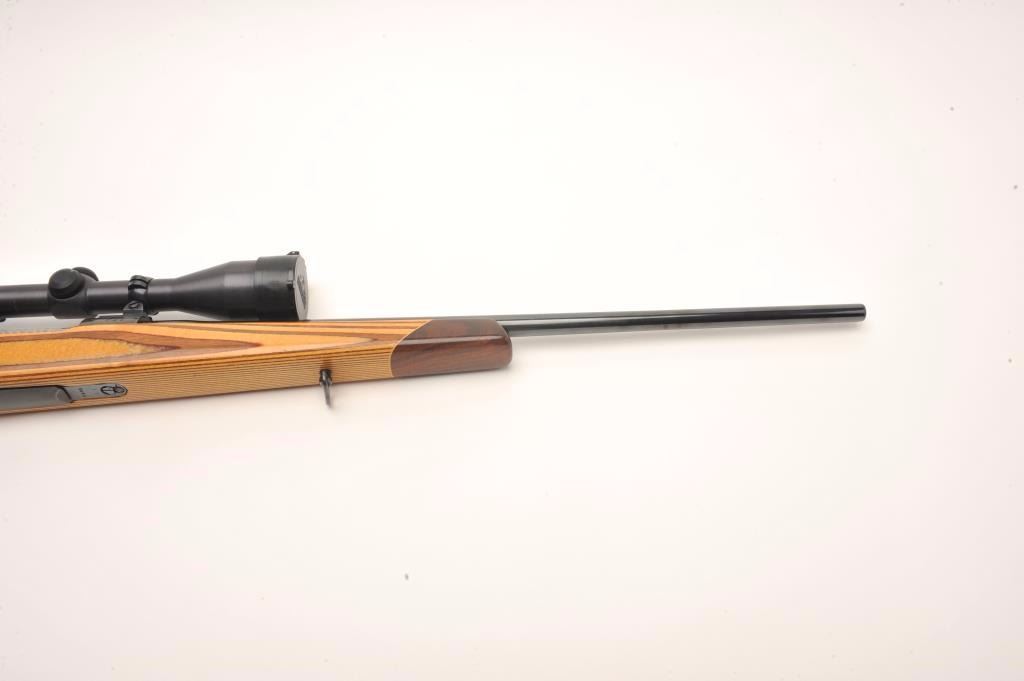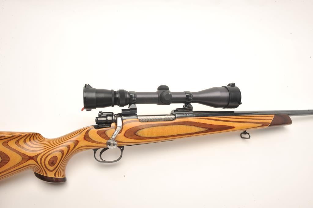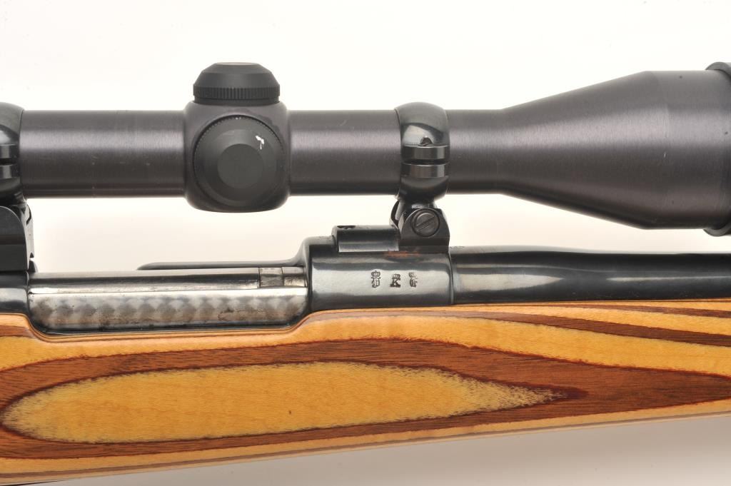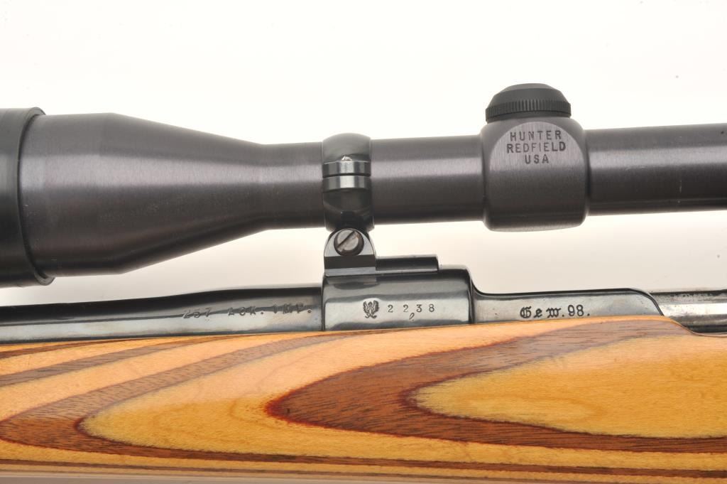 Custom German Gewehr 98 Mauser bolt action rifle, .257 Ackley Improved caliber, serial #2238L. The rifle is in good overall condition as customized. The rifle features a 22” barrel marked 257 ACK IMP with Germanproofs. The barrel and receiver retain the majority of an old, quality re-blue. The bolt handle has been replaced and the bolt has been engine turned. The smooth wood laminate stock is in very good condition with a California roll-over cheekpiece and exaggerated pistol grip. The butt stock ends with a ventilated rubber White Line recoil pad. The bore is good, the action crisp and markings are legible. The rifle is toppedwith two-piece scope mounts and a Redfield Hunter 3 x 9 variable power scope. A nice custom Mauser in a great Ackley caliber. (Modern) Est.: $600-$1,200.