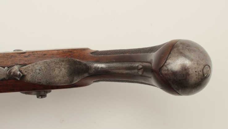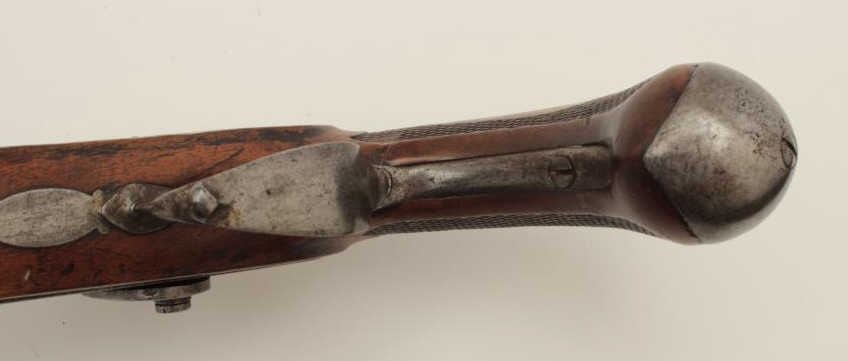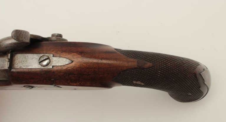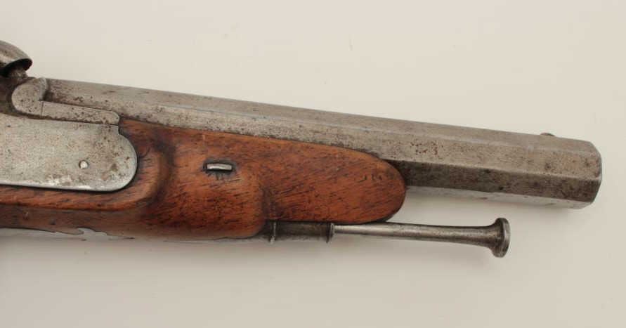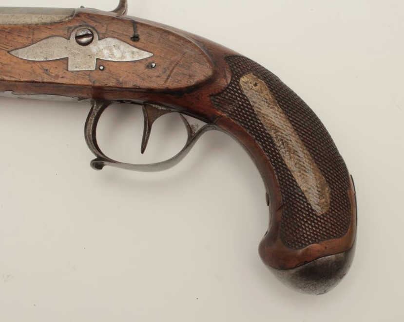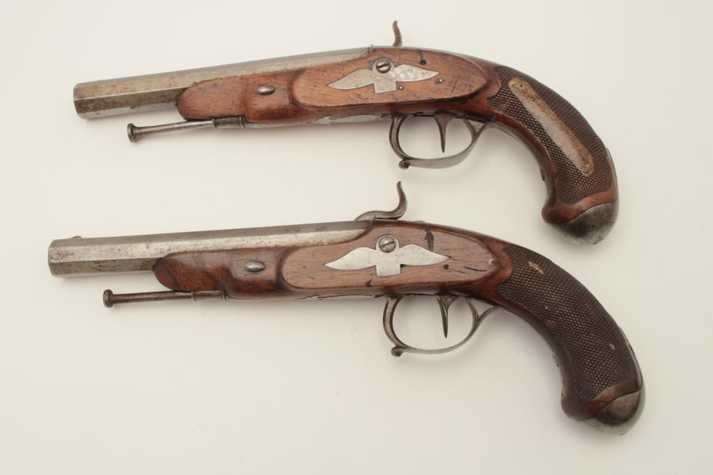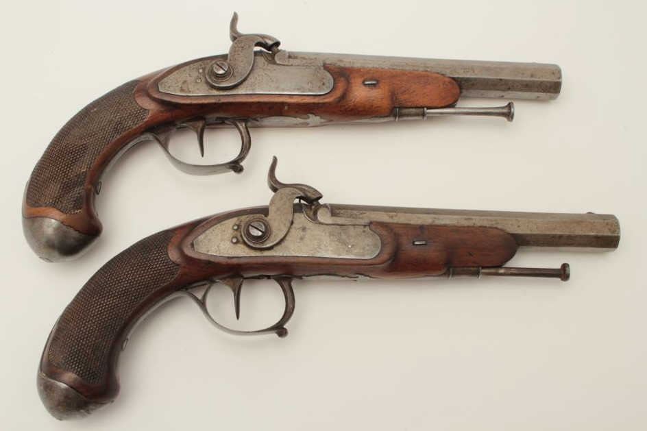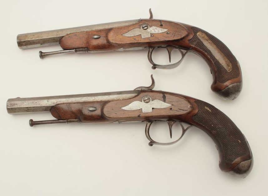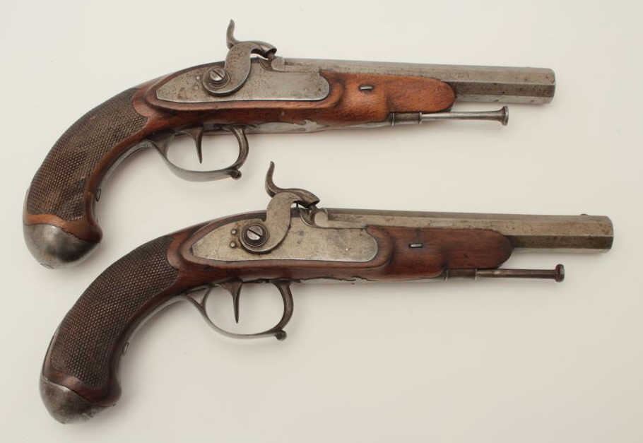 Pair of percussion French pistols, each approximately 13” overall with 7” barrels, checkered wood stocks with flared iron ramrods; both with crisp actions, no visible markings and good wood stocks.(Antique). Est.: $600-$1,200.