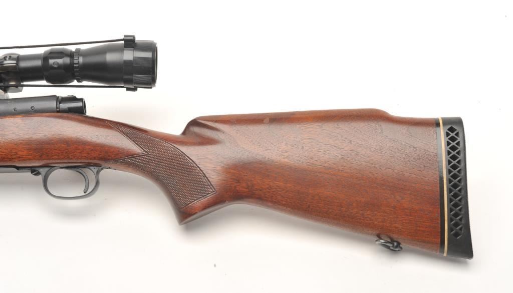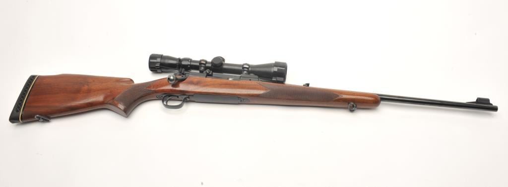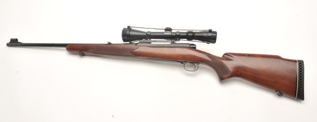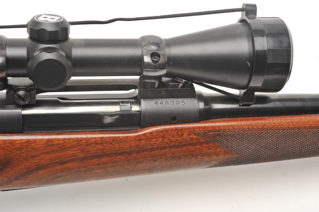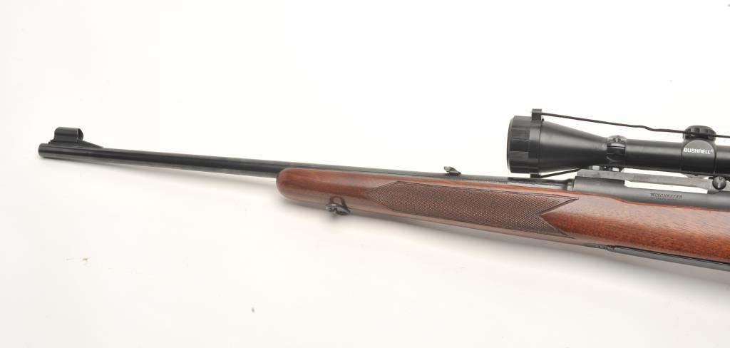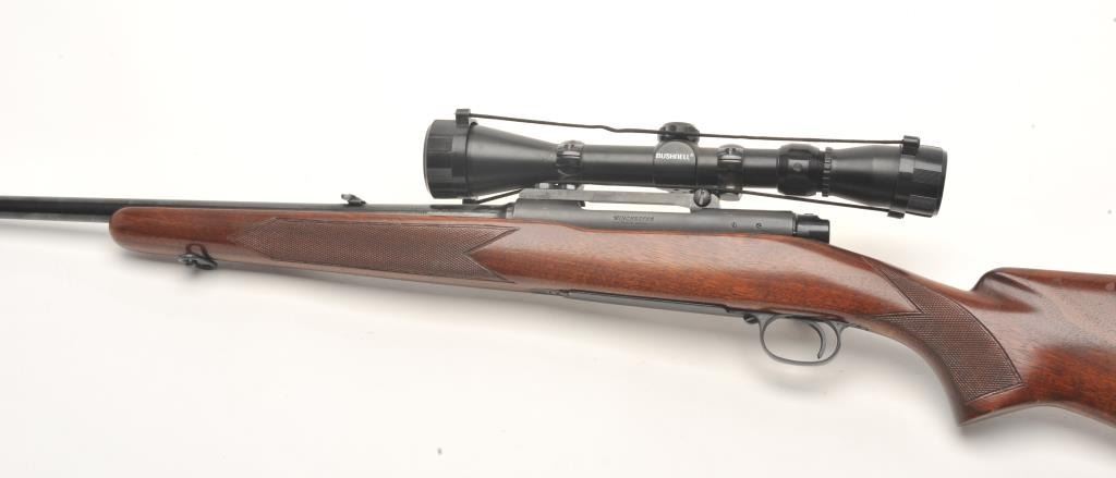 Pre-64 Winchester Model 70 Featherweight bolt action rifle, .30-06 SPRG caliber, 22” barrel, blued finish, checkered wood stock with added White Line butt pad, S/N 448395, mounted with a Bushnell adjustable scopedisplaying crisp optics. This rifle is in overall very good to near fine condition with the majority of its original finish, very good to fine bore, crisp action and markings and very good + stock. (C&R/PPT).Est.: $600-$1,200.