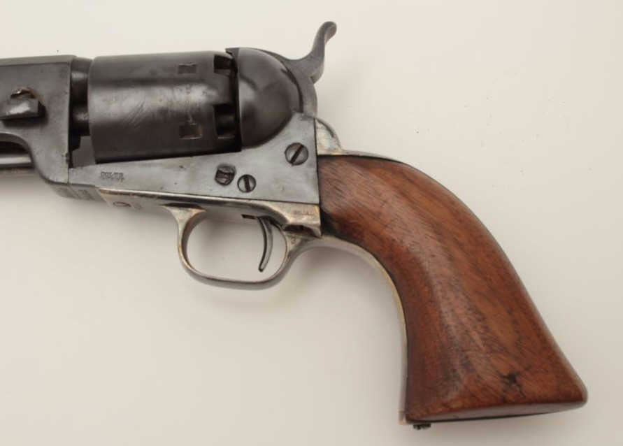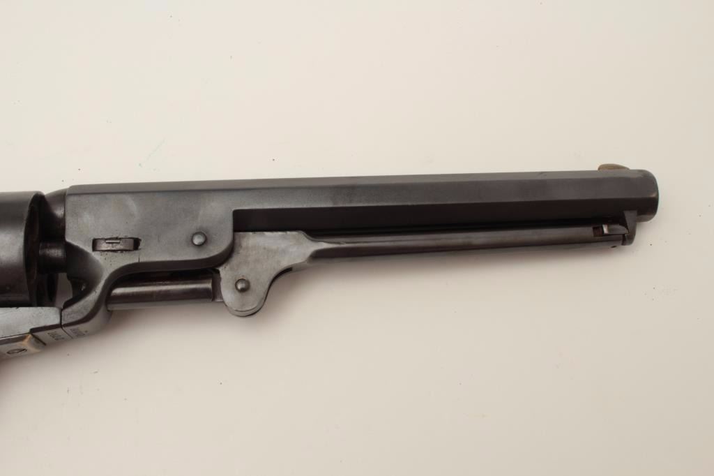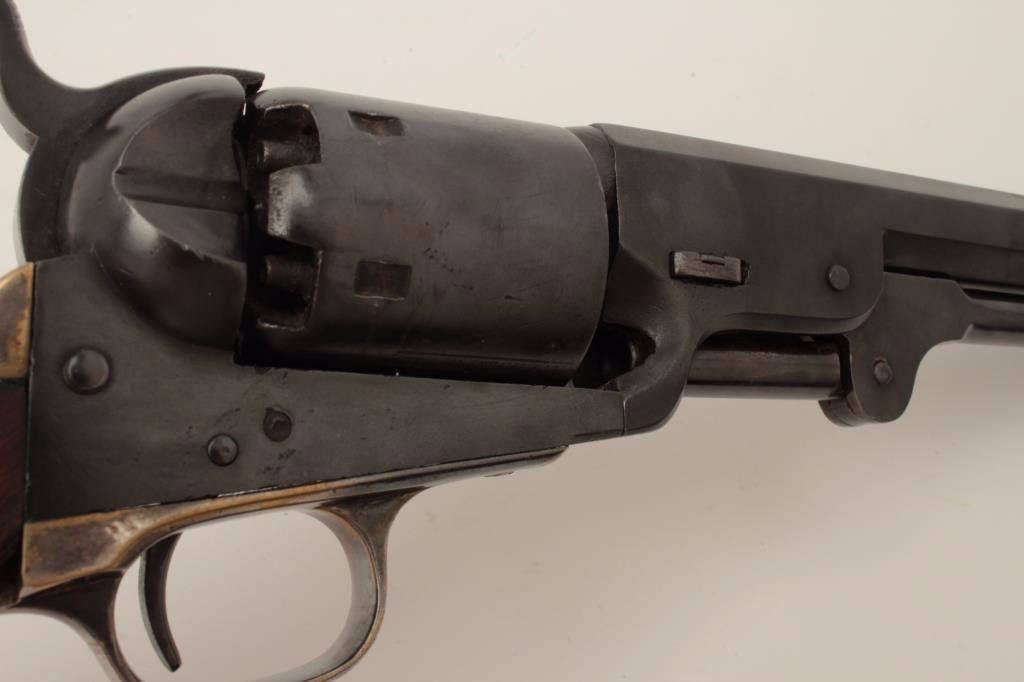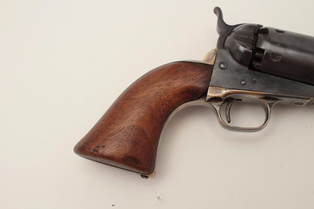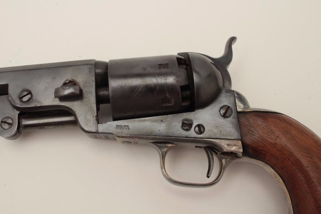 Colt Model 1851 Navy percussion revolver, .36 caliber, small guard, S/N 149141, re-blued finish, unusual in that this gun has a capping groove and late features but is an early small guard; S/Ns appear correct.(Antique). Est.: $500-$1,000.