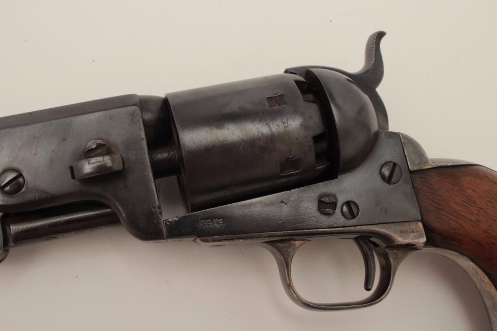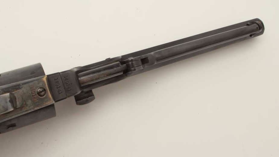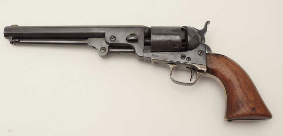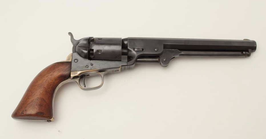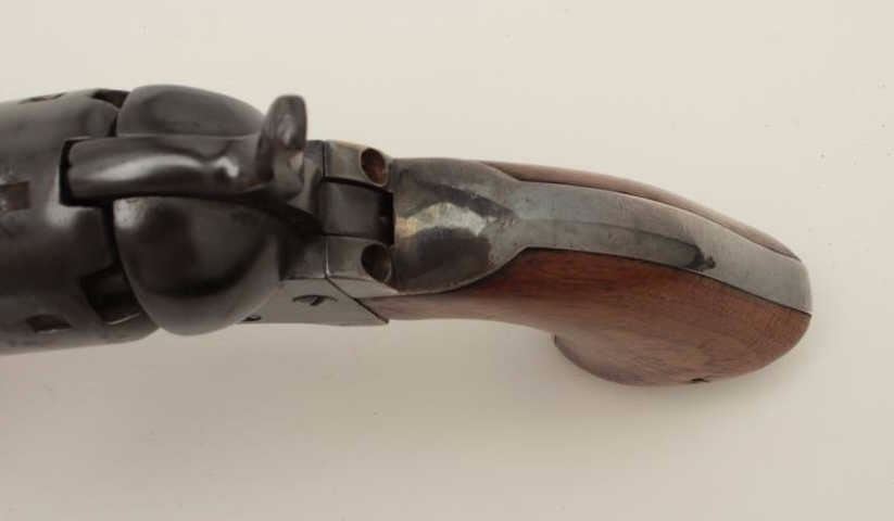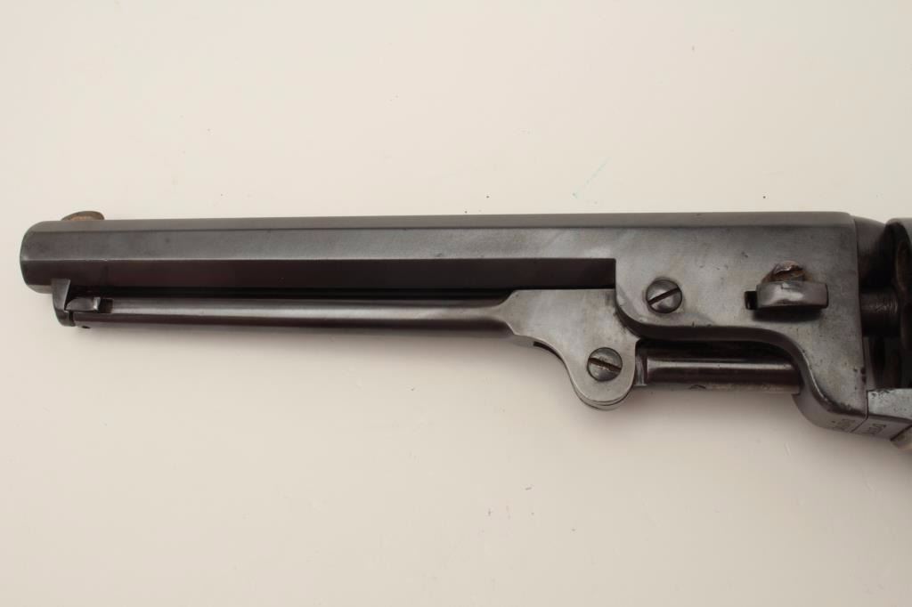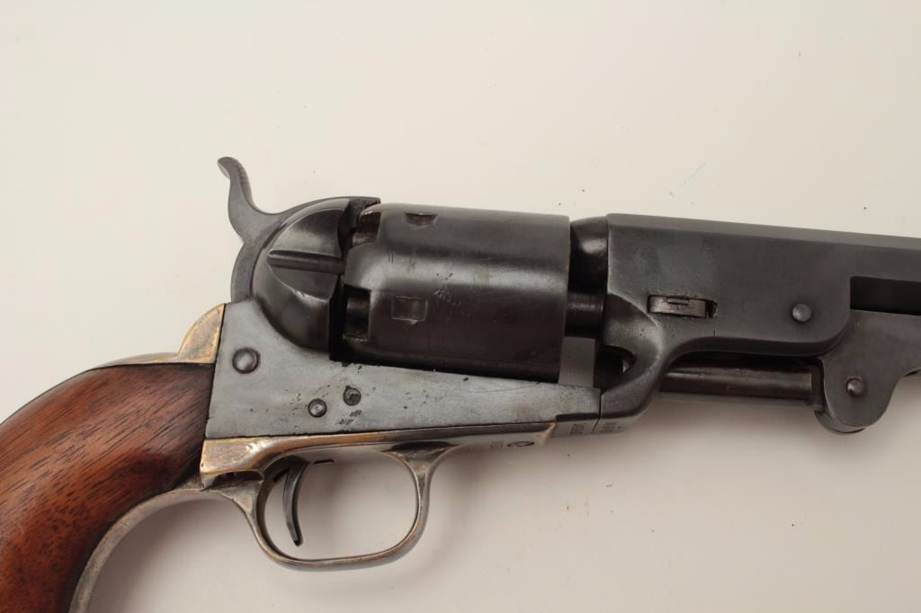 Colt Model 1851 Navy percussion revolver, .36 caliber, small guard, S/N 149141, re-blued finish, unusual in that this gun has a capping groove and late features but is an early small guard; S/Ns appear correct.(Antique). Est.: $500-$1,000.
