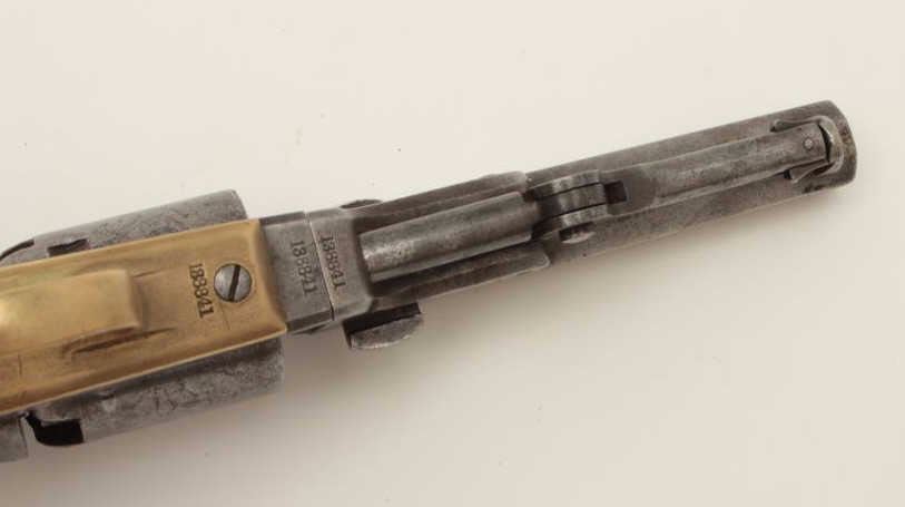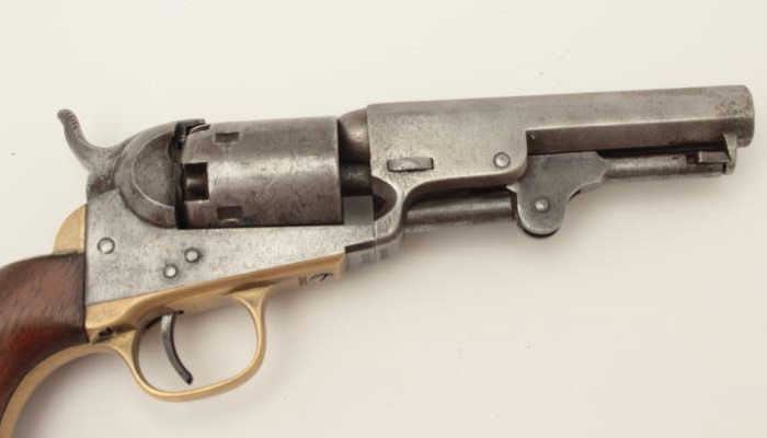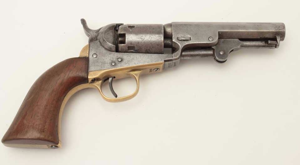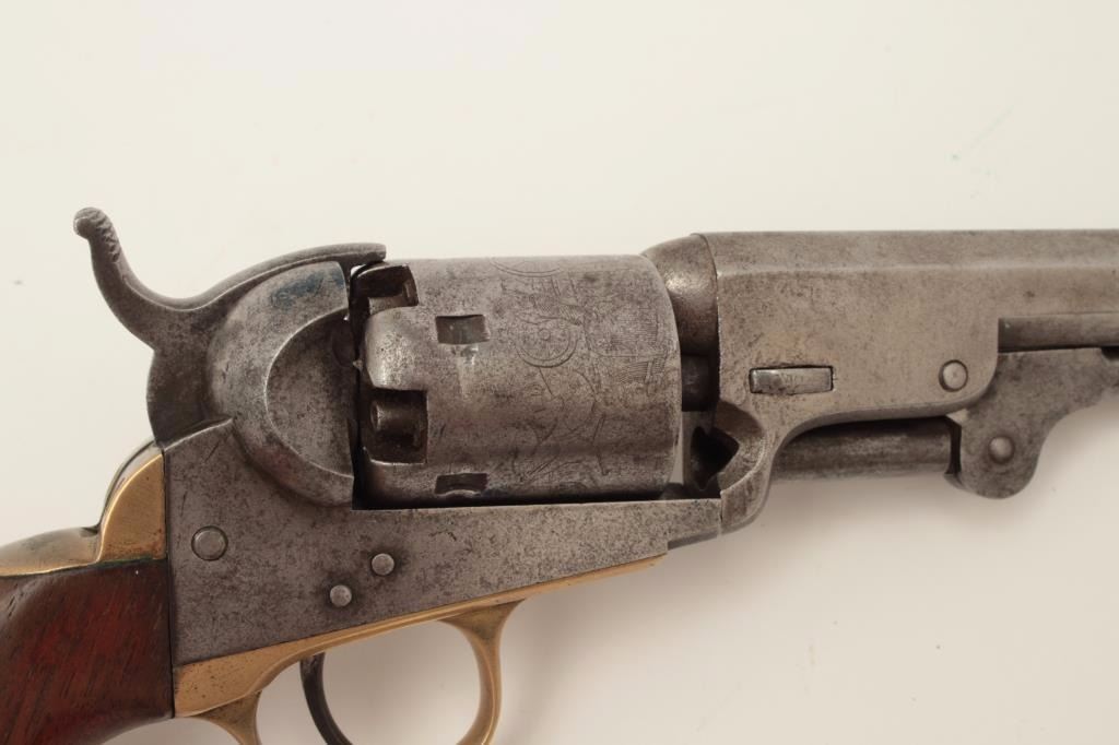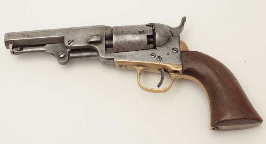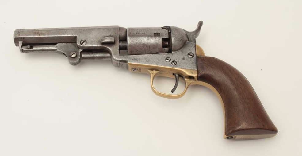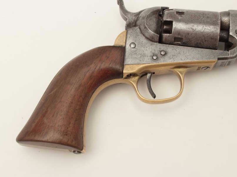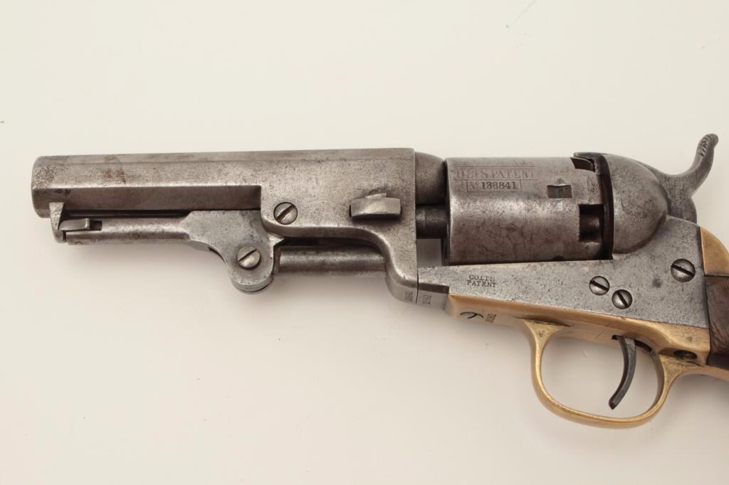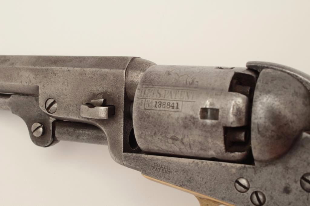 Colt Pocket Model 1849 percussion revolver, .31 caliber, 4” octagon barrel, wood grips, S/N 138841 (all matching visible numbers including wedge); 5-shot, 2-line N.Y. address, good to very good overall withconsiderable cylinder scene, good action and grips. (Antique). Est.: $500-$1,000.