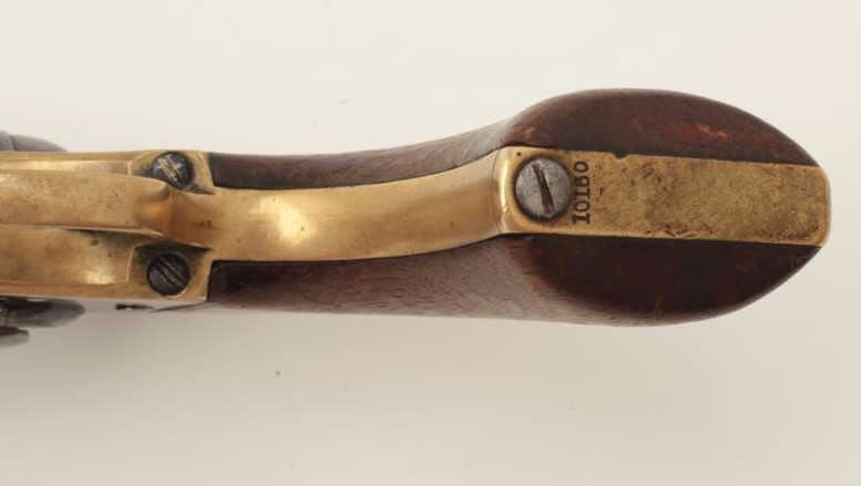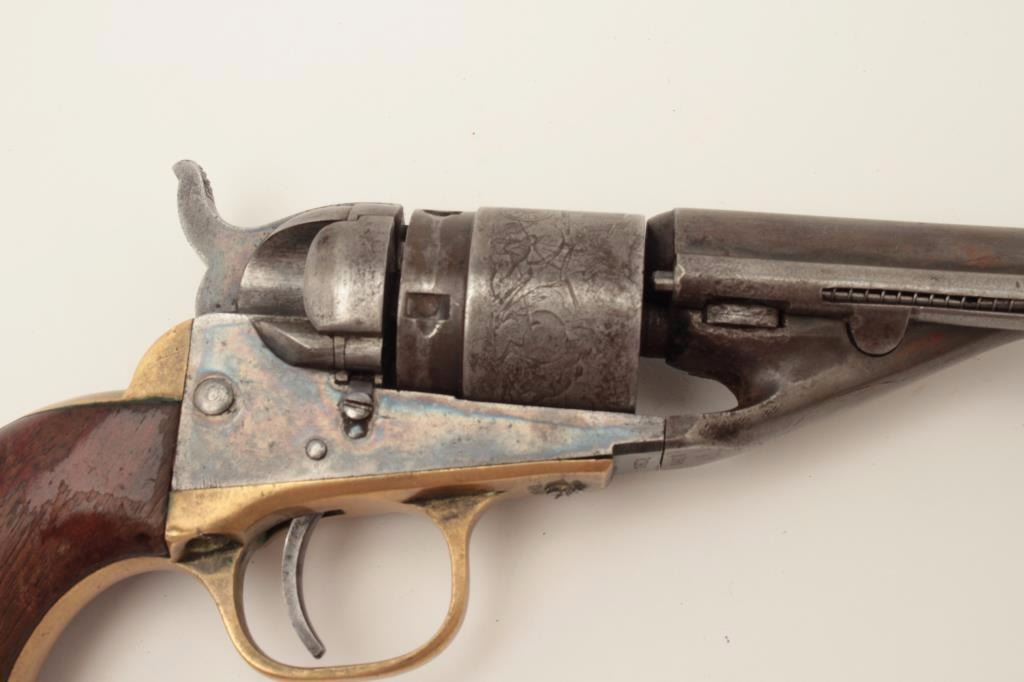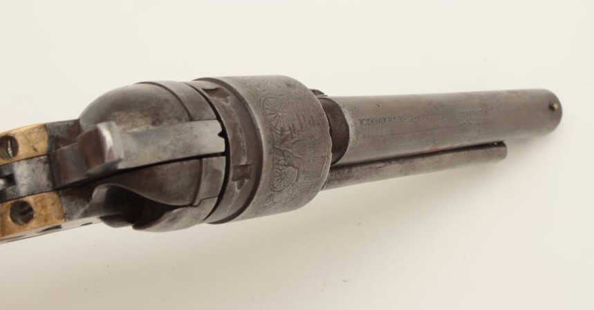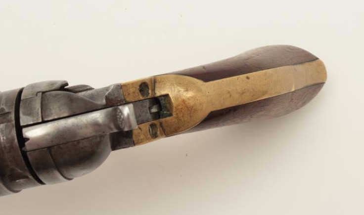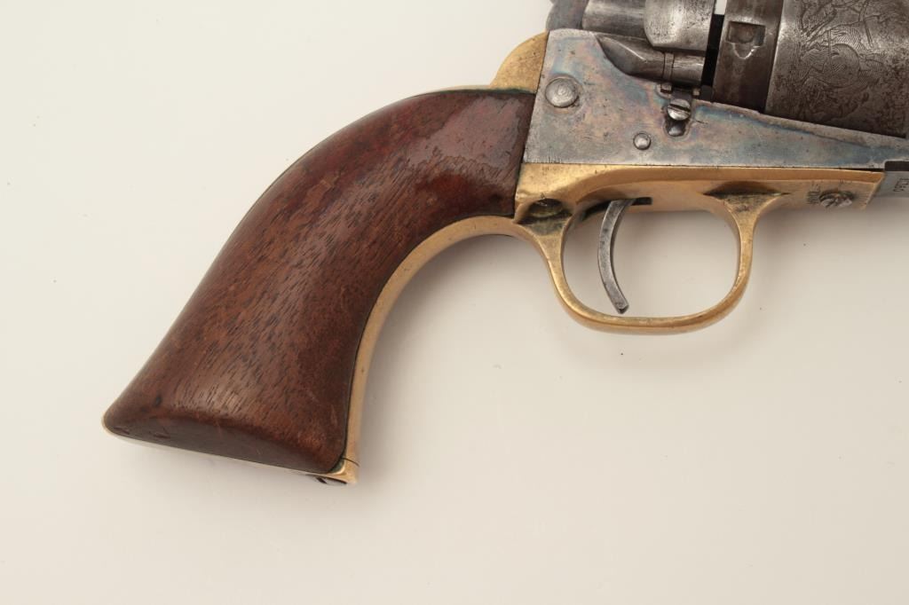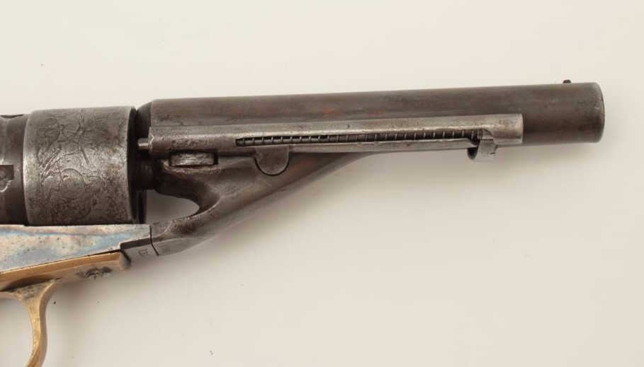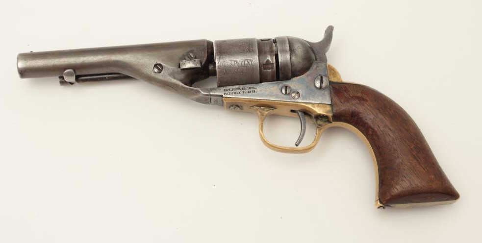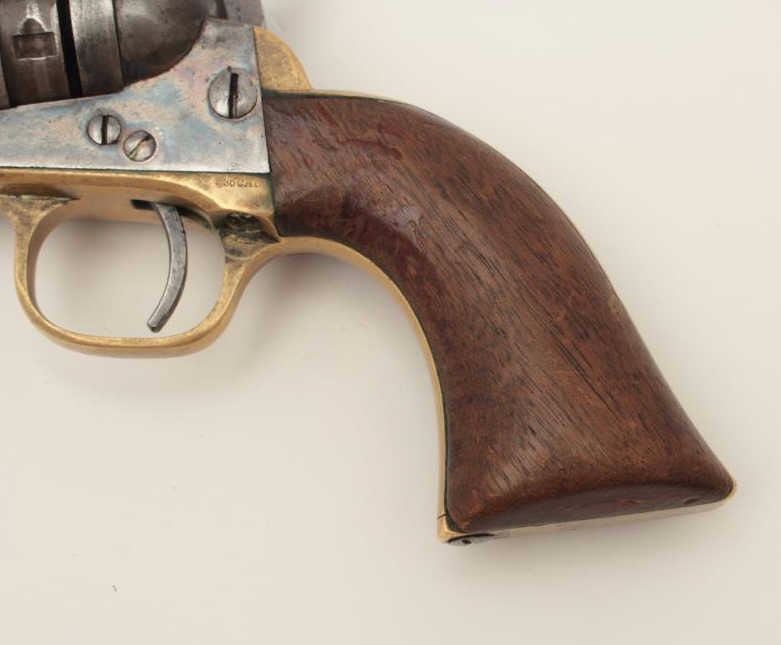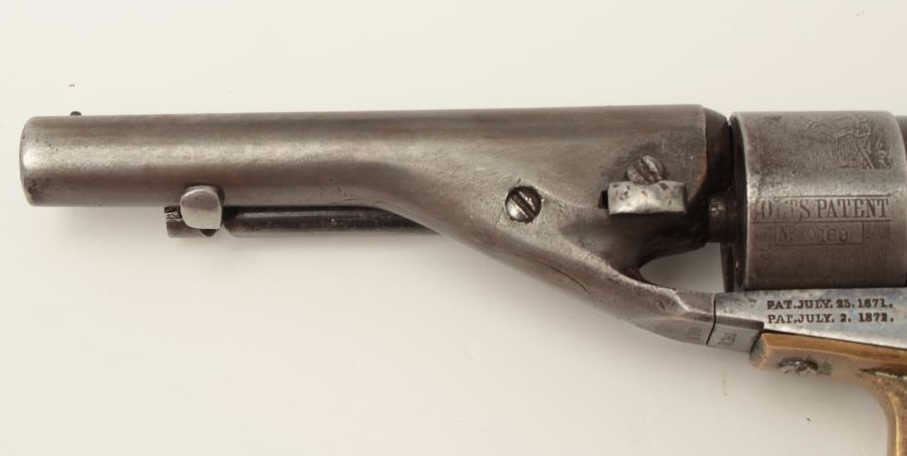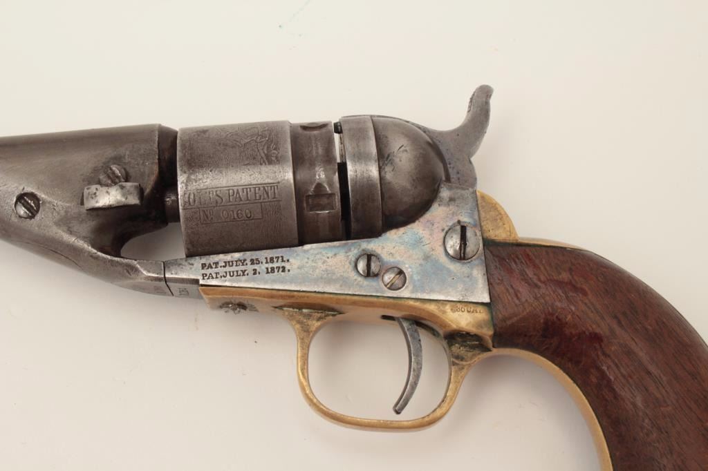 Colt Conversion of a Pocket Navy revolver with ejector, .38RF caliber, 4.5” barrel, wood grips, S/N 10160 (all visible matching, un-numbered wedge), traces of blue and case colors, majority of cylinder scene, crispaction. (Antique). Est.: $600-$1,200.