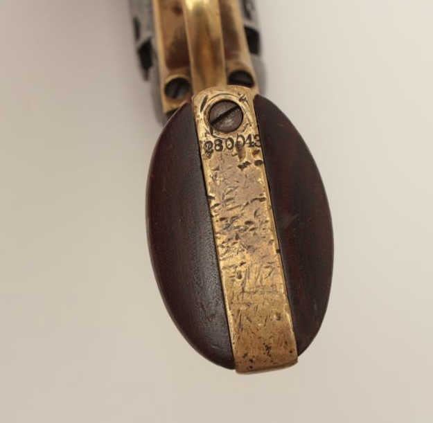 Colt Pocket Model 1849 percussion revolver, .31 caliber, 5” barrel, one-line N.Y. address, 6-shot cylinder, wood grips, good to very good condition with traces of finish; marks on cylinder, nice grips, S/N 280043(all matching visible #s). (Antique). Est.: $600-$1,200.