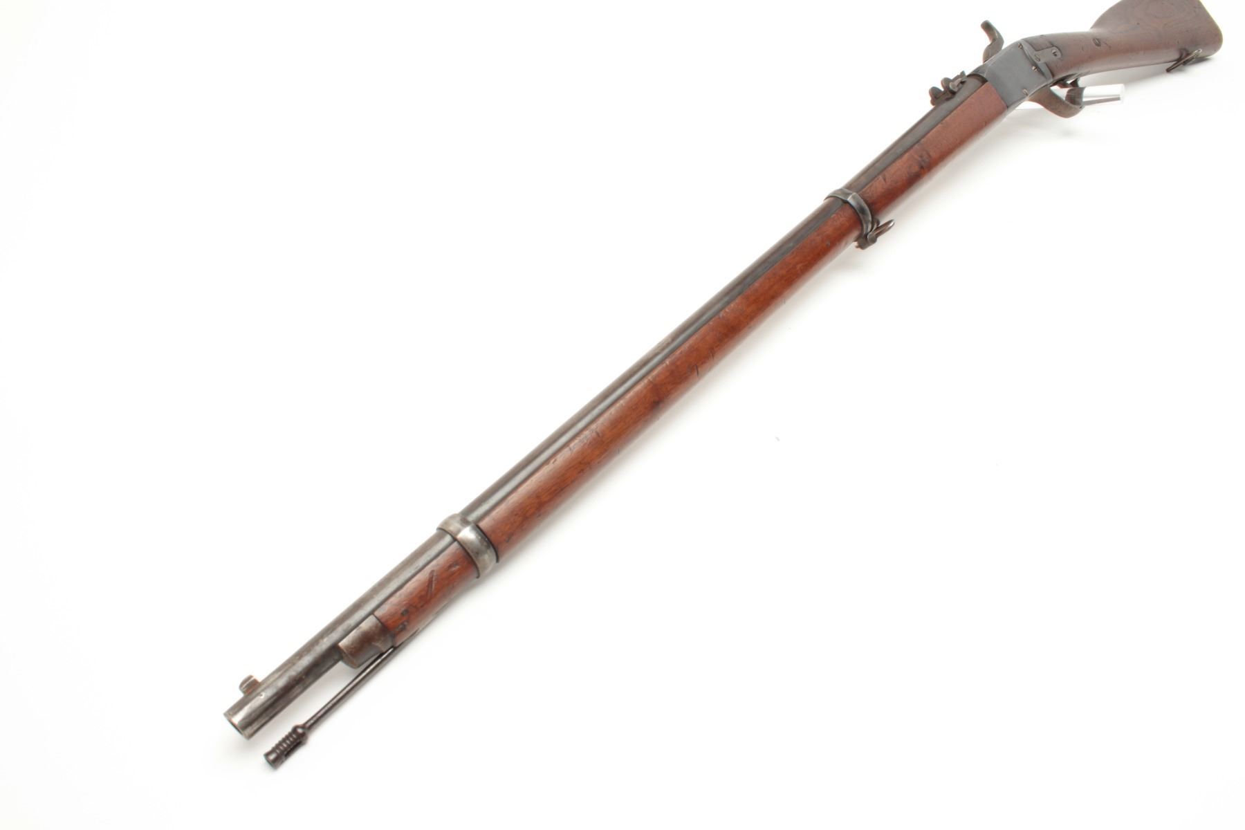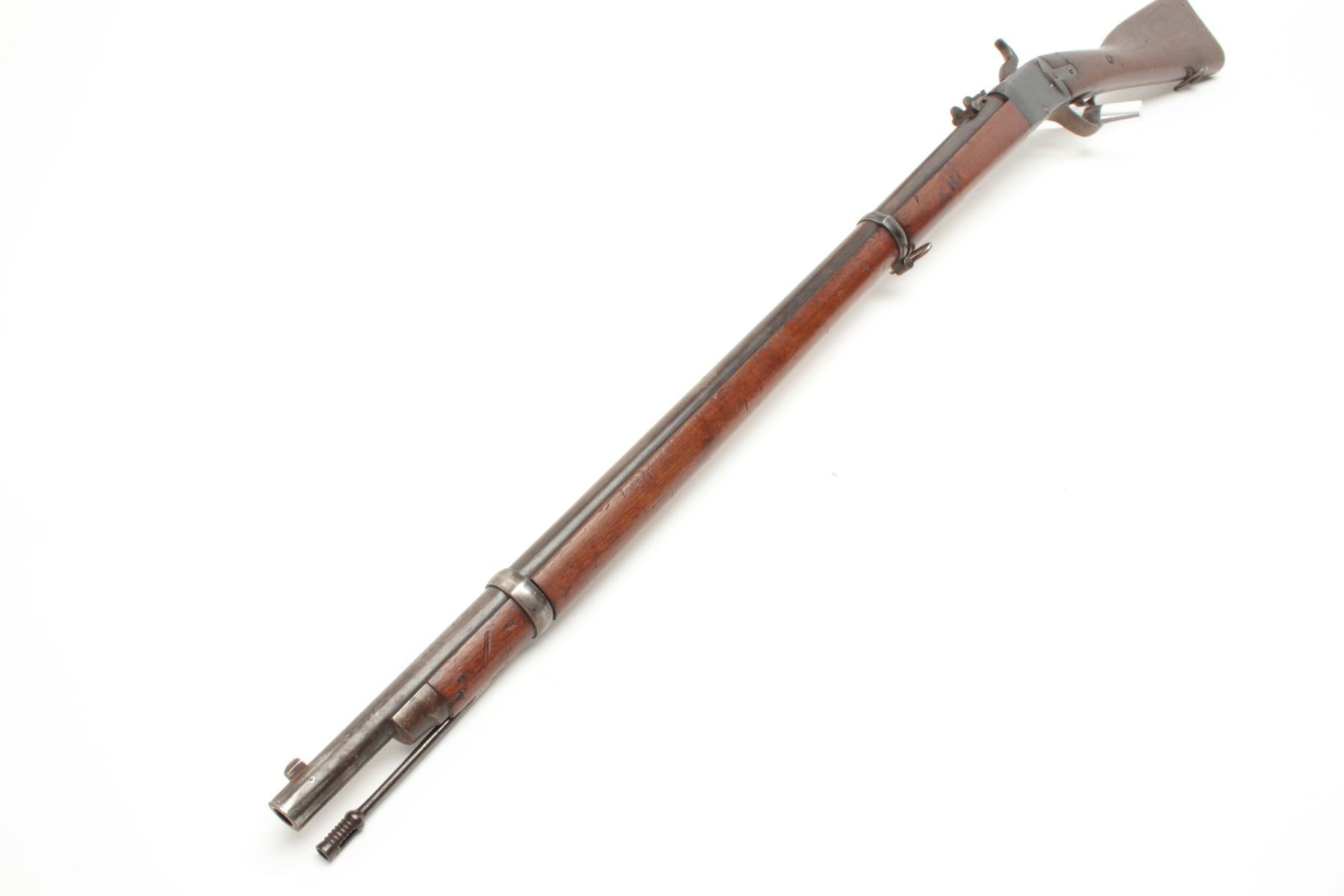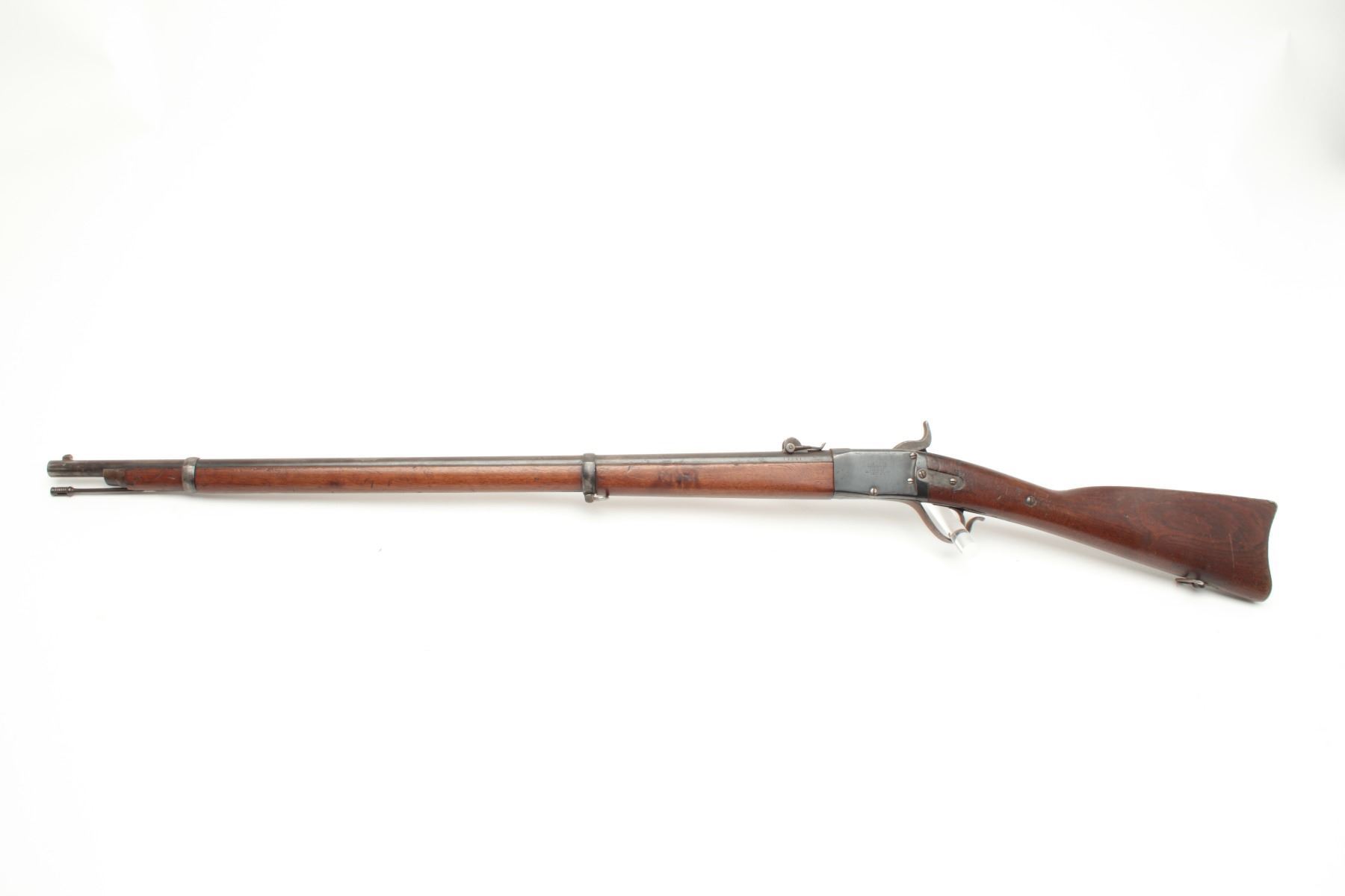 Peabody musket for foreign military contract, 32.5” round barrel, blued finish, wood stocks, iron cleaning rod, S/N 14241, in overall good to very good condition displaying considerable blued finish, crispaction and markings, bore may clean to good, overall good wood stocks with a small old chip to the right front of the butt stock’s wrist below the hammer area and some scattered old mars and scratches from carryand storage; two proofs visible; one on right side of butt stock (cross over “M”) and one behind the rear barrel band on the right side (cross over “V”). (Antique). Est.: $600-$1,200.