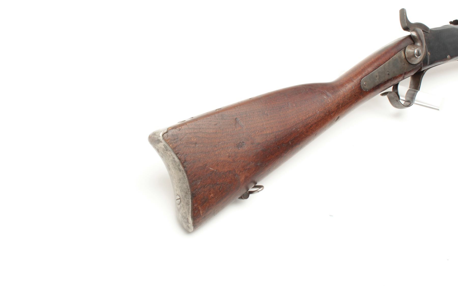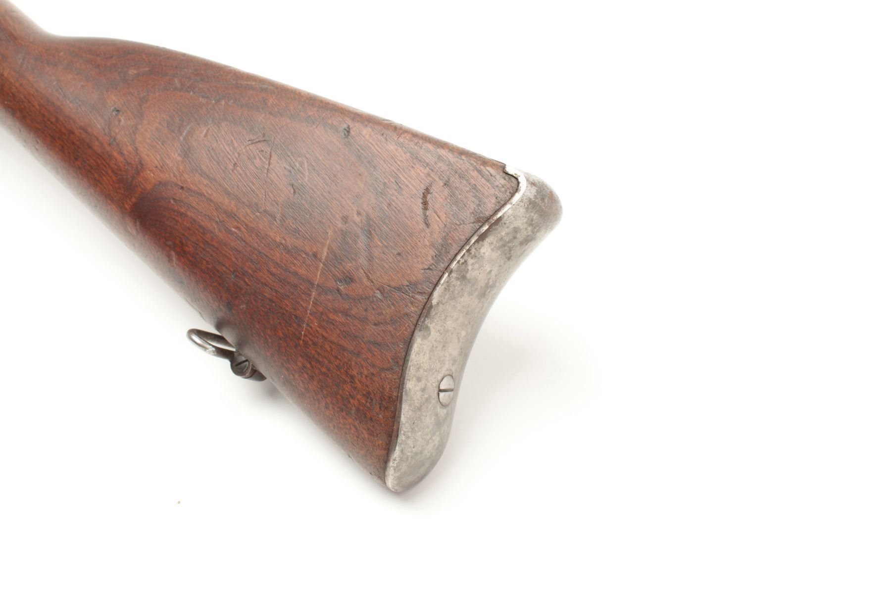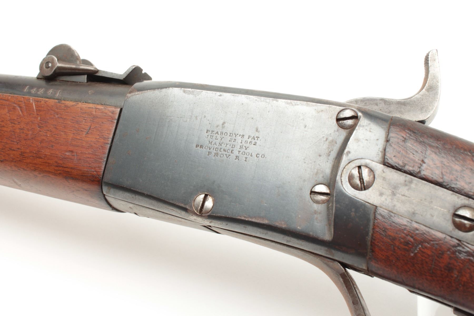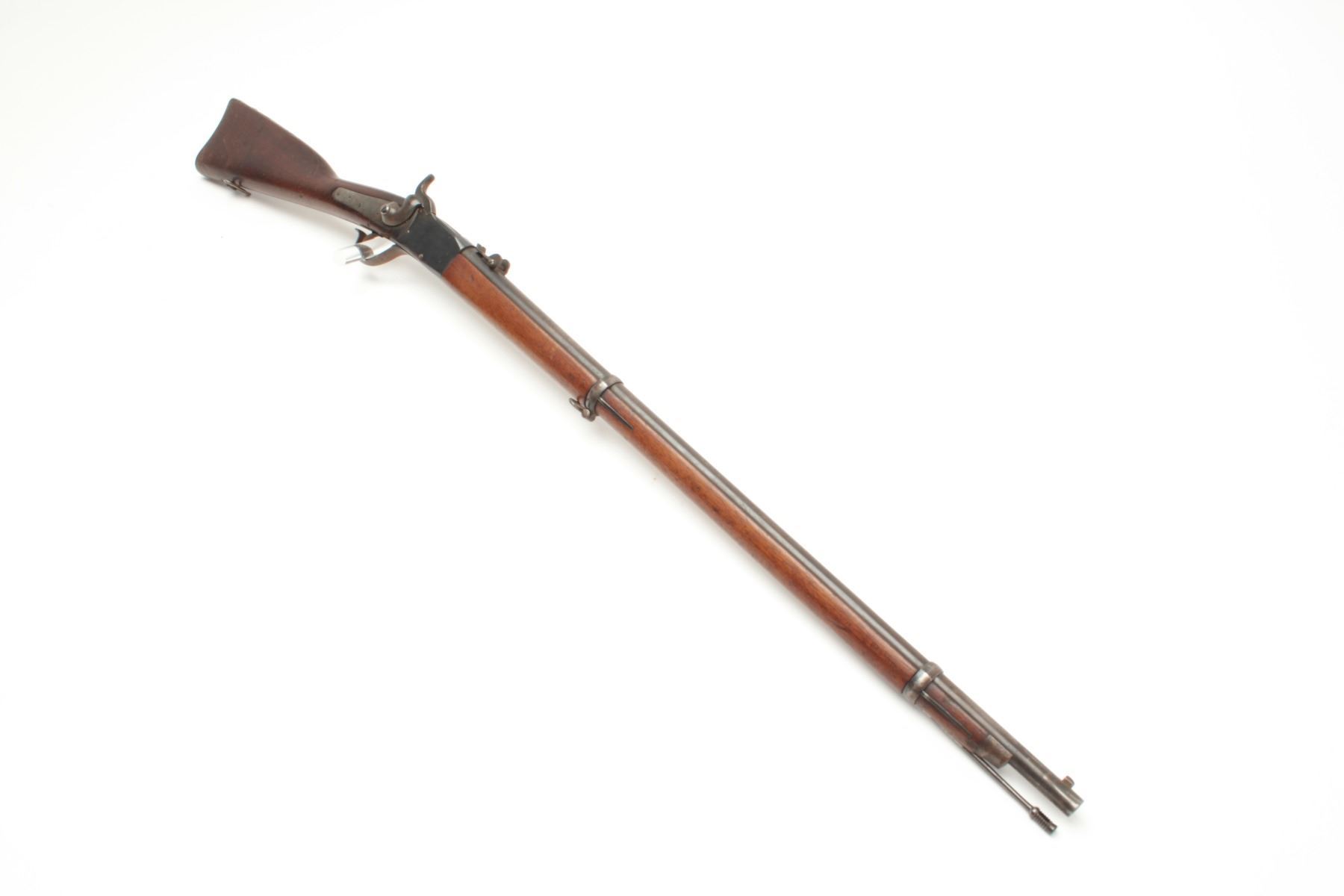 Peabody musket for foreign military contract, 32.5” round barrel, blued finish, wood stocks, iron cleaning rod, S/N 14241, in overall good to very good condition displaying considerable blued finish, crispaction and markings, bore may clean to good, overall good wood stocks with a small old chip to the right front of the butt stock’s wrist below the hammer area and some scattered old mars and scratches from carryand storage; two proofs visible; one on right side of butt stock (cross over “M”) and one behind the rear barrel band on the right side (cross over “V”). (Antique). Est.: $600-$1,200.