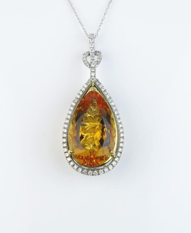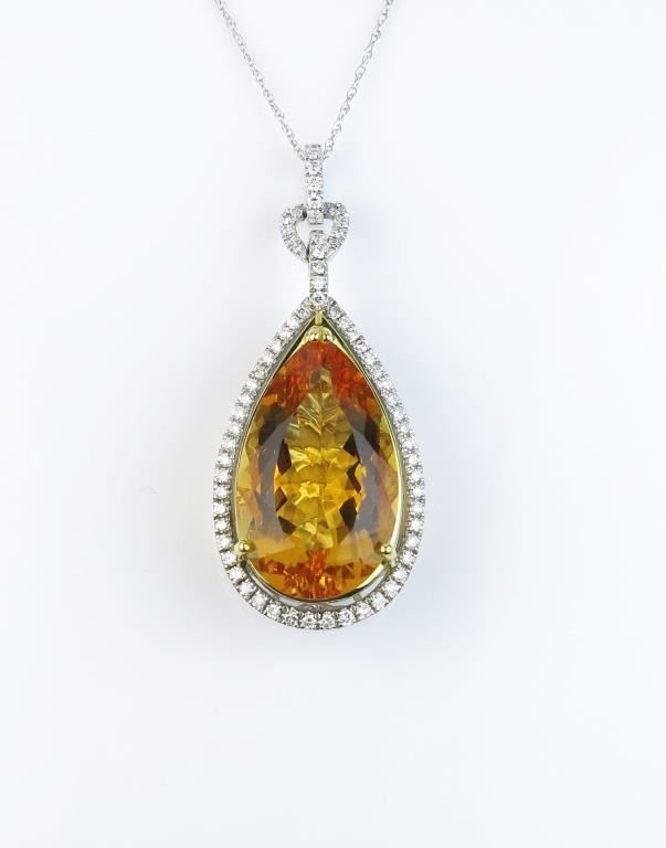 Gorgeous ladies necklace featuring a large Pear shape Citrine weighing approx. 20.00 carats and micro set with over 70 round diamonds weighing approx. 0.80 carats of F-G colors and VS/SI clarity set in a laborintensive 14 karat white gold setting. Retail $4,000-$6,000 Estimates $3,000-$4,000 Nice