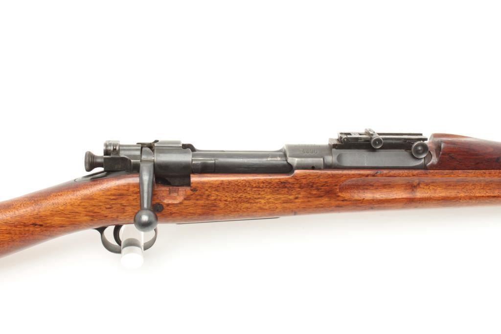 Early U.S. Springfield Model 1903 bolt action rifle, .30-06 caliber, 24” barrel dated 8-09, military blued finish, wood stock, S/N 4396, in overall very good to near fine condition with a fine bore, crisp action,sharp markings and very good wood displaying circle P proof and inspector’s cartouche; old hairline cracks in butt stock that appears still solid; a 4-digit ’03 that should be further researched. (C&R). Est.:$750-$1,500.