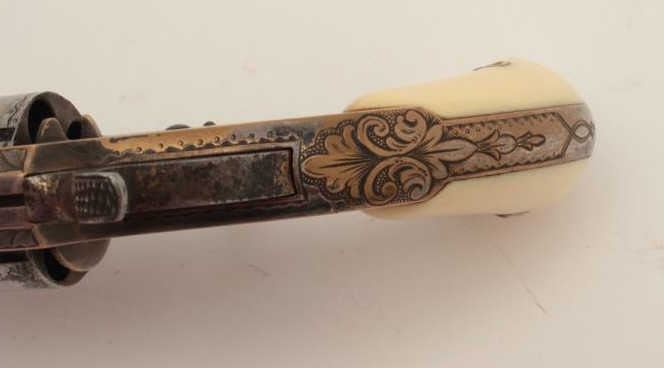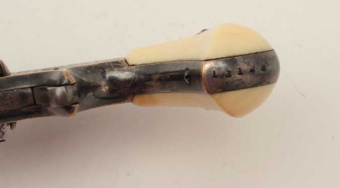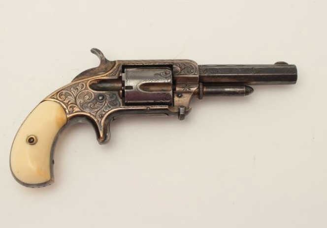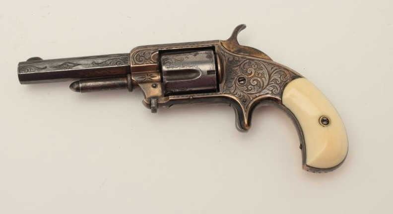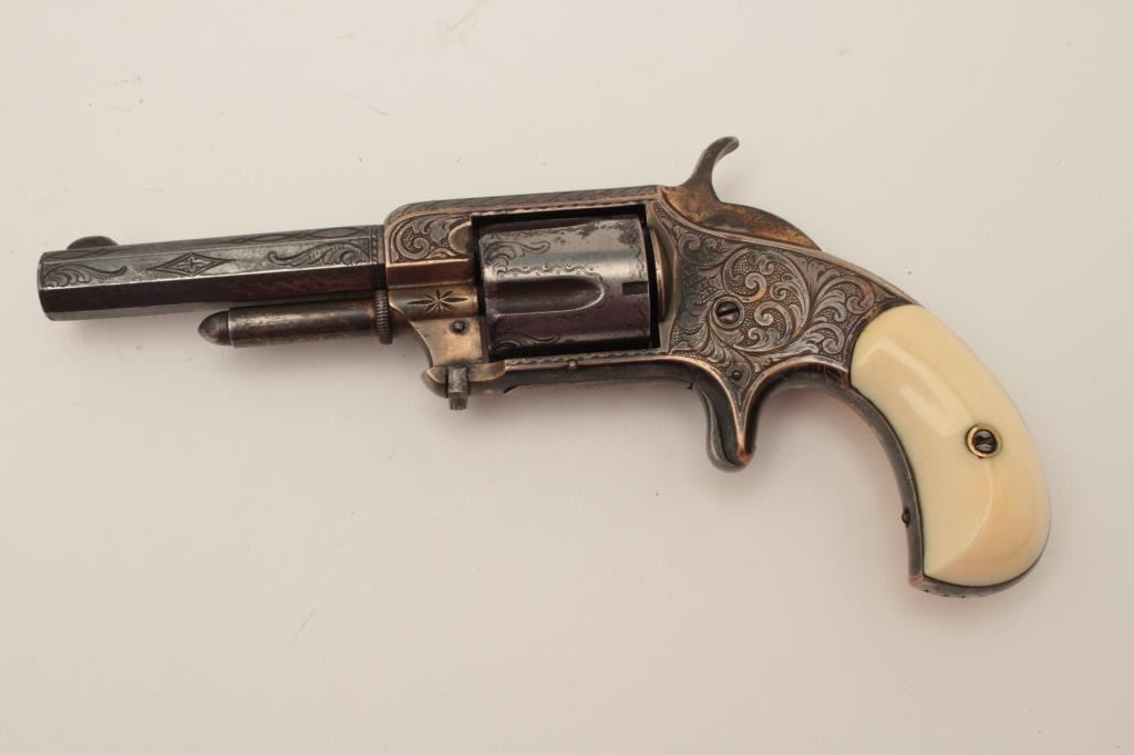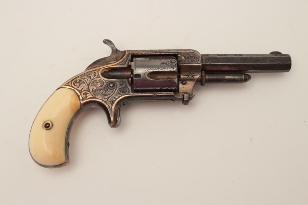 Whitneyville 5-shot .32 caliber spur trigger revolver, 3.25” barrel, nickel, fully deluxe N.Y engraved in Nimschke style, ivory grips, S/N 13128, in overall very good condition. (Antique). From the Whitney familycollection. Est.: $600-$1,200.