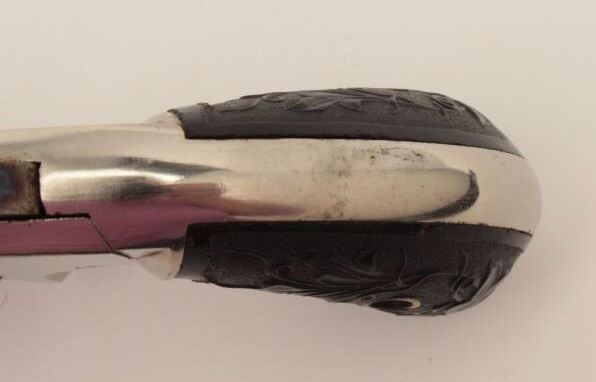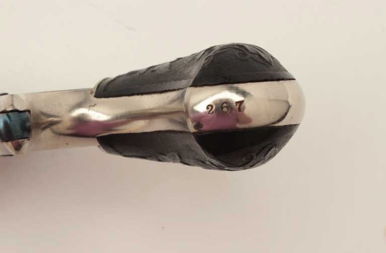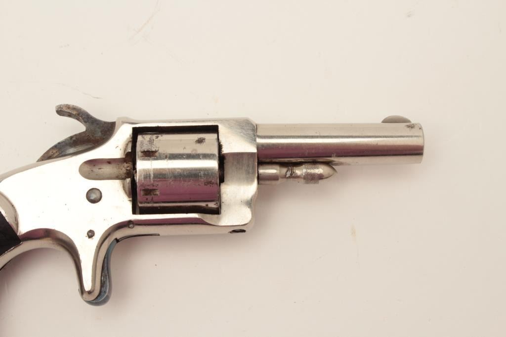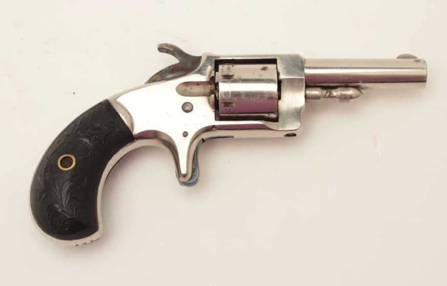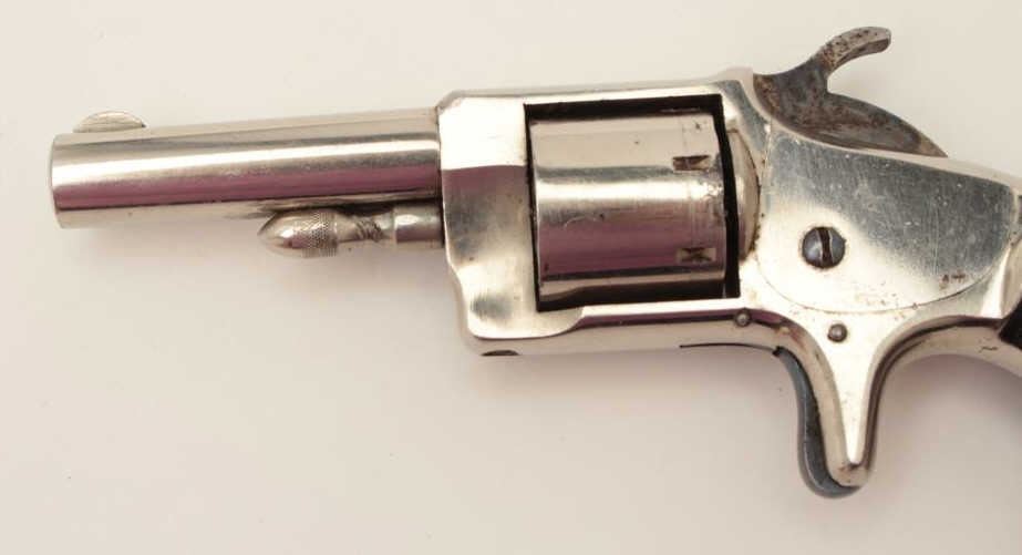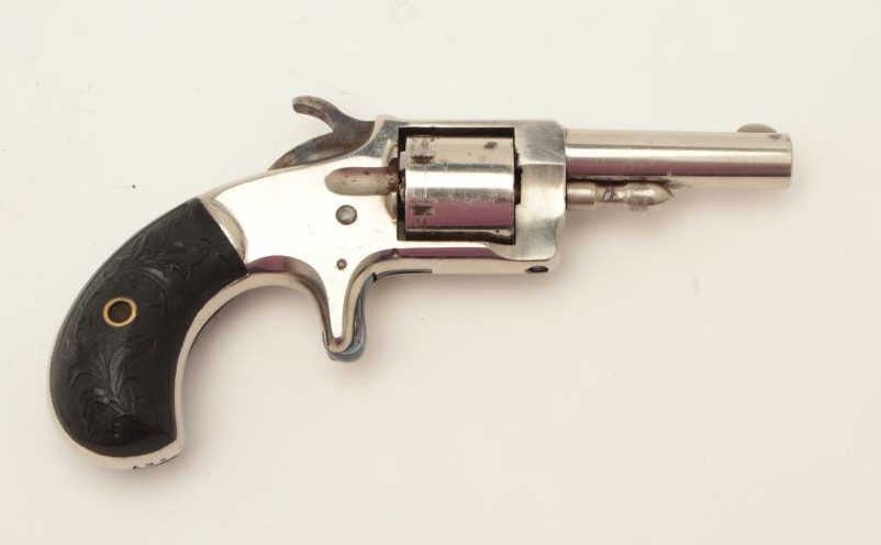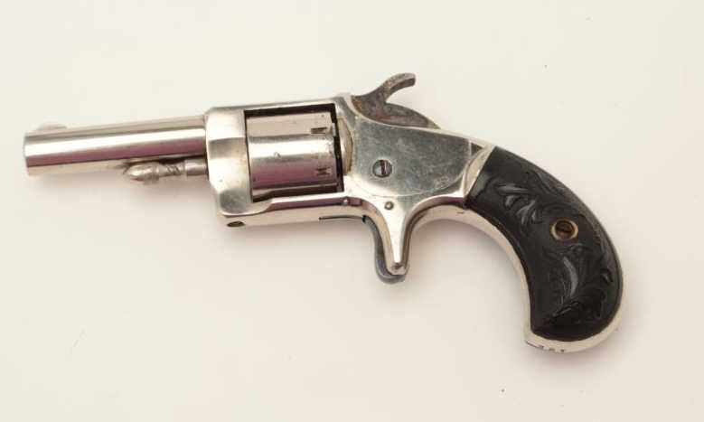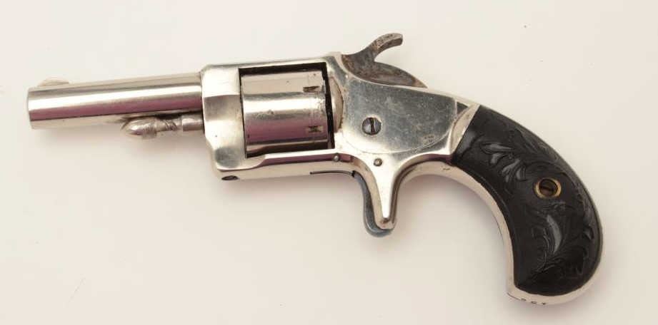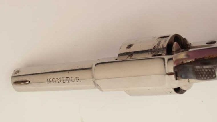 Monitor spur trigger revolver by Whitney, .22 caliber spur trigger revolver, 2.25” round barrel, nickel finish, fancy floral plastic grips (only known), S/N 267, in overall fine condition. (Antique). From the Whitneyfamily collection. Est.: $500-$1,000.